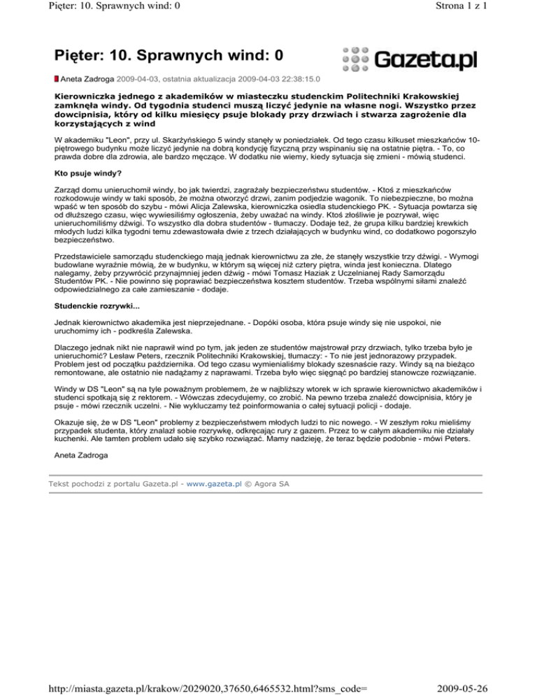 Pięter: 10. Sprawnych wind: 0 Strona 1 z 1 Pięter: 10. Sprawnych wind: 0 Aneta Zadroga 2009-04-03, ostatnia aktualizacja 2009-04-03 22:38:15.0 Kierowniczka jednego z akademików w miasteczku studenckim Politechniki Krakowskiej zamknęła windy. Od tygodnia studenci muszą liczyć jedynie na własne nogi. Wszystko przez dowcipnisia, który od kilku miesięcy psuje blokady przy drzwiach i stwarza zagroŜenie dla korzystających z wind W akademiku "Leon", przy ul. SkarŜyńskiego 5 windy stanęły w poniedziałek. Od tego czasu kilkuset mieszkańców 10piętrowego budynku moŜe liczyć jedynie na dobrą kondycję fizyczną przy wspinaniu się na ostatnie piętra. - To, co prawda dobre dla zdrowia, ale bardzo męczące. W dodatku nie wiemy, kiedy sytuacja się zmieni - mówią studenci. Kto psuje windy? Zarząd domu unieruchomił windy, bo jak twierdzi, zagraŜały bezpieczeństwu studentów. - Ktoś z mieszkańców rozkodowuje windy w taki sposób, Ŝe moŜna otworzyć drzwi, zanim podjedzie wagonik. To niebezpieczne, bo moŜna wpaść w ten sposób do szybu - mówi Alicja Zalewska, kierowniczka osiedla studenckiego PK. - Sytuacja powtarza się od dłuŜszego czasu, więc wywiesiliśmy ogłoszenia, Ŝeby uwaŜać na windy. Ktoś złośliwie je pozrywał, więc unieruchomiliśmy dźwigi. To wszystko dla dobra studentów - tłumaczy. Dodaje teŜ, Ŝe grupa kilku bardziej krewkich młodych ludzi kilka tygodni temu zdewastowała dwie z trzech działających w budynku wind, co dodatkowo pogorszyło bezpieczeństwo. Przedstawiciele samorządu studenckiego mają jednak kierownictwu za złe, Ŝe stanęły wszystkie trzy dźwigi. - Wymogi budowlane wyraźnie mówią, Ŝe w budynku, w którym są więcej niŜ cztery piętra, winda jest konieczna. Dlatego nalegamy, Ŝeby przywrócić przynajmniej jeden dźwig - mówi Tomasz Haziak z Uczelnianej Rady Samorządu Studentów PK. - Nie powinno się poprawiać bezpieczeństwa kosztem studentów. Trzeba wspólnymi siłami znaleźć odpowiedzialnego za całe zamieszanie - dodaje. Studenckie rozrywki... Jednak kierownictwo akademika jest nieprzejednane. - Dopóki osoba, która psuje windy się nie uspokoi, nie uruchomimy ich - podkreśla Zalewska. Dlaczego jednak nikt nie naprawił wind po tym, jak jeden ze studentów majstrował przy drzwiach, tylko trzeba było je unieruchomić? Lesław Peters, rzecznik Politechniki Krakowskiej, tłumaczy: - To nie jest jednorazowy przypadek. Problem jest od początku października. Od tego czasu wymienialiśmy blokady szesnaście razy. Windy są na bieŜąco remontowane, ale ostatnio nie nadąŜamy z naprawami. Trzeba było więc sięgnąć po bardziej stanowcze rozwiązanie. Windy w DS "Leon" są na tyle powaŜnym problemem, Ŝe w najbliŜszy wtorek w ich sprawie kierownictwo akademików i studenci spotkają się z rektorem. - Wówczas zdecydujemy, co zrobić. Na pewno trzeba znaleźć dowcipnisia, który je psuje - mówi rzecznik uczelni. - Nie wykluczamy teŜ poinformowania o całej sytuacji policji - dodaje. Okazuje się, Ŝe w DS "Leon" problemy z bezpieczeństwem młodych ludzi to nic nowego. - W zeszłym roku mieliśmy przypadek studenta, który znalazł sobie rozrywkę, odkręcając rury z gazem. Przez to w całym akademiku nie działały kuchenki. Ale tamten problem udało się szybko rozwiązać. Mamy nadzieję, Ŝe teraz będzie podobnie - mówi Peters. Aneta Zadroga Tekst pochodzi z portalu Gazeta.pl - www.gazeta.pl © Agora SA http://miasta.gazeta.pl/krakow/2029020,37650,6465532.html?sms_code= 2009-05-26