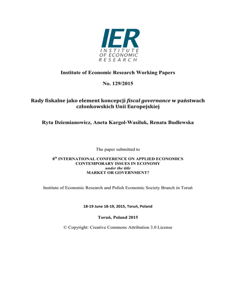 Institute of Economic Research Working Papers No. 129/2015 Rady fiskalne jako element koncepcji fiscal governance w państwach członkowskich Unii Europejskiej Ryta Dziemianowicz, Aneta Kargol-Wasiluk, Renata Budlewska The paper submitted to 8th INTERNATIONAL CONFERENCE ON APPLIED ECONOMICS CONTEMPORARY ISSUES IN ECONOMY under the title MARKET OR GOVERNMENT? Institute of Economic Research and Polish Economic Society Branch in Toruń 18-19 June 18-19, 2015, Toruń, Poland Toruń, Poland 2015 © Copyright: Creative Commons Attribution 3.0 License Ryta Dziemianowicz, Aneta Kargol-Wasiluk, Renata Budlewska [email protected], [email protected], [email protected] University of Bialystok Rady fiskalne jako element koncepcji fiscal governance w państwach członkowskich Unii Europejskiej Klasyfikacja JEL: H30 Słowa kluczowe: polityka fiskalna, rady fiskalne, fiscal governance, UE Abstrakt: Fiscal governance oznacza kombinację instytucji, zasad i norm, definiujących dobre rządzenie (tzw. good governance) w dziedzinie polityki fiskalnej. Jest specyficznym mechanizmem koordynacji polityki fiskalnej, posługującym się takimi narzędziami, jak: procedura budżetowa (legislacyjne reguły fiskalne), reguły fiskalne (numeryczne) oraz rady fiskalne. Badania w ramach koncepcji fiscal governance koncentrują się na odpowiedzi na pytania o odpowiedzialność w zakresie planowania, zatwierdzania, prowadzenia i kontroli polityki fiskalnej, zakładając zaangażowanie w tej polityce instytucji publicznych, a także sektora biznesu i społeczeństwa. W prezentowanym opracowaniu szczególną uwagę poświęcono uchwyceniu istoty zależności między elementami jakościowymi funkcjonowania rad fiskalnych a sprawnym funkcjonowaniem mechanizmu fiscal governance. Podczas ostatniego kryzysu finansowego zainteresowanie radami fiskalnymi i ich rolą w procesie stabilizacji finansów publicznych znacznie wzrosło, co odzwierciedla już sama liczba rad (przed 2008 r., funkcjonowało 7 instytucji, ale w 2014 r. już 19). Nasuwa się więc następujące pytanie: czy działania rad fiskalnych w obszarze stabilizowania finansów publicznych są skuteczne? Głównym celem artykułu jest ocena roli rad fiskalnych w koordynacji polityki fiskalnej w państwach członkowskich UE. W badaniach empirycznych przeprowadzonych w pracy zweryfikowano wpływ rad fiskalnych na stan finansów publicznych w państwach członkowskich UE. Badania zostały przeprowadzone w oparciu o dane Komisji Europejskiej, Eurostat oraz Międzynarodowego Funduszu Walutowego. Wprowadzenie Głównym założeniem ekonomii integracji europejskiej jest współistnienie scentralizowanej polityki monetarnej oraz krajowych zdecentralizowanych polityk fiskalnych (Sarrat de Tramezaigues, 2010; von Hagen, Mundschenk, 2003). W celu pełniejszego uwzględnienia w krajowej polityce fiskalnej zarówno wymiaru europejskiego, jak i uwarunkowań z zakresu pozostałych dziedzin planowania gospodarczego, już w Traktacie z Maastricht wprowadzono fiskalne kryteria konwergencji, uzupełnione w 1997 r. Paktem Stabilności i Wzrostu, w których określono zasady i reguły mające zapewnić stabilność finansów publicznych (szerzej: Godbillon & Sidiropoulos, 2001; Kosior & Rubaszek (red.), 2014). Zawodność wspólnotowych mechanizmów nadzoru nad krajową polityką fiskalną została obnażona w trakcie światowego kryzysu finansowego z 2008 r., w wyniku którego nadmierne zadłużenie krajów członkowskich przekroczyło w znacznym stopniu kryteria referencyjne, i w rezultacie – przyczyniło się do pogłębienia problemu spadku wiarygodności i wypłacalności tych krajów w skali międzynarodowej. Jednym z narzędzi zaradczych mających przeciwdziałać nierównowadze finansów publicznych i zapobiegać kryzysom finansów publicznych w przyszłości są rady fiskalne. Zgodnie z badaniami naukowymi wpisującymi się w koncepcję fiscal governance, rady fiskalne, jako jedno z dostępnych rozwiązań instytucjonalnych, są skutecznym narzędziem ograniczania dyskrecjonalności władz publicznych, co stanowi jeden z głównych celów odpowiedzialnej polityki fiskalnej. Dlatego konieczność ich istnienia jest wskazywana jako warunek zapewniający racjonalizację polityki fiskalnej prowadzonej przez władze publiczne. W latach 20082013 w państwach członkowskich UE zaobserwowano istotny wzrost zainteresowania tego typu instrumentami racjonalizacji finansów publicznych. Celem artykułu jest ocena roli rad fiskalnych w racjonalizacji finansów publicznych państw członkowskich Unii Europejskiej. Cel główny artykułu zostanie zrealizowany w dwojaki sposób. Po pierwsze, zostaną wskazane rzeczywiste kompetencje rad fiskalnych funkcjonujących w UE. Ocena tych kompetencji zostanie przeprowadzona w oparciu o postulaty formułowane na gruncie koncepcji fiscal governance. Następnie, za pomocą metod statystycznych zostanie zweryfikowany wpływ tych instytucji na wynik finansów publicznych w państwach członkowskich UE. Założenia metodologiczne Ocena roli rad fiskalnych w koordynacji finansów publicznych państw członkowskich UE została dokonana na podstawie analizy literatury poświęconej uwarunkowaniom skuteczności rad fiskalnych formułowanym w ramach koncepcji fiscal governance. Wynikająca z założeń teoretycznych skuteczność tego typu instytucji została skonfrontowana z weryfikacją statystyczną roli rad funkcjonujących w państwach członkowskich UE. Analizie zostały poddane rady fiskalne, które funkcjonowały w krajach UE w latach 2008-2013. Aby ocenić wpływ skuteczności rad fiskalnych na stan finansów publicznych, mierzony saldem sektora general government oraz poziomem długu publicznego w relacji do PKB, zastosowano nieparametryczne testy istotności statystycznej, tj. test U Manna Whitney’a oraz Kruskala-Wallisa. Przeprowadzone badania pozwoliły na weryfikację następująco sformułowanej hipotezy: Rady fiskalne skutecznie stabilizują 