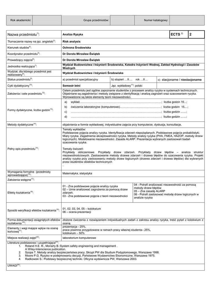 Rok akademicki: Grupa przedmiotów: Nazwa przedmiotu1): Analiza Ryzyka Tłumaczenie nazwy na jęz. angielski3): Risk analysis 4) Numer katalogowy: ECTS 2) 2 Ochrona Środowiska Kierunek studiów : 5) Koordynator przedmiotu : Prowadzący zajęcia6): Dr Dorota Mirosław-Świątek Dr Dorota Mirosław-Świątek Jednostka realizująca : Wydział Budownictwa i Inżynierii Środowiska, Katedra Inżynierii Wodnej, Zakład Hydrologii i Zasobów Wodnych Wydział, dla którego przedmiot jest realizowany8): Wydział Budownictwa i Inżynierii Środowiska Status przedmiotu9): a) przedmiot specjalizacyjny 7) 10) b) stopień …II…. rok …II… c) stacjonarne / niestacjonarne 11) Cykl dydaktyczny : Semestr letni Założenia i cele przedmiotu12): Celem przedmiotu jest ogólne zapoznanie studentów z procesem analizy ryzyka w systemach technicznych. Objaśniane są zagadnienia i metody związane z identyfikacją i analizą zagrożeń oraz szacowaniem ryzyka. Wprowadzone są także elementy teorii niezawodności. a) Formy dydaktyczne, liczba godzin13): Metody dydaktyczne14): Jęz. wykładowy : polski wykład……………………………………………………………………………; liczba godzin 15...; b) ćwiczenia laboratoryjne (komputerowe)..……………………………………; liczba godzin 15....; c) ……………………………………………………………………………………; liczba godzin .......; d) ……………………………………………………………………………………; liczba godzin .......; objaśnienia w formie wykładowej, indywidualne zajęcia przy komputerze, dyskusja, konsultacje, Tematy wykładów: Podstawowe pojęcia analizy ryzyka. Identyfikacja zdarzeń niepożądanych. Podstawowe pojęcia probabilistyki. Miary ryzyka. Zagadnienia akceptowalności ryzyka. Metody analizy ryzyka (PHA, FMEA, HAZOP, metody drzew logicznych). Modelowanie niezawodności. Zasada ALARP. Prezentacja wybranych zastosowań badań szacowania ryzyka. Pełny opis przedmiotu15): Wymagania formalne (przedmioty wprowadzające)16): Tematy ćwiczeń: Przykłady obliczeniowe. Przykłady drzew zdarzeń. Przykłady drzew błędów – analiza struktur niezawodnościowych. Zastosowanie metody drzewa zdarzeń i drzewa błędów do szacowania ryzyka. Projekt analizy ryzyka przy zastosowaniu metody drzew logicznych (drzewa zdarzeń i drzewa błędów) dla wybranych przez studentów obiektów technicznych . Matematyka, statystyka Założenia wstępne17): Efekty kształcenia18): 01 - Zna podstawowe pojęcia analizy ryzyka 02 – Umie analizować zagrożenia za pomocą drzew zdarzeń. 03 - Zna podstawowe pojęcia z teorii niezawodności Sposób weryfikacji efektów kształcenia19): 01, 02, 03, 04, 05 – kolokwium 06 – ocena prezentacji 04 - Potrafi analizować niezawodność za pomocą metody drzew błędów 05 – Zna zasadę ALARP 06 - Potrafi zastosować metodę drzew logicznych w analizie ryzyka Forma dokumentacji osiągniętych efektów złożone ćwiczenia z rozwiązaniem indywidualnych zadań z zakresu analizy ryzyka, treść pytań z kolokwium z kształcenia 20): oceną prezentacja - 25%, Elementy i wagi mające wpływ na ocenę prace pisemne przygotowane w ramach pracy własnej studenta– 25%, końcową21): kolokwium – 50% Miejsce realizacji zajęć22): laboratorium komputerowe Literatura podstawowa i uzupełniająca23): 1. Roland H.E. R., Moriarty B.:System safety engineering and management . A Wiley-Interscience publication. 2. Szopa T. Metody analizy bezpieczeństwa pracy. Skrypt PW dla Studium Podyplomowego, Warszawa 1998. 3. Moore P.G. Ryzyko w podejmowaniu decyzji, Państwowe Wydawnictwo Ekonomiczne, Warszawa 1975. 4. Radkowski S.: Podstawy bezpiecznej techniki. Oficyna wydawnicza PW, Warszawa 2003. UWAGI24): Wskaźniki ilościowe charakteryzujące moduł/przedmiot25) : Szacunkowa sumaryczna liczba godzin pracy studenta (kontaktowych i pracy własnej) niezbędna dla osiągnięcia zakładanych efektów kształcenia18) - na tej podstawie należy wypełnić pole ECTS2: Łączna liczba punktów ECTS, którą student uzyskuje na zajęciach wymagających bezpośredniego udziału nauczycieli akademickich: 15 h wykłady + 15 h ćwiczenia + 5 h konsultacje) Łączna liczba punktów ECTS, którą student uzyskuje w ramach zajęć o charakterze praktycznym, takich jak zajęcia laboratoryjne, projektowe, itp.: (15 h ćwiczenia + 5 h konsultacje + 15 h dokończenie zadań w ramach pracy własnej) 55 h (2,2 ECTS)h 1,4 ECTS 1,4 ECTS Tabela zgodności kierunkowych efektów kształcenia efektami przedmiotu 26) Nr /symbol efektu 01 Wymienione w wierszu efekty kształcenia: Zna podstawowe pojęcia analizy ryzyka Odniesienie do efektów dla programu kształcenia na kierunku KW_04+, 02 Umie analizować zagrożenia za pomocą drzew zdarzeń. K_U04+,K_S05+, 03 Zna podstawowe pojęcia z teorii niezawodności KW_04+, K_U04+ 04 Potrafi analizować niezawodność za pomocą metody drzew błędów KW_04+,K_U04+ 05 Zna zasadę ALARP KW_04+ 06 Potrafi zastosować metodę drzew logicznych w analizie ryzyka KW_04+,K_U04+,K_S02+