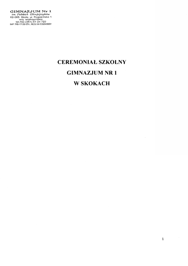 G I im. M N A Polskich 62-085 Z J U M N r 1 Olimpijczyków S k o k i . ul. R o g o z i ń s k a 1 woj. wielkopolskie tel./fax ( 0 5 1 ) S1 2 4 7 2 2 NIP 766-17-56-951. R E G O N 6 3 9 6 4 9 6 6 8 CEREMONIAŁ SZKOLNY GIMNAZJUM NR 1 W SKOKACH i Ceremoniał szkolny Gimnazjum nr 1 im. Polskich Olimpijczyków w Skokach jest opisem przeprowadzania najważniejszych uroczystości szkolnych z udziałem sztandaru szkoły. I SZTANDAR SZKOLNY Sztandar szkoły składa się z prostokątnego płatu tkaniny obszytego srebrnymi frędzlami przytwierdzoną do drzewca. Drzewce wykonane są z jasnego drewna i głowicy w kształcie godła państwowego. Wygląd sztandaru (prawą i lewą stronę) przedstawiają zdjęcia: Lewa strona sztandaru posiada granatowe tło. Centralne miejsce zajmuje logo szkoły . Prawa strona sztandaru posiada czerwone tło, na którym umieszczone jest godło państwowe. 2 Na drzewcu umieszczone są gwoździe z nazwami fundatorów. 1. Sztandar szkolny dla społeczności szkolnej jest symbolem Polski, Narodu, małej Ojczyzny jaka jest szkoła i jej najbliższe otoczenie. 2. Uroczystości z udziałem sztandaru wymagają zachowania powagi, a przechowywanie, transport i przygotowanie sztandaru do prezentacji, właściwych postaw jego poszanowania. 3. Sztandar jest przechowywany na terenie szkoły w zamkniętej gablocie. 4. Insygnia pocztu sztandarowego: > biało czerwone szarfy przewieszone przez prawe ramię, zwrócone kolorem białym w stronę kołnierza, spięte na lewym biodrze, > białe rękawiczki. 5. Insygnia pocztu sztandarowego przechowywane są w sekretariacie szkoły. Całością spraw organizacyjnych pocztu zajmuje się opiekun pocztu wyznaczony przez dyrektora spośród nauczycieli szkoły. 6. Kandydatury składu pocztu sztandarowego oraz składu rezerwowego są przedstawiane na czerwcowej radzie pedagogicznej i przez nią zatwierdzone. 7. Decyzją rady pedagogicznej uczniowie mogą być odwołani ze składu pocztu sztandarowego. W takim przypadku dokonuje się wyboru uzupełniającego. 8. Skład osobowy pocztu sztandarowego tworzą: > chorąży - uczeń, > asysta - dwie uczennice. 9. Chorąży i asysta powinni być odświętnie ubrani: > uczeń - ciemny garnitur, biała koszula i krawat, > uczennice - białe bluzki i ciemne spódnice. 10. Uroczystego przekazania sztandaru dokonuje się podczas uroczystości zakończenia roku szkolnego. 11. Udział sztandaru w uroczystościach na terenie szkoły: > uroczyste rozpoczęcie roku szkolnego, > ślubowanie klas pierwszych, > obchody święta patrona, > uroczystości związane ze świętami narodowymi, > uroczystości nawiązujące do ważnych wydarzeń w państwie i regionie, > zakończenie roku szkolnego . historycznych 12. Podczas uroczystości szkolnych uczniowie powinni mieć stroje galowe. 3 II CHWYTY SZTANDARU Postawa „do nogi" (zasadnicza) - sztandar położony na trzewiku drzewca przy prawej nodze na wysokości czubka buta. Drzewce przytrzymywane prawą ręką na wysokości pasa. Lewa ręka opuszczona wzdłuż ciała. Postawa „spocznij" - sztandar trzymany przy prawej nodze jak w postawie "zasadniczej". Chorąży i asysta w postawie "spocznij". Postawa „na ramię" - chorąży prawą ręką (pomagając sobie lewą) kładzie drzewce na prawe ramię i trzyma je pod kątem 45° w stosunku do ramienia. Prawa ręka wyciągnięta wzdłuż drzewca. Postawa „prezentuj" - z postawy "zasadniczej" chorąży podnosi sztandar prawą ręką i pionowo do góry wzdłuż prawego ramienia ( dłoń prawej ręki na wysokości barku ). Następnie lewą ręką chwyta drzewiec sztandaru tuż pod prawą i opuszcza prawą rękę na całej jej długości, obejmując dolną część drzewca. Asysta w postawie "zasadniczej". Salutowanie sztandarem - wykonuje się z postawy „prezentuj"- chorąży robi zwrot w prawo skos z równoczesnym wysunięciem lewej nogi w przód na odległość jednej stopy i pochyla sztandar do przodu pod kątem 45°. Po czasie "salutowania" przenosi sztandar do postawy "prezentuj." W czasie uroczystości kościelnych sztandar jest wprowadzany i wyprowadzany bez podawania komend. W czasie wprowadzania sztandaru wszyscy wstają. Poczet przechodzi przez kościół, trzymając sztandar pod kątem 45* do przodu i staje po lewej lub prawej stronie, bokiem do ołtarza i do zgromadzonych wiernych, podnosząc sztandar do pionu. W trakcie mszy św. Lub innej uroczystości członkowie pocztu sztandarowego nie klękają, nie przekazują znaku pokoju i nie wykonują żadnych innych gestów, stojąc cały czas w pozycji „Baczność" lub „Spocznij". Pochylenie sztandaru pod kątem 45* do przodu w pozycji „Baczność" następuje w sytuacjach: > podczas każdego podniesienia Hostii: w czasie Przemienienia, przed Komunią św. oraz w trakcie trzykrotnego podniesienia Monstrancji przy wystawieniu Najświętszego Sakramentu, > podczas opuszczania trumny do grobu, > podczas ogłoszenia minuty ciszy dla uczczenia czyjejś pamięci, > podczas składania wieńców, kwiatów i zniczy przez wyznaczone delegacje; na każde polecenie opuszczenia sztandaru wydane przez kapłana lub inną przemawiającą osobę. 4 III OPIS ZACHOWANIA UCZNIÓW W TRAKCIE OFICJALNYCH UROCZYSTOŚCI Wejście dyrektora szkoły ( wraz z zaproszonymi gośćmi) do hali na początku uroczystości, gdzie zgromadzona jest młodzież powinno być zapowiedziane przez prowadzącego: „Szanowni zebrani Pan (imię i nazwisko), dyrektor Gimnazjum nr 1 im. Polskich Olimpijczyków w Skokach." Młodzież powstaje z miejsc. IV CEREMONIAŁ UROCZYSTOŚCI SZKOLNYCH Z UDZIAŁEM SZTANDARU Opis zachowania uczniów w trakcie oficjalnych uroczystości: WPROWADZENIE SZTANDARU „Baczność!" „Sztandar wprowadzić!" Uczestnicy w postawie zasadniczej. Poczet sztandarowy wchodzi na miejsce uroczystości, zajmuje miejsce po prawej lub lewej stronie sali przodem do zgromadzonych. Przyjmuje postawę „prezentuj". „Do hymnu państwowego!" Uczestnicy w postawie zasadniczej. Poczet sztandarow