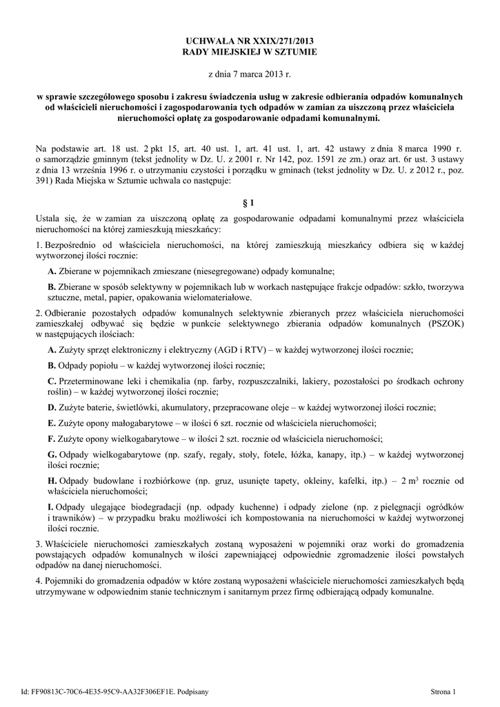 UCHWAŁA NR XXIX/271/2013 RADY MIEJSKIEJ W SZTUMIE z dnia 7 marca 2013 r. w sprawie szczegółowego sposobu i zakresu świadczenia usług w zakresie odbierania odpadów komunalnych od właścicieli nieruchomości i zagospodarowania tych odpadów w zamian za uiszczoną przez właściciela nieruchomości opłatę za gospodarowanie odpadami komunalnymi. Na podstawie art. 18 ust. 2 pkt 15, art. 40 ust. 1, art. 41 ust. 1, art. 42 ustawy z dnia 8 marca 1990 r. o samorządzie gminnym (tekst jednolity w Dz. U. z 2001 r. Nr 142, poz. 1591 ze zm.) oraz art. 6r ust. 3 ustawy z dnia 13 września 1996 r. o utrzymaniu czystości i porządku w gminach (tekst jednolity w Dz. U. z 2012 r., poz. 391) Rada Miejska w Sztumie uchwala co następuje: §1 Ustala się, że w zamian za uiszczoną opłatę za gospodarowanie odpadami komunalnymi przez właściciela nieruchomości na której zamieszkują mieszkańcy: 1. Bezpośrednio od właściciela nieruchomości, na której zamieszkują mieszkańcy odbiera się w każdej wytworzonej ilości rocznie: A. Zbierane w pojemnikach zmieszane (niesegregowane) odpady komunalne; B. Zbierane w sposób selektywny w pojemnikach lub w workach następujące frakcje odpadów: szkło, tworzywa sztuczne, metal, papier, opakowania wielomateriałowe. 2. Odbieranie pozostałych odpadów komunalnych selektywnie zbieranych przez właściciela nieruchomości zamieszkałej odbywać się będzie w punkcie selektywnego zbierania odpadów komunalnych (PSZOK) w następujących ilościach: A. Zużyty sprzęt elektroniczny i elektryczny (AGD i RTV) – w każdej wytworzonej ilości rocznie; B. Odpady popiołu – w każdej wytworzonej ilości rocznie; C. Przeterminowane leki i chemikalia (np. farby, rozpuszczalniki, lakiery, pozostałości po środkach ochrony roślin) – w każdej wytworzonej ilości rocznie; D. Zużyte baterie, świetlówki, akumulatory, przepracowane oleje – w każdej wytworzonej ilości rocznie; E. Zużyte opony małogabarytowe – w ilości 6 szt. rocznie od właściciela nieruchomości; F. Zużyte opony wielkogabarytowe – w ilości 2 szt. rocznie od właściciela nieruchomości; G. Odpady wielkogabarytowe (np. szafy, regały, stoły, fotele, łóżka, kanapy, itp.) – w każdej wytworzonej ilości rocznie; H. Odpady budowlane i rozbiórkowe (np. gruz, usunięte tapety, okleiny, kafelki, itp.) – 2 m3 rocznie od właściciela nieruchomości; I. Odpady ulegające biodegradacji (np. odpady kuchenne) i odpady zielone (np. z pielęgnacji ogródków i trawników) – w przypadku braku możliwości ich kompostowania na nieruchomości w każdej wytworzonej ilości rocznie. 3. Właściciele nieruchomości zamieszkałych zostaną wyposażeni w pojemniki oraz worki do gromadzenia powstających odpadów komunalnych w ilości zapewniającej odpowiednie zgromadzenie ilości powstałych odpadów na danej nieruchomości. 4. Pojemniki do gromadzenia odpadów w które zostaną wyposażeni właściciele nieruchomości zamieszkałych będą utrzymywane w odpowiednim stanie technicznym i sanitarnym przez firmę odbierającą odpady komunalne. Id: FF90813C-70C6-4E35-95C9-AA32F306EF1E. Podpisany Strona 1 5. Odbieranie zmieszanych (niesegregowanych) odpadów komunalnych o których mowa w ust. 1 lit. A odbywać się będzie zgodnie z harmonogramem ustalonym z podmiotem odbierającym odpady komunalne, z częstotliwością zapobiegającą przepełnianiu się pojemników, jednakże co najmniej raz na dwa tygodnie w przypadku zabudowy jednorodzinnej i co najmniej raz w tygodniu, w przypadku zabudowy wielorodzinnej. 6. Odbieranie selektywnie zebranych odpadów komunalnych o których mowa w ust. 1 lit. B odbywać się będzie zgodnie z harmonogramem ustalonym z podmiotem odbierającym odpady komunalne z częstotliwością zapobiegającą przepełnianiu się pojemników i worków, jednakże co najmniej raz na dwa tygodnie: A. W przypadku zabudowy jednorodzinnej do zbierania odpadów o których mowa w § 1 ust. 1 lit. B, przewiduje się następujące kolory worków: Żółty – tworzywa sztuczne, metal, opakowania wielomateriałowe, Niebieski – papier i tektura, Zielony – szkło, B. W przypadku zabudowy wielorodzinnej do zbierania odpadów o których mowa w § 1 ust. 1 lit. B, przewiduje się następujące pojemniki o pojemności 1100 l: Żółty – tworzywa sztuczne, metal, opakowania wielomateriałowe. Niebieski – papier i tektura, Zielony – szkło. 7. Punkt selektywnego zbierania odpadów komunalnych (PSZOK) będzie świadczył usługi od poniedziałku do piątku w godzinach od 8:00 do 16:00 oraz w soboty w godzinach od 8:00 do 14:00 przyjmując dostarczone selektywnie zbierane odpady, o których mowa w ust. 2 po uprzednim ustaleniu właściciela nieruchomości, z której dostarczane będą odpady. 8. Dwa razy w roku przeprowadzona będzie objazdowa zbiórka odpadów wielkogabarytowych oraz zużytego sprzętu elektronicznego i elektrycznego (AGD i RTV). Przeprowadzenie akcji zostanie poprzedzone poinformowaniem o terminie i sposobie jej przeprowadzenia przez podmiot odbierający odpady komunalne. §2 Tracą moc uchwały nr XXV/228/2012 Rady Miejskiej w Sztumie z dnia 29 listopada 2012 r. w sprawie szczegółowego sposobu i zakresu świadczenia usług w zakresie odbierania odpadów komunalnych od właścicieli nieruchomości i zagospodarowania tych odpadów w zamian za uiszczoną przez właściciela nieruchomości opłatę za gospodarowanie odpadami komunalnymi oraz uchwała nr XXVI/250/2012 Rady Miejskiej w Sztumie z dnia 29 grudnia 2012 r. w sprawie zmiany uchwały Nr XXV/228/2012 Rady Miejskiej w Sztumie z dnia 29 listopada 2012 r. w sprawie szczegółowego sposobu i zakresu świadczenia usług w zakresie odbierania odpadów komunalnych od właścicieli nieruchomości i zagospodarowania tych odpadów w zamian za uiszczoną przez właściciela nieruchomości opłatę za gospodarowanie odpadami komunalnymi. §3 Wykonanie uchwały powierza się Burmistrzowi Miasta i Gminy Sztum. §4 U