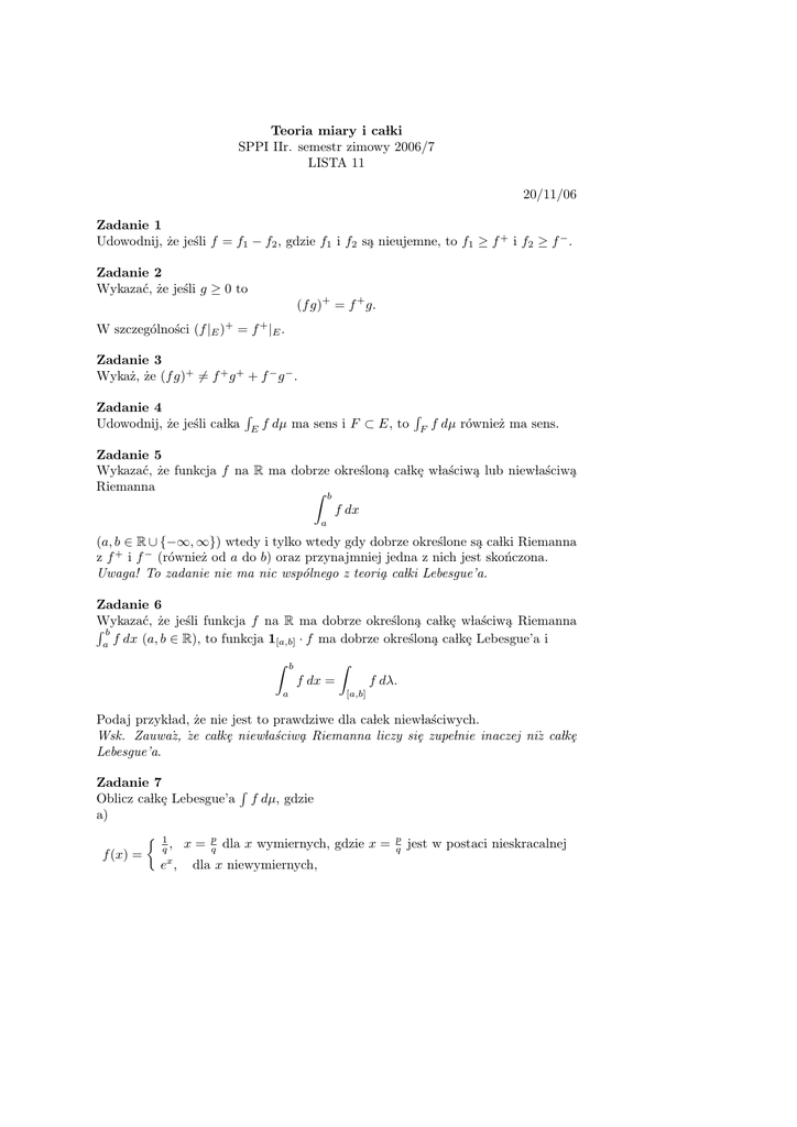 Teoria miary i ca lki SPPI IIr. semestr zimowy 2006/7 LISTA 11 20/11