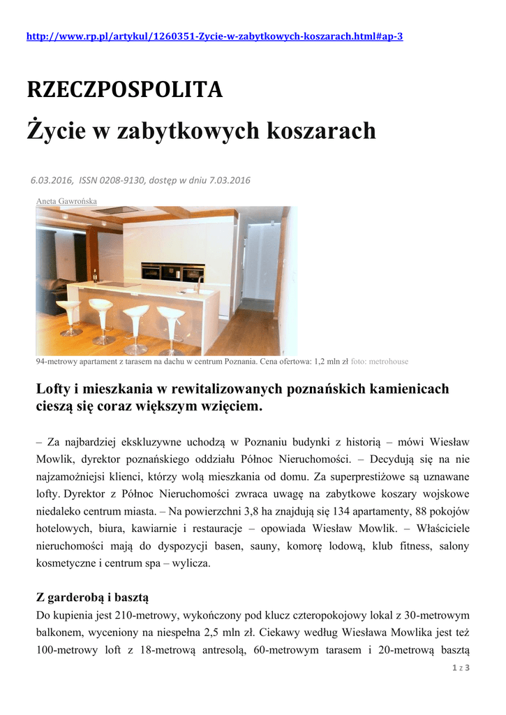 http://www.rp.pl/artykul/1260351-Zycie-w-zabytkowych-koszarach.html#ap-3 RZECZPOSPOLITA Życie w zabytkowych koszarach 6.03.2016, ISSN 0208-9130, dostęp w dniu 7.03.2016 Aneta Gawrońska 94-metrowy apartament z tarasem na dachu w centrum Poznania. Cena ofertowa: 1,2 mln zł foto: metrohouse Lofty i mieszkania w rewitalizowanych poznańskich kamienicach cieszą się coraz większym wzięciem. – Za najbardziej ekskluzywne uchodzą w Poznaniu budynki z historią – mówi Wiesław Mowlik, dyrektor poznańskiego oddziału Północ Nieruchomości. – Decydują się na nie najzamożniejsi klienci, którzy wolą mieszkania od domu. Za superprestiżowe są uznawane lofty. Dyrektor z Północ Nieruchomości zwraca uwagę na zabytkowe koszary wojskowe niedaleko centrum miasta. – Na powierzchni 3,8 ha znajdują się 134 apartamenty, 88 pokojów hotelowych, biura, kawiarnie i restauracje – opowiada Wiesław Mowlik. – Właściciele nieruchomości mają do dyspozycji basen, sauny, komorę lodową, klub fitness, salony kosmetyczne i centrum spa – wylicza. Z garderobą i basztą Do kupienia jest 210-metrowy, wykończony pod klucz czteropokojowy lokal z 30-metrowym balkonem, wyceniony na niespełna 2,5 mln zł. Ciekawy według Wiesława Mowlika jest też 100-metrowy loft z 18-metrową antresolą, 60-metrowym tarasem i 20-metrową basztą 1z3 oferowany za 1,4 mln zł. – Drugim prestiżowym miejscem w Poznaniu jest Warzelnia. To kompleks 100 apartamentów powstający w Nowym Mieście – dzielnicy niedaleko centrum – opowiada dyrektor. – Architektura nawiązuje do historycznego gmachu browaru ceglaną elewacją, a nowoczesność podkreślają szkło i elementy metalowe – zauważa. Ceny najtańszych dwupokojowych lokali nie przekraczają 400 tysięcy zł. Najwyżej wycenioną, a pozostającą w ofercie nieruchomością (1,25 mln zł) jest ponad 200-metrowy segment. – Składa się z sześciu pokojów (z których trzy są wyposażone w garderoby), trzech łazienek, garażu i ogrodu zimowego – opisuje Wiesław Mowlik.Dyrektor zwraca też uwagę, że od kilku lat coraz więcej kupujących jest zainteresowanych zamieszkaniem w kamienicach.– Wysoka cena ich nie odstrasza, bo chcą klimatu i nieruchomości z duszą. Zależy im na wysokich sufitach, drewnianych oknach, drzwiach i podłogach oraz na ozdobnych klamkach – podkreśla.Ceny lokali w odnowionych poznańskich kamienicach zaczynają się od 6,5 tys. zł. Te najdroższe kosztują ponad 8 tys. zł za mkw. Metr lokalu do remontu można zaś kupić za ok. 4 tys. zł. – Najszybciej sprzedają się mieszkania o powierzchni do 50 mkw. Najtrudniej znaleźć nabywcę na ponad 80-metrowe lokale – wskazuje Wiesław Mowlik.Joanna Skorupska, dyrektor oddziału Freedom Nieruchomości w Poznaniu, szacuje, że do kupienia jest ponad 1,3 tys. mieszkań w kamienicach. – Coraz więcej inwestorów rewitalizuje budynki. Kamienice mają nie tylko odnowione elewacje i wnętrza. Często są w nich montowane windy, co podnosi ich prestiż – opowiada dyrektor z Freedom Nieruchomości. Dodaje, że popularnością cieszy się centrum miasta oraz Łazarz i Grunwald.– Lokale w kamienicach są często kupowane lub wynajmowane na biura, kancelarie prawne i notarialne – zwraca uwagę Joanna Skorupska. – Średnie ceny transakcyjne mieszkań w kamienicach wynoszą ok. 5,3 tys. zł za mkw. Ceny automatycznie rosną, jeśli kamienica jest po rewitalizacji. Można oddychać Według dyrektor z Freedom Nieruchomości klienci lubią kamieniczne mieszkania, bo są solidne, mają wysokie sufity i dają dużą przestrzeń, a zza ścian nie słychać sąsiadów. – W takich mieszkaniach można swobodnie oddychać – mówi Joanna Skorupska. Dodaje, że licznych zwolenników mają oczywiście także nowe inwestycje. – Jednak za nieruchomości z duszą i specyficznym klimatem uchodzą kamienice – zastrzega dyrektor.Joanna Skorupska, pytana o najbardziej prestiżowe poznańskie adresy, wskazuje na ścisłe centrum – Garbary i Stare Miasto, gdzie ceny mieszkań są wysokie.– Prestiżowym miejscem jest City Park i ulica Wyspiańskiego, gdzie mkw. mieszkań jest wyceniany na ponad 8 tys. zł – podaje. – Na uwagę kupujących zasługuje też Grunwald. Ostatnio w tej dzielnicy sprzedaje się sporo domów. 2z3 Z analiz Freedom Nieruchomości wynika, że mieszkania z najlepszymi adresami są nawet dwukrotnie droższe.– Nie sądzę, by doszło tu do dużych zmian – prognozuje dyrektor Skorupska. – Na prestiżowe mieszkania zawsze znajdują się chętni, którzy za lepszy standard są w stanie zapłacić więcej. Opinia Sławomir Horbaczewski, ekspert rynku nieruchomości Poznań w ostatnich latach przechodził intensywne zmiany, podobnie jak inne duże miasta regionalne. Miasto dynamicznie rozwijało infrastrukturę miejską, skutecznie przyciągało międzynarodowy kapitał, tworzyło nowe miejsca pracy. W jeszcze większym stopniu dotyczy to gmin podpoznańskich, gdzie powstają nowe inwestycje lokalnych i międzynarodowych przedsiębiorców. Do Poznania i podmiejskich gmin napłynęła znaczna liczba nowych mieszkańców. To siła, która w dużym stopniu napędza popyt na rynku nieruchomości. Poznań to jednak miejsce bardziej na długoterminowe inwestycje niż na zakupy spekulacyjne. Najbardziej prestiżową i popularną dzielnicą jest Stare Miasto, gdzie oferta mieszkaniowa jest urozmaicona, a ceny wysokie. Inwestorzy chcący zarabiać na wynajmie chętnie wybierają Stare Miasto ze względu na akademicki charakter dzielnicy. Również Piątkowo, Podolany, Strzeszyn, Sołacz oraz północna część Jeżyc uchodzą za popularne. Ostatnio bardzo dużo nowych inwestycji powstało na Winogradach, które mają dobrze rozwiniętą infrastrukturę miejską. Dużym zainteresowaniem cieszą się także mniej prestiżowe i bardziej odległe od centrum Poznania okolice, m.in. Rataje, Wilda czy Grunwald, gdzie ceny mkw. mieszkań są wyraźnie niższe ni