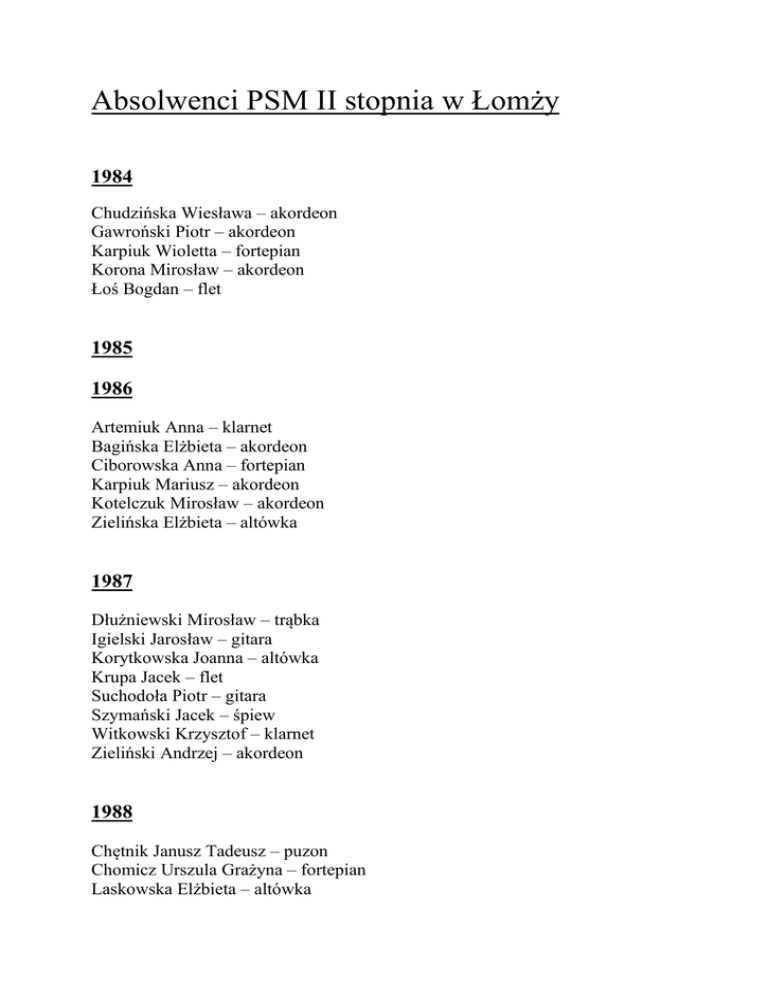 Absolwenci PSM II stopnia w Łomży 1984 Chudzińska Wiesława – akordeon Gawroński Piotr – akordeon Karpiuk Wioletta – fortepian Korona Mirosław – akordeon Łoś Bogdan – flet 1985 1986 Artemiuk Anna – klarnet Bagińska Elżbieta – akordeon Ciborowska Anna – fortepian Karpiuk Mariusz – akordeon Kotelczuk Mirosław – akordeon Zielińska Elżbieta – altówka 1987 Dłużniewski Mirosław – trąbka Igielski Jarosław – gitara Korytkowska Joanna – altówka Krupa Jacek – flet Suchodoła Piotr – gitara Szymański Jacek – śpiew Witkowski Krzysztof – klarnet Zieliński Andrzej – akordeon 1988 Chętnik Janusz Tadeusz – puzon Chomicz Urszula Grażyna – fortepian Laskowska Elżbieta – altówka Serdyńska Marta – fortepian Tomaszewicz Andrzej – skrzypce Witkowski Janusz – trąbka 1989 Ciborowska Iwona – wiolonczela Łoniewska Ewa – fortepian Siwek Agata – fortepian Skawski Ireneusz – akordeon Stankiewicz Beata – skrzypce 1990 Borawska Cecylia – gitara Gajdziński Wiesław – saksofon Gancarz-Piejdak Małgorzata – gitara Jakubowski Dariusz – akordeon Krajewski Adam – gitara Obrycki Mariusz – akordeon Paduch Tomasz – akordeon Sokołowski Andrzej – gitara Tracz Krzysztof – trąbka Waśko Marta – akordeon 1991 Białobrzeski Jarosław – puzon Gromadzka Elżbieta – flet Hołubowicz Jolanta – akordeon Milewska Dorota – flet Popławska Marzanna – akordeon Ramotowski Daniel – puzon, akordeon Szenk Aleksandra – fortepian 1992 Czartoryski Sebastian – trąbka Górtatowska Agnieszka – skrzypce Kowalewski Adam – kontrabas Mielechowicz Agnieszka – fortepian Stańczyk Tadeusz – puzon Wejs Sylwia – wiolonczela Wiski Sylwester – trąbka Włodkowski Artur – klarnet Wronowski Robert – altówka Wybraniak Ireneusz – akordeon 1993 Barcewicz Elżbieta – flet Bąkowska Hanna – skrzypce Dziedzic Bogusław – fortepian Kosińska Agnieszka – fortepian Rybicki Andrzej – puzon 1994 Bielicka Agnieszka – fortepian Brożyna Anna Izabela – fortepian Gaś Jarosław – perkusja Leszczyńska Anna Maria - fortepian Saniewska Edyta – fortepian Szczechowski Jacek – trąbka 1995 Bąkowska Jolanta – fortepian Czochański Jarosław – saksofon Grzelecki Sebastian – klarnet Karpowicz Grzegorz – trąbka Kowalik Bogdan – kontrabas Kozera Anna Natalia – fortepian Kryńska Małgorzata Karolina – fortepian Mydłowski Przemysław Józef – wiolonczela Sadłowska Monika – altówka Synow Magdalena – altówka 1996 Dąbrowski Piotr – klarnet Grodzka Ewa – klarnet Konopka Kamil – fortepian Pawelczyk Joanna – flet Sulkowski Piotr – trąbka 1997 Chmielewska Barbara – fortepian Czerska Anna Maria – flet Grzybała Joanna – gitara Jadacki Adam – trąbka Kalinowska Małgorzata – altówka Karasiewicz Agnieszka – wiolonczela Prusinowska Agnieszka – fortepian Ruda Katarzyna – flet Świetlik Tomasz – akordeon Żulikowska Olga – gitara 1998 Murawska Izabella – fortepian Nadolna Beata Anna – fortepian Pomichowska Mirosława – fortepian Przystańska Monika – fortepian Rabczyńska Marta – flet Rożniatowska Agata Elżbieta – akordeon Rutkowski Karol – klarnet 1999 Bogucka Agnieszka – klarnet Pakosińska Karolina – fortepian Sierzputowski Wojciech – klarnet Śledziewska Dorota – wiolonczela Toczyłowska Renata – fortepian Woleńska Katarzyna – gitara 2000 Kryspin Piotr – akordeon Mocarski Bartłomiej – akordeon Nitkiewicz Bartosz – skrzypce Puławski Marcin – saksofon Zugaj Jan – skrzypce 2001 Dubowski Sławomir – klarnet Kęsik Anna – flet Mieczkowska Anna – fagot Młynarczyk Agata – wiolonczela 2002 Borusiewicz Kamil – trąbka Falkowska Magdalena – fortepian Kamińska Monika – skrzypce Łada Roman – akordeon Mieczkowski Mariusz – gitara Perkowski Dawid – klarnet Żłobiński Tomasz – puzon 2003 Jarzyło Artur – saksofon Klocek Przemysław Zbigniew – klarnet Marzęcka Ludmiła – wiolonczela Swajda Tomasz – perkusja Zeszut Maciej – klarnet 2004 Boguska Żaklina – skrzypce Borkowski Michał – akordeon Czajkowski Michał – fortepian Gawryluk Jarosław – akordeon Marusiak Andrzej – skrzypce Nierodzik Magdalena – skrzypce Olchowik Michał – akordeon Szabłowska Marta – skrzypce Wieremiejewicz Marek – perkusja 2005 Błoński Michał - trąbka Duda Justyna - fagot Kulczyńska Alicja - gitara 2006 Kowalczyk Marcin - fortepian Korona Łukasz - skrzypce Niska Izabela - klarnet 2007 Gliński Krystian - klarnet Grądzka Anna - flet Kotelczuk Olga - skrzypce Lipiński Paweł – fortepian Żłobiński Piotr - perkusja 2008 Borusiewicz Maja - skrzypce Malewska Elżbieta – fortepian Obrycki Michał - gitara Selerowski Adam - klarnet Staniszewska Magdalena - skrzypce 2009 Knapkiewicz Michał – tuba Knapkiewicz Małgorzata – fortepian Lewiarz Piotr - trąbka Lipski Marek - fortepian 2010 Bajno Paulina - saksofon Chylińska Agata - klarnet Gorczyca Krzysztof - puzon Jasionowski Paweł - saksofon Okołowicz Julia - wiolonczela Parzych Agnieszka - klarnet Rutkowska Maja - wiolonczela Żelechowska Agata – fortepian 2011 Komorowski Piotr - akordeon Konieczny Jakub - gitara Mariak Kamil - gitara Szymkiewicz Magdalena – altówka Szabłowska Justyna - wiolonczela Wszeborowska Patrycja - altówka 2012 Biłda Aleksandra - skrzypce Bućko Ziemowit - gitara Dąbrowska Bogumiła - skrzypce Jankiewicz Mateusz - akordeon Malinowska Katarzyna - wiolonczela Niedzielski Emil - trąbka Skrodzka Weronika - wiolonczela 2013 Chaberek Wioletta - skrzypce Kowalczyk Albert - fortepian Lewiarz Adela - skrzypce Lipski Łukasz - skrzypce Markowska Olga - wiolonczela Maciejewska Aleksandra - skrzypce Przystępski Dawid - altówka Zeszut Mateusz - trąbka 2014 Domalewska Katarzyna - skrzypce Ejsmont Aleksandra - obój Jastrzębski Mateusz - akordeon Łepkowski Mariusz - perkusja Markowska Martyna - altówka Przystępski Dawid - klarnet Rogi