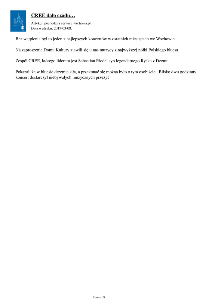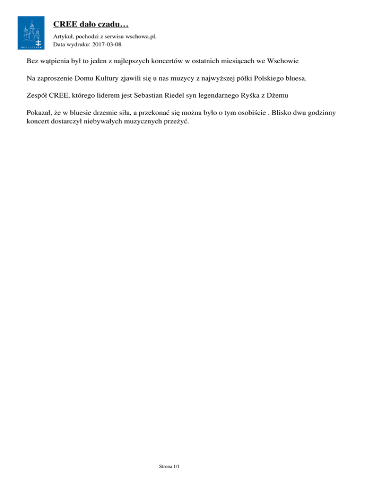 CREE dało czadu… Artykuł‚ pochodzi z serwisu wschowa.pl. Data wydruku: 2017-03-08. Bez wątpienia był to jeden z najlepszych koncertów w ostatnich miesiącach we Wschowie Na zaproszenie Domu Kultury zjawili się u nas muzycy z najwyższej półki Polskiego bluesa. Zespół CREE, którego liderem jest Sebastian Riedel syn legendarnego Ryśka z Dżemu Pokazał, że w bluesie drzemie siła, a przekonać się można było o tym osobiście . Blisko dwu godzinny koncert dostarczył niebywałych muzycznych przeżyć. Strona 1/1 Powered by TCPDF (www.tcpdf.org)