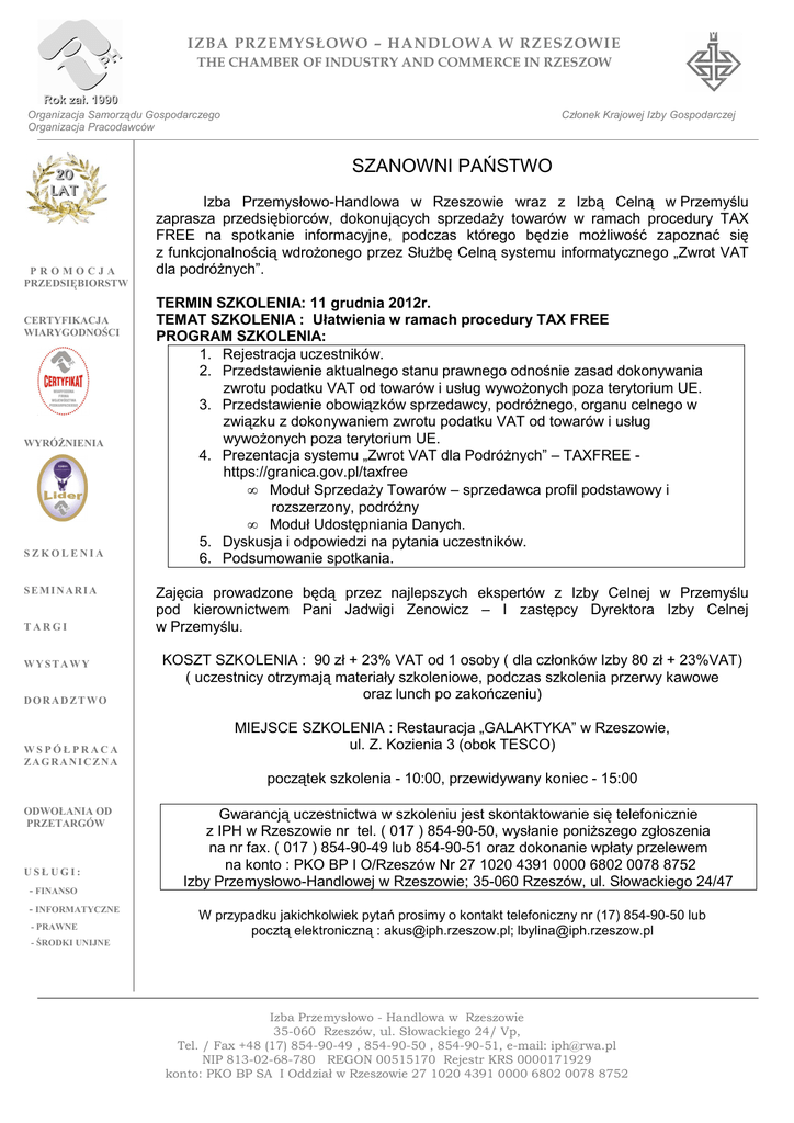 IZBA PRZEMYSŁOWO – HANDLOWA W RZESZOWIE THE CHAMBER OF INDUSTRY AND COMMERCE IN RZESZOW Organizacja Samorządu Gospodarczego Organizacja Pracodawców Członek Krajowej Izby Gospodarczej SZANOWNI PAŃSTWO PROMOCJA PRZEDSIĘBIORSTW CERTYFIKACJA WIARYGODNOŚCI WYRÓŻNIENIA SZKOLENIA SEMINARIA TARGI WYSTAWY DORADZT WO WSPÓŁPRACA ZAGRANICZNA Izba Przemysłowo-Handlowa w Rzeszowie wraz z Izbą Celną w Przemyślu zaprasza przedsiębiorców, dokonujących sprzedaży towarów w ramach procedury TAX FREE na spotkanie informacyjne, podczas którego będzie możliwość zapoznać się z funkcjonalnością wdrożonego przez Służbę Celną systemu informatycznego „Zwrot VAT dla podróżnych”. TERMIN SZKOLENIA: 11 grudnia 2012r. TEMAT SZKOLENIA : Ułatwienia w ramach procedury TAX FREE PROGRAM SZKOLENIA: 1. Rejestracja uczestników. 2. Przedstawienie aktualnego stanu prawnego odnośnie zasad dokonywania zwrotu podatku VAT od towarów i usług wywożonych poza terytorium UE. 3. Przedstawienie obowiązków sprzedawcy, podróżnego, organu celnego w związku z dokonywaniem zwrotu podatku VAT od towarów i usług wywożonych poza terytorium UE. 4. Prezentacja systemu „Zwrot VAT dla Podróżnych” – TAXFREE https://granica.gov.pl/taxfree • Moduł Sprzedaży Towarów – sprzedawca profil podstawowy i rozszerzony, podróżny • Moduł Udostępniania Danych. 5. Dyskusja i odpowiedzi na pytania uczestników. 6. Podsumowanie spotkania. Zajęcia prowadzone będą przez najlepszych ekspertów z Izby Celnej w Przemyślu pod kierownictwem Pani Jadwigi Zenowicz – I zastępcy Dyrektora Izby Celnej w Przemyślu. KOSZT SZKOLENIA : 90 zł + 23% VAT od 1 osoby ( dla członków Izby 80 zł + 23%VAT) ( uczestnicy otrzymają materiały szkoleniowe, podczas szkolenia przerwy kawowe oraz lunch po zakończeniu) MIEJSCE SZKOLENIA : Restauracja „GALAKTYKA” w Rzeszowie, ul. Z. Kozienia 3 (obok TESCO) początek szkolenia - 10:00, przewidywany koniec - 15:00 ODWOŁANIA OD PRZETARGÓW USŁUGI: - FINANSO - INFORMATYCZNE - PRAWNE Gwarancją uczestnictwa w szkoleniu jest skontaktowanie się telefonicznie z IPH w Rzeszowie nr tel. ( 017 ) 854-90-50, wysłanie poniższego zgłoszenia na nr fax. ( 017 ) 854-90-49 lub 854-90-51 oraz dokonanie wpłaty przelewem na konto : PKO BP I O/Rzeszów Nr 27 1020 4391 0000 6802 0078 8752 Izby Przemysłowo-Handlowej w Rzeszowie; 35-060 Rzeszów, ul. Słowackiego 24/47 W przypadku jakichkolwiek pytań prosimy o kontakt telefoniczny nr (17) 854-90-50 lub pocztą elektroniczną : [email protected]; [email protected] - ŚRODKI UNIJNE Izba Przemysłowo - Handlowa w Rzeszowie 35-060 Rzeszów, ul. Słowackiego 24/ Vp, Tel. / Fax +48 (17) 854-90-49 , 854-90-50 , 854-90-51, e-mail: [email protected] NIP 813-02-68-780 REGON 00515170 Rejestr KRS 0000171929 konto: PKO BP SA I Oddział w Rzeszowie 27 1020 4391 0000 6802 0078 8752 ZGŁOSZENIE Firma ( dane do faktury ) : ................................................................................................................. Adres : ……………....................................................................... NIP : .................................. zgłasza udział ............... osób w szkoleniu w dniu 11 grudnia 2012r. Osoby do kontaktu : ................................................................................................................. tel. ................................ fax. ................................. e - mail...................................................... Równocześnie upoważniamy do wystawienia faktury VAT bez naszego podpisu. Główny Księgowy ………........................................ podpis i pieczątka Pieczątka firmy Prezes / Dyrektor ..................................................... podpis i pieczątka