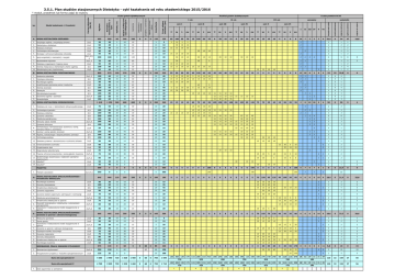 3.5.1. Plan studiów stacjonarnych Dietetyka - cykl kształcenia od roku akademickiego 2015/2016 * moduł, przedmiot lub forma zajęć do wyboru bezpośredni udział nauki podstawowe zajęcia praktyczne ogólnouczelniane zajęcia do wyboru 340 65 160 22,4 0 24 27 10,8 20 5 10 10 5 5 5 10 5 5 1 1 1 1 50 40 0 30 30 10 10 30 10 10 2 2 2 2 3. Podstawy biofizyki Zo/1 50 40 15 15 15 10 10 15 10 10 2 1 2 4. Technologia informacyjna Zo/2 50 40 0 30 30 10 10 2 2 2 5. Ekologia i ochrona środowiska człowieka 2 1 2 6 8 8 8 2 3 2 3 2 1 2 3 3 4 6. Język angielski/j. niemiecki/j. rosyjski 7. Wychowanie fizyczne* 8. Podstawy organizacji i higieny pracy 9. Chemia medyczna z elementami chemii ogólnej 10. Metodologia pracy dyplomowej Praca własna studenta (pw) 95 25 Zo/1 konsultacje 560 Zo/1 Statystyka w dietetyce zajęcia terenowe i obozy 695 Socjologia ogólna z socjologią zdrowia 2. projekty i seminaria MODUŁ KSZTAŁCENIA OGÓLNEGO 1. Moduł kształcenia / Przedmiot ćwiczenia zajęcia praktyczne (zp) obejmujące: A. Lp. laboratoria i warsztaty wykłady (w) Liczba punktów ECTS Kontakt z nauczycielem, w tym: Rozkład godzin dydaktycznych Ogółem Forma zaliczenia (Zo/E) Liczba godzin dydaktycznych 340 0 0 0 125 135 I rok II rok sem I sem II sem III pw w zp k pw w zp k pw w zp k pw w zp k pw w zp k pw 65 70 15 105 30 35 0 30 10 10 0 30 10 10 15 15 10 10 0 0 0 0 15 10 10 10 10 15 15 15 10 10 15 10 10 0 120 120 40 40 30 10 10 30 70 60 0 60 60 0 10 30 5 30 Zo/1 50 40 15 15 15 10 10 15 15 10 10 E/2 100 80 30 30 30 20 20 15 15 10 10 15 15 10 10 55 90 60 95 40 105 40 65 40 15 15 15 575 155 270 270 Zo/1,2 100 60 10 30 E/2 100 80 30 30 50 40 15 50 45 0 100 60 10 100 65 E/3 100 Zo/3,4 Zo/3 I II III IV V VI 14 7 2 2 2 0 2 30 40 50 15 2 2 30 10 10 30 10 10 5 2 2 1 1 20 40 5 15 10 20 5 15 10 20 2 30 20 20 15 15 10 10 15 15 10 10 2 15 15 10 10 15 15 10 10 45 45 0 5 30 30 20 40 5 15 10 20 10 20 15 30 30 20 35 15 30 20 35 80 30 30 30 20 20 100 80 30 30 30 20 100 65 15 30 30 1 610 1 250 360 600 600 Zo/2 75 55 15 30 Technologia żywności E/3 100 80 30 Podstawy dietetyki E/2 100 80 30 Żywienie człowieka E/4 240 160 30 5. Dietetyka pediatryczna E/4 100 80 6. Kliniczny zarys chorób Zo/3,4 100 7. Żywienie kliniczne E/4 Anatomia człowieka 2. Fizjologia człowieka 3. Psychologia ogólna Zo/1 4. Kwalifikowana pierwsza pomoc medyczna Zo/2 5. Chemia żywności E/2 6. Genetyka E/1 7. Mikrobiologia żywności 8. Biochemia ogólna i żywności 9. Parazytologia C. MODUŁ KSZTAŁCENIA KIERUNKOWEGO 1. Podstawy ed. żyw. z elementami zdrowia publicznego 2. 3. 4. 45 60 40 55 15 10 20 15 15 10 10 20 35 15 30 20 35 290 360 105 150 85 100 30 10 20 30 30 20 20 30 30 20 20 90 90 40 80 15 45 45 20 80 30 30 30 100 80 30 30 Zo/4 50 40 15 Zo/3,4 100 80 10. Higiena, toksykologia i bezpieczeństwo żywności E/4 100 11. Technologia potraw E/5 100 12. Podstawy prawne i ekonomiczne w ochronie zdrowia Zo/5 13. Towaroznawstwo żywności 15 10 10 10 10 10 0 0 15 10 10 60 75 40 50 15 30 10 20 15 15 10 10 15 15 10 10 15 15 10 10 15 15 10 90 195 95 120 75 75 10 15 30 45 15 40 20 15 15 10 10 30 10 20 20 15 15 10 10 15 15 30 20 20 15 15 10 10 15 15 15 10 10 15 15 45 45 20 20 15 15 10 10 80 30 30 30 20 20 15 15 10 10 80 0 60 60 20 20 50 40 15 15 15 10 10 Zo/6 60 50 15 30 30 5 10 14. Projektowanie diet Zo/6 50 40 0 30 30 10 10 15. Diagnostyka laboratoryjna Zo/3 50 40 0 30 30 10 10 Zo/5,6 75 55 15 30 30 10 20 15 15 Zo/5,6 60 50 15 30 30 5 10 15 15 Zo/4 50 40 30 0 0 10 10 50 40 30 0 0 10 10 560 0 0 0 0 0 0 0 0 560 0 560 0 0 0 100 185 9. Farmakologia i farmakoterapia żywienia z oceną interakcji leków z żywnością Analiza i ocena jakości żywności 16. Prawna ochrona konsumenta z oceną jakości żywienia Epidemiologia żywieniowa z nadzorem sanitarnohigienicznym 18. Fakultet* 17. 19. Fakultet* Zo/5 PRAKTYKI 1. Praktyki zawodowe D. MODUŁ KSZTAŁCENIA SPECJALNOŚCIOWEGO Poradnictwo dietetyczne 1. Psychologia żywienia 2 32 25,8 0 0 2 2 4 4 2 3 4 3 0 4 0 0 0 25,8 2 0 2 0 2 2 1 2 2 2 2 2 2 4 4 3 4 3 3 4 3 3 4 3 3 4 3 50 0 50 35 45 15 90 30 0 0 0 0 0 0 0 0 0 0 265 2 8 19 20 9 6 15 10 2 2 2 2 3 3 3 3 4 6 8 10 2 2 3 3 10 10 2 2 3 3 15 10 10 2 2 3 3 15 10 10 2 2 1 30 10 10 2 2 3 3 15 10 10 2 2 30 10 10 1 30 10 10 15 10 10 2 30 5 10 30 10 10 10 3 3 2 3 4 2 2 1 2 2 2 2 2 2 2 2 2 10 10 190 0 0 0 0 0 0 0 0 0 0 0 0 0 0 10 15 5 10 2 1 2 2 5 15 5 5 1 1 2 2 10 10 0 0 0 0 0 0 0 70 150 65 125 40 100 35 2 2 0 7 0 0 7 0 0 3 16 9 7 2 1 0 0 22,4 18,4 0 21,4 3 2 0 0 0 110 250 250 Zo/5 50 35 10 15 15 10 15 10 15 10 15 2 1 2 2 65 15 30 30 20 35 15 30 20 35 4 3 3 4 15 45 45 20 45 15 15 10 20 3 4 5 60 7 1 2 0 460 0 105 0 645 0 190 105 560 Zo/2,4,6 265 5 2 30 0 2 5 30 0 35 2 15 0 25 2 15 0 2 3 10 8. 1 23 8 4 30 10 0 2 15 10 0 10 15 15 0 2 15 15 2 0 4 15 15 10 2 10 0 15 5 15 0 2 2 45 5 15 0 15 0 10 30 1. 0 15 12 10 0 0 2 225 0 15 2 10 MODUŁ KSZTAŁCENIA PODSTAWOWEGO 2 2 150 Zo/5 B. wskaźniki sem VI k 160 800 sem V zp 50 Zo/1,2 sem IV semestry w 200 Zo/1 Zo/1,2,3, 4 III rok 22 2. Choroby dietozależne E/5 100 3. Poradnictwo dietetyczne E/6 125 80 4. Żywienie regionalne Zo/5 50 40 0 30 30 10 10 30 10 10 2 2 2 2 Zo/5 75 55 15 30 30 10 20 15 30 10 20 3 2 2 3 Zo/5,6 60 50 15 30 30 5 10 5 15 1 2 2 2 Zo/6 75 55 15 30 30 10 Zo/5,6 60 50 15 25 25 Zo/5,6 50 30 10 15 15 665 465 110 250 250 5. Żywienie kobiet ciężarnych, karmiących i niemowląt 6. Dietetyka gerontologiczna 7. Poradnictwo dietetyczne w sporcie Żywność funkcjonalna i dietetyczna z elementami nutrigenomiki Dozwolone i niedozwolone środki ergogeniczne w sporcie 8. 9. 5 30 10 25 2 10 15 5 5 20 15 30 10 20 3 2 2 3 10 10 15 25 10 10 2 2 2 2 5 20 1 2 105 200 10 15 5 20 70 155 70 120 1 3 2 2 E. MODUŁ KSZTAŁCENIA SPECJALNOŚCIOWEGO Żywienie w sporcie i odnowie biologicznej 1. Medycyna sportowa Zo/5 35 30 10 10 10 10 5 10 10 10 5 1 1 1 1 2. Teoria sportu Zo/5 50 35 10 15 15 10 15 10 15 10 15 2 1 2 2 Zo/5,6 50 30 10 15 15 5 20 2 1 2 2 2 4 3 4 2 2 2 3 0 0 0 0 0 0 0 0 0 0 0 0 0 0 0 0 0 0 0 40 95 35 80 0 0 0 0 16 9 18
