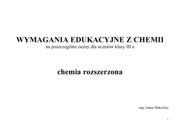 WYMAGANIA EDUKACYJNE Z CHEMII na poszczególne oceny dla uczniów klasy III a chemia rozszerzona mgr Adam Makówka 1 Dział 1 Dysocjacja elektrolityczna. Reakcje w roztworach wodnych elektrolitów. Reakcje zobojętniania i strącania osadów OCENA DOPUSZCZAJĄCY - Wymagania konieczne: Uczeń: zna i rozumie pojęcia: dysocjacja jonowa, elektrolity, nieelektrolity, wskaźniki, reakcja zobojętniania, strącania osadów, iloczyn jonowy wody, iloczyn rozpuszczalności zapisuje równania reakcji dysocjacji prostych kwasów, zasad, soli oraz nazywa powstałe jony definiuje kwasy, zasady, sole w ujęcie teorii dysocjacji Arrheniusa podaje rodzaje odczynów roztworów wśród reakcji przebiegających w roztworach identyfikuje reakcje zobojętniania i strącania osadów zapisuje pod kierunkiem nauczyciela równania reakcji zobojętniania i strącania w formie cząsteczkowej potrafi odczytywać informacje z tablicy rozpuszczalności określa, jak zabarwiają się wskaźniki (fenoloftaleina, oranż metylowy, papierek uniwersalny) w r-rach o różnym odczynie OCENA DOSTATECZNY – Wymagania konieczne + podstawowe Uczeń: klasyfikuje elektrolity według mocy, podaje przykłady elektrolitów mocnych, słabych, o średniej mocy zapisuje równania dysocjacji stopniowej kwasów definiuje pojęcia: stopień dysocjacji, stała dysocjacji, iloczyn jonowy wody, iloczyn rozpuszczalności dokonuje obliczeń dotyczących stopnia dysocjacji, stężenia jonów w roztworze, stężenia cząsteczek niezdysocjowanych, pH wodnych roztworów kwasów i zasad zna prawo rozcieńczeń Ostwalda zapisuje wyrażenie na stałą dysocjacji dowolnego słabego kwasu (z uwzględnieniem dysocjacji stopniowej) i słabej zasady 2 definiuje skalę pH i operuje pojęciem odczyn roztworu znając wartość pH roztworu określa jego odczyn tłumaczy istotę reakcji hydrolizy, wyjaśniając kwasowy lub zasadowy odczyn roztworów wodnych niektórych soli zapisuje samodzielnie równania reakcji zobojętniania, strącania w formie cząsteczkowej podaje, jaki odczyn mogą wykazywać sole w zależności od ich pochodzenia OCENA DOBRY – Wymagania konieczne + podstawowe + rozszerzone Uczeń: korzystając z tabeli rozpuszczalności, podaje przykłady substancji, których zmieszanie spowoduje wytrącanie się podanego osadu potrafi oszacować moc elektrolitu na podstawie wartości stałej dysocjacji, wartości stopnia dysocjacji (podanych lub wyszukanych) zapisuje równania reakcji zobojętniania, strącania także w formie jonowej pełnej i skróconej zapisuje równania reakcji hydrolizy soli, określa jej rodzaje, przewiduje odczyn roztworów soli interpretuje wartość pH roztworu w odniesieniu do odczynu roztworu i stężenia jonów H+ i OH stosuje iloczyn rozpuszczalności do przewidywania możliwości strącania osadu stosuje prawo rozcieńczeń Ostwalda do rozwiązywania zadań OCENA BARDZO DOBRY – Wymagania konieczne + podstawowe + rozszerzone + dopełniające Uczeń: potrafi wykorzystać dane zawarte w tabeli rozpuszczalności do projektowania reakcji strąceniowych projektuje doświadczenia pozwalające na rozróżnienie roztworów kwasowych, zasadowych, obojętnych na podstawie zapisu formy jonowej skróconej zapisuje formą cząsteczkową reakcji strącania, zobojętniania 3 Dział 2 Szybkość reakcji chemicznych. Rząd reakcji Równowaga chemiczna. Stała równowagi. Reguła przekory OCENA DOPUSZCZAJĄCY - Wymagania konieczne: Uczeń: zna i rozumie pojęcia: szybkość reakcji, równanie kinetyczne, stała szybkości reakcji, rząd reakcji, stała równowagi Zdefiniuje pojęcia: wydajność reakcji, stan równowagi chemicznej Poda treść prawa działania mas, reguły przekory Zapisze wyrażenie na stałą równowagi dowolnej reakcji odwracalnej na podstawie równania stechiometrycznego Poda przykłady reakcji odwracalnych, nieodwracalnych Wymieni czynniki wpływające na równowagę podanej reakcji odwracalnej oraz czynniki zakłócające stan równowagi OCENA DOSTATECZNY – Wymagania konieczne + podstawowe Uczeń: przedstawia szybkość reakcji jako funkcję stężenia reagentów i ciśnień cząstkowych reagentów gazowych ocenia wpływ stężeń i ciśnień cząstkowych na na szybkość reakcji ocenia wpływ temperatury na wartość stałej szybkości reakcji interpretuje regułę van Hoffa rozwiązuje zadania dotyczące szybkości i stałej szybkości reakcji dostrzega korelację miedzy rzędem a współczynnikami stechiometrycznymi rozwiązuje proste zadania Dokonuje obliczeń: stałej równowagi, wydajności reakcji 4 Identyfikuje reakcje odwracalne i nieodwracalne na podstawie charakterystyki układu Zapisze treść prawa działania mas za pomocą wzoru Stosuje treść prawa działania mas do konkretnego przykładu reakcji odwracalnej (hydrolizy soli, dysocjacji słabych elektrolitów) OCENA DOBRY – Wymagania konieczne + podstawowe + rozszerzone Uczeń: Dokonuje obliczeń: na podstawie stałej K - stężenia początkowego, stężeń równowagowych; stałej równowagi K po zmianie stężeń początkowych Stosuje regułę przekory dla konkretnych przykładów reakcji Przewiduje kierunek przesunięcia równowagi reakcji pod wpływem zmian stężeń reagentów, temperatury, ciśnienia OCENA BARDZO DOBRY – Wymagania konieczne + podstawowe + rozszerzone + dopełniające Uczeń: projektuje doświadczenia prowadzące do zmiany stanu równowagi chemicznej projektuje doświadczenia prowadzące do otrzymywania produktów reakcji z jak największą wydajnością stosuje zdobyte wiadomości do rozwiązywania zadań o dużym stopniu trudności 5 Dział 3 CHARAKTERYSTYKA NAJWAŻNIEJSZYCH PIERWIASTKÓW BLOKÓW S,P,D UKŁADU OKRESOWEGO OCENA DOPUSZCZAJĄCY – Wymagania konieczne Uczeń: Wie, dlaczego dany pierwiastek należy do określonego bloku energetycznego (s, p, d) Zna i rozumie pojęcia: alotropia Wymienia właściwości fizycznych (stan skupienia, barwa, połysk) pierwiastków poszczególnych grup (Na, K, Mg, Ca, Al., Zn, Fe,