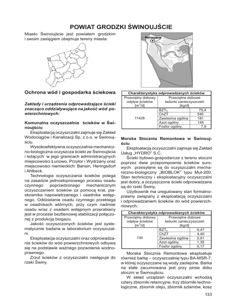 POWIAT GRODZKI ŚWINOUJŚCIE Miasto Świnoujście jest powiatem grodzkim i swoim zasięgiem obejmuje tereny miasta. Ochrona wód i gospodarka ściekowa Zakłady i urządzenia odprowadzające ścieki znacząco oddziaływujące na jakość wód powierzchniowych: Komunalna oczyszczalnia ścieków w Świnoujściu Eksploatacją oczyszczalni zajmuje się Zakład Wodociągów i Kanalizacji Sp. z o.o. w Świnoujściu. Wysokoefektywna oczyszczalnia mechaniczno-biologiczna oczyszcza ścieki ze Świnoujścia i leżących w jego granicach administracyjnych miejscowości Łunowo, Przytor i Wydrzany oraz miejscowości niemieckich: Bansin, Heringsdorf i Ahlbeck. Technologia oczyszczania ścieków polega na zasadzie jednostopniowego procesu osadu czynnego poprzedzonego mechanicznym oczyszczaniem ścieków za pomocą krat, piaskownika napowietrzanego i osadnika wstępnego. Oddzielanie osadu czynnego przebiega w osadnikach wtórnych, przy czym nadmiar osadu wraz z osadem wstępnym przerabiany jest w procesie beztlenowej stabilizacji połączonej z produkcją biogazu. Jakość oczyszczonych ścieków jest systematycznie badana w laboratorium oczyszczalni. Eksploatacja oczyszczalni oraz odprowadzanie ścieków do wód powierzchniowych odbywa się na podstawie ważnego pozwolenia wodnoprawnego. Zrzut ścieków z oczyszczalni następuje do rzeki Świny. Charakterystyka odprowadzanych œcieków Przeciêtny dobowy Przeciêtne dobowe odp³yw œcieków ³adunki zanieczyszczeñ 3 [m /d] [kg/d] BZT5 75,4 ChZT 545 11428 Zawiesina ogólna 181 Azot ogólny 145 Fosfor ogólny 7,9 Morska Stocznia Remontowa w Świnoujściu Eksploatacją oczyszczalni zajmuje się Zakład Usług „HYDRO” S.C. Ścieki bytowo-gospodarcze z terenu stoczni poprzez dwie przepompownie ścieków surowych przesyłane są do oczyszczalni mechaniczno-biologiczny „BIOBLOK” typu Mut-200. Stan techniczny i eksploatacyjny oczyszczalni jest dobry, a oczyszczone ścieki odprowadzane są do rzeki Świny. Użytkownik ma uregulowany stan formalnoprawny związany z eksploatacją oczyszczalni i odprowadzaniem ścieków do wód powierzchniowych. Charakterystyka odprowadzanych œcieków Przeciêtny dobowy Przeciêtne dobowe odp³yw œcieków ³adunki zanieczyszczeñ 3 [m /d] [kg/d] BZT5 0,47 ChZT 4,40 130 Zawiesina ogólna 0,91 Azot ogólny 1,35 Fosfor ogólny 0,17 Morska Stocznia Remontowa eksploatuje również barkę – oczyszczalnię typu BA-MSR-7, w której oczyszczane są wody zaolejone. Barka na stałe zacumowana jest przy pirsie doku stoczni w Świnoujściu. W skład urządzeń oczyszczalni wchodzą cztery zbiorniki retencyjne, trzy zbiorniki technologiczne, zbiornik oleju, zbiornik szlamów, kosz 133 wlewowy z siatką, trzy filtry zanieczyszczeń stałych, zestaw 48 filtrów koalescencyjnych typu FOW, analizator zaolejenia wody oraz wirówka oleju. Z uwagi na to, że oczyszczone ścieki nie spełniały warunków pozwolenia wodnoprawnego, użytkownik został zobowiązany do wykonania instalacji przekazującej te ścieki do zakładowej oczyszczalni mechaniczno-biologicznej. Tutaj następuje dalsze doczyszczenie ścieków. Polska Żegluga Bałtycka S.A. w Kołobrzegu – Baza Promów Morskich w Świnoujściu Eksploatacją dwóch oczyszczalni bazy zajmuje się Zakład Usług „HYDRO” S.C. w Świnoujściu. Z terenu Bazy Promów Morskich PŻB w Świnoujściu ścieki socjalno-bytowe oczyszczane są w bloku oczyszczania biologicznego ścieków „BIOBLOK” typu 200-BIS, w skład którego wchodzą: komora beztlenowo-niedotleniona, komora napowietrzania, dwa osadniki wtórne, komora stabilizacji osadu, zbiornik retencyjny ścieków surowych, stacja dozowania PIX, stacja dozowania podchlorynu sodu, komora kontaktowa, poletka osadowe oraz składowisko osadu. Do oczyszczalni biologicznej kierowane mogą być również ścieki z kontenerowej oczyszczalni ścieków zaolejonych KOCH, w skład której wchodzą: komora sedymentacji wstępnej, komora separacji olejów, komora gromadzenia olejów, komora koagulacji, osadnik wtórny z wkładem wielostrumieniowym, filtr żwirowy. Stan techniczno – eksploatacyjny obu oczyszczalni nie budzi zastrzeżeń, a oczyszczone ścieki odprowadzane są do rzeki Świny. Użytkownik oczyszczalni ścieków w Bazie Promów Morskich w Świnoujściu posiada właściwe pozwolenie wodnoprawne na eksploatację oczyszczalni i odprowadzanie ścieków. Charakterystyka odprowadzanych œcieków Przeciêtny dobowy Przeciêtne dobowe odp³yw œcieków ³adunki zanieczyszczeñ 3 [m /d] [kg/d] BZT5 0,12 ChZT 1,35 Zawiesina ogólna 0,90 50 Azot ogólny 0,95 Fosfor ogólny 0,37 Ekstrakt eterowy b.d. 134 Kontrole w zakresie ochrony wód i gospodarki ściekowej przeprowadzone w 2001 r.: WIOŚ Szczecin na terenie powiatu przeprowadził 3 kontrole w zakresie gospodarki ściekowej i ochrony wód w następujących zakładach: r Zakład Wodociągów i Kanalizacji Świnoujście (Oczyszczalnia komunalna Świnoujście), r Morska Stocznia Remontowa S.A. Świnoujście (Oczyszczalnia wód zaolejonych), r Zakład Usług „HYDRO” s.c. Grzegorz Rąbel (Oczyszczalnia ścieków byt.-gosp. MSR S.A. Świnoujście). Ochrona powietrza Zakłady mające znaczący wpływ na stan zanieczyszczenia powietrza: EUROODRA – ODRAPORT Sp. z o.o., ul. Jana Sołtana 1, Świnoujście Zakład prowadzi chłodnię i przetwórstwo ryb. Kotłownia zakładowa wyposażona jest w dwa kotły olejowe o mocy po 2,4 MW. Emisja zanieczyszczeń do powietrza w 2001 r. wynosiła: - dwutlenek siarki 0,2 Mg/rok - dwutlenek azotu 0,3 Mg/rok - tlenek węgla 0,03 Mg/rok - pył 0,1 Mg/rok Zarząd Morskiego Portu S.A. Szczecin-Świnoujście. Port Handlowy w Świnoujściu Zakład prowadzi przeładunki drobnicy i materiałów sypkich. Kotłownia zakładowa wyposażona w 3 kotły gazowe po 4 MW każdy, emitowała do powietrza w 2001 r.: - dwutlenek siarki 1,43 Mg/rok - tlenek węgla 0,90 Mg/rok - dwutlenek azotu 12,1 Mg/rok - węglowodory miesz. 2,34 Mg/rok DEZA POLSKA, ul. Bytomska 9 Baza przeładun