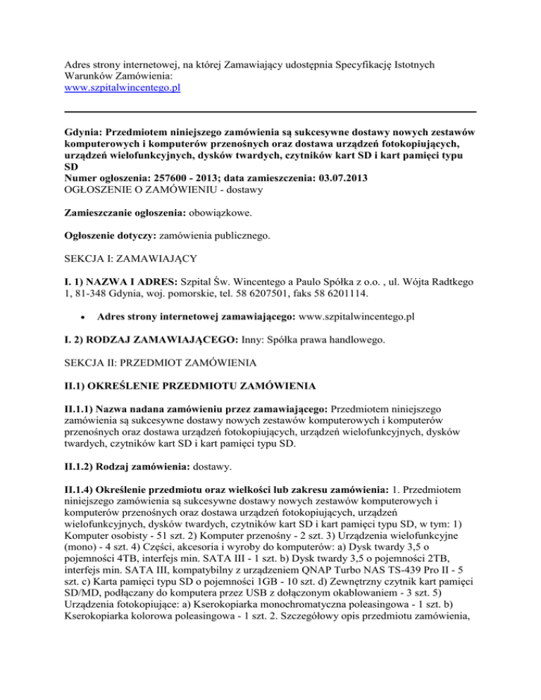 Adres strony internetowej, na której Zamawiający udostępnia Specyfikację Istotnych Warunków Zamówienia: www.szpitalwincentego.pl Gdynia: Przedmiotem niniejszego zamówienia są sukcesywne dostawy nowych zestawów komputerowych i komputerów przenośnych oraz dostawa urządzeń fotokopiujących, urządzeń wielofunkcyjnych, dysków twardych, czytników kart SD i kart pamięci typu SD Numer ogłoszenia: 257600 - 2013; data zamieszczenia: 03.07.2013 OGŁOSZENIE O ZAMÓWIENIU - dostawy Zamieszczanie ogłoszenia: obowiązkowe. Ogłoszenie dotyczy: zamówienia publicznego. SEKCJA I: ZAMAWIAJĄCY I. 1) NAZWA I ADRES: Szpital Św. Wincentego a Paulo Spółka z o.o. , ul. Wójta Radtkego 1, 81-348 Gdynia, woj. pomorskie, tel. 58 6207501, faks 58 6201114. Adres strony internetowej zamawiającego: www.szpitalwincentego.pl I. 2) RODZAJ ZAMAWIAJĄCEGO: Inny: Spółka prawa handlowego. SEKCJA II: PRZEDMIOT ZAMÓWIENIA II.1) OKREŚLENIE PRZEDMIOTU ZAMÓWIENIA II.1.1) Nazwa nadana zamówieniu przez zamawiającego: Przedmiotem niniejszego zamówienia są sukcesywne dostawy nowych zestawów komputerowych i komputerów przenośnych oraz dostawa urządzeń fotokopiujących, urządzeń wielofunkcyjnych, dysków twardych, czytników kart SD i kart pamięci typu SD. II.1.2) Rodzaj zamówienia: dostawy. II.1.4) Określenie przedmiotu oraz wielkości lub zakresu zamówienia: 1. Przedmiotem niniejszego zamówienia są sukcesywne dostawy nowych zestawów komputerowych i komputerów przenośnych oraz dostawa urządzeń fotokopiujących, urządzeń wielofunkcyjnych, dysków twardych, czytników kart SD i kart pamięci typu SD, w tym: 1) Komputer osobisty - 51 szt. 2) Komputer przenośny - 2 szt. 3) Urządzenia wielofunkcyjne (mono) - 4 szt. 4) Części, akcesoria i wyroby do komputerów: a) Dysk twardy 3,5 o pojemności 4TB, interfejs min. SATA III - 1 szt. b) Dysk twardy 3,5 o pojemności 2TB, interfejs min. SATA III, kompatybilny z urządzeniem QNAP Turbo NAS TS-439 Pro II - 5 szt. c) Karta pamięci typu SD o pojemności 1GB - 10 szt. d) Zewnętrzny czytnik kart pamięci SD/MD, podłączany do komputera przez USB z dołączonym okablowaniem - 3 szt. 5) Urządzenia fotokopiujące: a) Kserokopiarka monochromatyczna poleasingowa - 1 szt. b) Kserokopiarka kolorowa poleasingowa - 1 szt. 2. Szczegółowy opis przedmiotu zamówienia, zestawienie wymaganych parametrów granicznych oraz ilości poszczególnego asortymentu zawiera załącznik nr 1 b do SIWZ.. II.1.6) Wspólny Słownik Zamówień (CPV): 30.21.30.00-5, 30.21.31.00-6, 48.62.00.00-0, 48.31.70.00-3, 48.31.60.00-6, 48.99.10.00-1, 30.23.70.00-9, 30.23.21.10-8, 30.12.12.00-5. II.1.7) Czy dopuszcza się złożenie oferty częściowej: tak, liczba części: 5. II.1.8) Czy dopuszcza się złożenie oferty wariantowej: nie. II.2) CZAS TRWANIA ZAMÓWIENIA LUB TERMIN WYKONANIA: Okres w miesiącach: 12. SEKCJA III: INFORMACJE O CHARAKTERZE PRAWNYM, EKONOMICZNYM, FINANSOWYM I TECHNICZNYM III.1) WADIUM Informacja na temat wadium: Zamawiający nie wymaga od Wykonawców wniesienia wadium. III.2) ZALICZKI III.4) INFORMACJA O OŚWIADCZENIACH LUB DOKUMENTACH, JAKIE MAJĄ DOSTARCZYĆ WYKONAWCY W CELU POTWIERDZENIA SPEŁNIANIA WARUNKÓW UDZIAŁU W POSTĘPOWANIU ORAZ NIEPODLEGANIA WYKLUCZENIU NA PODSTAWIE ART. 24 UST. 1 USTAWY III.4.1) W zakresie wykazania spełniania przez wykonawcę warunków, o których mowa w art. 22 ust. 1 ustawy, oprócz oświadczenia o spełnianiu warunków udziału w postępowaniu należy przedłożyć: III.4.2) W zakresie potwierdzenia niepodlegania wykluczeniu na podstawie art. 24 ust. 1 ustawy, należy przedłożyć: oświadczenie o braku podstaw do wykluczenia; aktualny odpis z właściwego rejestru lub z centralnej ewidencji i informacji o działalności gospodarczej, jeżeli odrębne przepisy wymagają wpisu do rejestru lub ewidencji, w celu wykazania braku podstaw do wykluczenia w oparciu o art. 24 ust. 1 pkt 2 ustawy, wystawiony nie wcześniej niż 6 miesięcy przed upływem terminu składania wniosków o dopuszczenie do udziału w postępowaniu o udzielenie zamówienia albo składania ofert; III.4.3) Dokumenty podmiotów zagranicznych Jeżeli wykonawca ma siedzibę lub miejsce zamieszkania poza terytorium Rzeczypospolitej Polskiej, przedkłada: III.4.3.1) dokument wystawiony w kraju, w którym ma siedzibę lub miejsce zamieszkania potwierdzający, że: nie otwarto jego likwidacji ani nie ogłoszono upadłości - wystawiony nie wcześniej niż 6 miesięcy przed upływem terminu składania wniosków o dopuszczenie do udziału w postępowaniu o udzielenie zamówienia albo składania ofert; III.4.4) Dokumenty dotyczące przynależności do tej samej grupy kapitałowej lista podmiotów należących do tej samej grupy kapitałowej w rozumieniu ustawy z dnia 16 lutego 2007 r. o ochronie konkurencji i konsumentów albo informacji o tym, że nie należy do grupy kapitałowej; III.5) INFORMACJA O DOKUMENTACH POTWIERDZAJĄCYCH, ŻE OFEROWANE DOSTAWY, USŁUGI LUB ROBOTY BUDOWLANE ODPOWIADAJĄ OKREŚLONYM WYMAGANIOM W zakresie potwierdzenia, że oferowane roboty budowlane, dostawy lub usługi odpowiadają określonym wymaganiom należy przedłożyć: próbki, opisy lub fotografie produktów, które mają zostać dostarczone, których autentyczność musi zostać poświadczona przez wykonawcę na żądanie zamawiającego; SEKCJA IV: PROCEDURA IV.1) TRYB UDZIELENIA ZAMÓWIENIA IV.1.1) Tryb udzielenia zamówienia: przetarg nieograniczony. IV.2) KRYTERIA OCENY OFERT IV.2.1) Kryteria oceny ofert: najniższa cena. IV.3) ZMIANA UMOWY przewiduje się istotne zmiany postanowień zawartej umowy w stosunku do treści oferty, na podstawie której dokonano wyboru wykonawcy: Dopuszczalne zmiany postanowień umowy oraz określenie warunków zmian 1. Zmiany i uzupełnienia niniejszej umowy wymagają, pod rygorem nieważności formy pisemnej w postaci obustronnie podpisanego aneksu. 2. Istotne zmiany zawartej umowy w stosunku do treści oferty, na podstawie której dokona