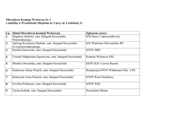 Obwodowa Komisja Wyborcza Nr 1 z siedzibą w Przedszkolu Miejskim nr 5 przy ul. Lechickiej 11 Lp. Skład Obwodowej Komisji Wyborczej Zbigniew Rybicki, zam. Stargard Szczeciński 1. Przewodniczący Jadwiga Kazimiera Drabiuk, zam. Stargard Szczeciński 2. Z-ca przewodniczącego Kamila Sarnowska, zam. Stargard Szczeciński 3. Zgłoszony przez: KW Prawo i Sprawiedliwość KW Platforma Obywatelska RP KWW SMS 4. Urszula Małgorzata Zapotoczna, zam. Stargard Szczeciński Komitet Wyborczy PSL 5. Monika Górzyńska, zam. Stargard Szczeciński KKW SLD Lewica Razem 6. Katarzyna Alicja Wójcik, zam. Stargard Szczeciński Bezpartyjni KWW Waldemara Gila - LPS 7. Katarzyna Anna Warych, zam. Stargard Szczeciński KWW Ruch Narodowy 8. Ewelina Prokorym, zam. Stargard Szczeciński KWW WdS 9. Teresa Kubiak, zam. Stargard Szczeciński Prezydenta Miasta Obwodowa Komisja Wyborcza Nr 2 z siedzibą w Szkole Podstawowej Nr 7 przy placu Majdanek 13 Lp. Skład Obwodowej Komisji Wyborczej Helena Jedynak, zam. Stargard Szczeciński 1. Przewodnicząca Łucja Danuta Duczyńska, zam. Stargard Szczeciński 2. Z-ca przewodniczącej Zofia Krystyna Kowalewska, zam. Stargard Szczeciński 3. Zgłoszony przez: KKW SLD Lewica Razem KW Platforma Obywatelska RP Komitet Wyborczy PSL 4. Ewelina Hawryszków, zam. Stargard Szczeciński Bezpartyjni KWW Waldemara Gila - LPS 5. Oliwia Ewa Jędrych, zam. Stargard Szczeciński KWW Ruch Narodowy 6. Łukasz Kaźmierczak, zam. Stargard Szczeciński KW Prawo i Sprawiedliwość 7. Anna Wiśniewska, zam. Stargard Szczeciński KWW Sławomira Pajora – Stargard XXI 8. Sławomir Kuczyński, zam. Stargard Szczeciński Prezydenta Miasta Obwodowa Komisja Wyborcza Nr 3 z siedzibą w Świetlicy Spółdzielni Mieszkaniowej na osiedlu Zachód A7 Lp. Skład Obwodowej Komisji Wyborczej Natalia Przywara, zam. Stargard Szczeciński 1. Przewodnicząca Stanisław Piekoszewski, zam. Stargard Szczeciński 2. Z-ca przewodniczącej Urszula Kowalczyk, zam. Stargard Szczeciński 3. Zgłoszony przez: KKW SLD Lewica Razem KWW Sławomira Pajora – Stargard XXI KW Platforma Obywatelska RP 4. Monika Beata Izak, zam. Stargard Szczeciński Komitet Wyborczy PSL 5. Agnieszka Górska, zam. Stargard Szczeciński Bezpartyjni KWW Waldemara Gila - LPS 6. Mateusz Głod, zam. Stargard Szczeciński KWW Ruch Narodowy 7. Andrzej Sztucki, zam. Stargard Szczeciński KWW WdS 8. Bożenna Kaczmarczyk, zam. Stargard Szczeciński KW Nowa Prawica – Janusza Korwin Mikke 9. Anna Różycka, zam. Stargard Szczeciński Prezydenta Miasta Obwodowa Komisja Wyborcza Nr 4 z siedzibą w Gimnazjum Nr 3 przy ul. Szkolnej 2 Lp. 1. Zgłoszony przez: KW Nowa Prawica – Janusza Korwin Mikke 3. Skład Obwodowej Komisji Wyborczej Anna Leżała, zam. Stargard Szczeciński Przewodnicząca Teresa Suberlak, zam. Stargard Szczeciński Z-ca przewodniczącej Barbara Justyna Gierduszewska, zam. Stargard Szczeciński 4. Halina Mordal, zam. Stargard Szczeciński KKW SLD Lewica Razem 5. Marek Jaroszewski, zam. Stargard Szczeciński Bezpartyjni KWW Waldemara Gila - LPS 6. Marcin Chodźko, zam. Stargard Szczeciński KW Prawo i Sprawiedliwość 7. Ireneusz Henryk Cylka, zam. Stargard Szczeciński KWW WdS 8. Magdalena Bejm, zam. Stargard Szczeciński KWW Sławomira Pajora – Stargard XXI 9. Mirosław Piotrowicz, zam. Stargard Szczeciński Prezydenta Miasta 2. KW Platforma Obywatelska RP KWW SMS Obwodowa Komisja Wyborcza Nr 5 z siedzibą w Gimnazjum Nr 4 na osiedlu Zachód B15 Lp. 1. 3. Skład Obwodowej Komisji Wyborczej Anna Otolska, zam. Stargard Szczeciński Przewodnicząca Marcin Kazimierz Jasiński, zam. Stargard Szczeciński Z-ca przewodniczącej Katarzyna Marianna Suszka, zam. Stargard Szczeciński KW Platforma Obywatelska RP 4. Barbara Nowakowska, zam. Stargard Szczeciński Komitet Wyborczy PSL 5. Grażyna Miś, zam. Stargard Szczeciński KKW SLD Lewica Razem 6. Aneta Kurzymska, zam. Stargard Szczeciński Bezpartyjni KWW Waldemara Gila - LPS 7. Ewelina Witkowska, zam. Stargard Szczeciński KW Prawo i Sprawiedliwość 8. Wanda Wysocka, zam. Stargard Szczeciński KWW Sławomira Pajora – Stargard XXI 9. Renata Rzepska, zam. Stargard Szczeciński Prezydenta Miasta 2. Zgłoszony przez: KWW Ruch Narodowy KWW Sławomira Pajora i Zofii Ławrynowicz Obwodowa Komisja Wyborcza Nr 6 z siedzibą w Zespole Szkół Nr 2 na osiedlu Zachód B15/a Lp. 1. 3. Skład Obwodowej Komisji Wyborczej Mateusz Grzegorczyk, zam. Stargard Szczeciński Przewodniczący Bogdan Jedynak, zam. Stargard Szczeciński Z-ca przewodniczącego Zofia Domagalska, zam. Stargard Szczeciński 4. Małgorzata Kulesza, zam. Stargard Szczeciński KWW SMS 5. Łukasz Maciej Łopusiewicz, zam. Stargard Szczeciński KW Prawo i Sprawiedliwość 6. Ewa Mirosława Rochnowska, zam. Stargard Szczeciński KW Nowa Prawica – Janusza Korwin Mikke 7. Zbigniew Kułaczkowski, zam. Stargard Szczeciński KWW Sławomira Pajora i Zofii Ławrynowicz 8. Marek Marcin Rzymkowski, zam. Stargard Szczeciński KWW Sławomira Pajora – Stargard XXI 9. Agnieszka Kubiak, zam. Stargard Szczeciński Prezydenta Miasta 2. Zgłoszony przez: KWW Ruch Narodowy KKW SLD Lewica Razem KW Platforma Obywatelska RP Obwodowa Komisja Wyborcza Nr 7 z siedzibą w Przedszkolu Miejskim Nr 4 na osiedlu Zachód B2 Lp. Skład Obwodowej Komisji Wyborczej Daria Żyto, zam. Stargard Szczeciński 1. Przewodnicząca Krystyna Dyczyńska, zam. Stargard Szczeciński 2. Z-ca przewodniczącej Kazimiera Ratajszczak, zam. Stargard Szczeciński 3. Zgłoszony przez: KWW WdS KW Platforma Obywatelska RP Bezpartyjni KWW Waldemara Gila - LPS 4. Wiesława Kremer, zam. Stargard Szczeciński KWW Anety Seredyńskiej 5. Anna Pozorska, zam. Stargard Szczeciński KWW Ruch Narodowy 6. Joanna Anna Matecka, zam. Stargard Szczeciński KW Prawo i Sprawiedliwość 7. Jarosław Leżała, zam. Stargard Szczeciński KW Nowa Prawica – Janusza Korwin Mikke 8. Bogusława Czurak, zam. Stargard Szczeciński KWW Sławomira Pajora i Zofii Ławrynowicz 9. Joanna Szarkiel, zam. Stargard Szczeciński Pr