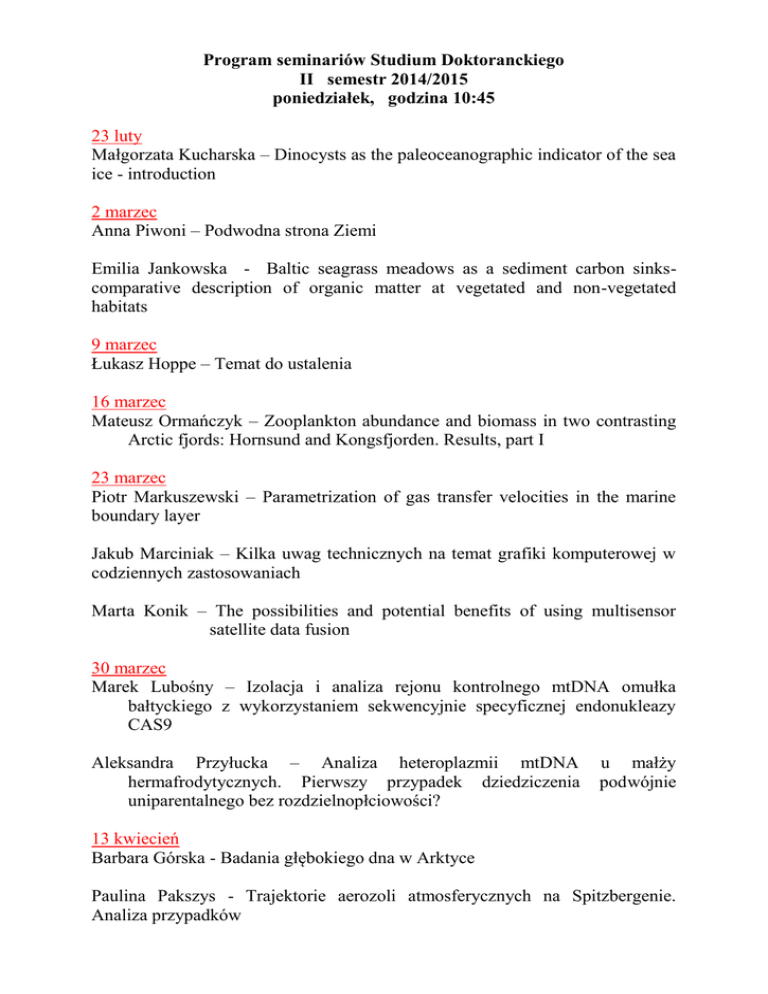 Program seminariów Studium Doktoranckiego II semestr 2014/2015 poniedziałek, godzina 10:45 23 luty Małgorzata Kucharska – Dinocysts as the paleoceanographic indicator of the sea ice - introduction 2 marzec Anna Piwoni – Podwodna strona Ziemi Emilia Jankowska - Baltic seagrass meadows as a sediment carbon sinkscomparative description of organic matter at vegetated and non-vegetated habitats 9 marzec Łukasz Hoppe – Temat do ustalenia 16 marzec Mateusz Ormańczyk – Zooplankton abundance and biomass in two contrasting Arctic fjords: Hornsund and Kongsfjorden. Results, part I 23 marzec Piotr Markuszewski – Parametrization of gas transfer velocities in the marine boundary layer Jakub Marciniak – Kilka uwag technicznych na temat grafiki komputerowej w codziennych zastosowaniach Marta Konik – The possibilities and potential benefits of using multisensor satellite data fusion 30 marzec Marek Lubośny – Izolacja i analiza rejonu kontrolnego mtDNA omułka bałtyckiego z wykorzystaniem sekwencyjnie specyficznej endonukleazy CAS9 Aleksandra Przyłucka – Analiza heteroplazmii mtDNA hermafrodytycznych. Pierwszy przypadek dziedziczenia uniparentalnego bez rozdzielnopłciowości? u małży podwójnie 13 kwiecień Barbara Górska - Badania głębokiego dna w Arktyce Paulina Pakszys - Trajektorie aerozoli atmosferycznych na Spitzbergenie. Analiza przypadków 20 kwiecień Miłosz Grabowski – Methods of determining the rate of sedimentation in the southern Baltic Sea using geological and hydroacoustic techniques Kamila Sfugier – Choroby genetyczne w sztuce Marta Szubska - Specjacja arsenu i rtęci w środowisku morskim 27 kwiecień Małgorzata Merchel - Woda głębinowa w Morzach Nordyckich 4 maj Anna Kubiszyn makroekonomii – Bezrobocie - jedno z podstawowych zagadnień Jagoda Białogrodzka – Dwudziestoletnia zmienność anomalii poziomu Morza Bałtyckiego Ewelina Misiewicz – 11 maj Szymon Smoliński – Identyfikacja stad ryb Małgorzata Nowak - Środowisko Antarktydy w dobie globalnych zmian klimatu 18 maj Magda Małachowicz - Transcriptome analysis of Atlantic cod Gadus morhua L. from the brackish Baltic Sea Michał Czub – Temat do ustalenia