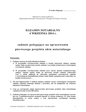 Nr kodu zdającego …………………. Ministerstwo Sprawiedliwości Departament Zawodów Prawniczych i Dostępu do Pomocy Prawnej EGZAMIN NOTARIALNY 4 WRZEŚNIA 2014 r. zadanie polegające na opracowaniu pierwszego projektu aktu notarialnego Pouczenie: 1. Zadanie oznacza się indywidualnym kodem. a. W przypadku rozwiązywania zadania w formie odręcznej, zdający wpisuje numer kodu na pierwszej stronie zadania i na każdej stronie pracy zawierającej rozwiązanie zadania. b. W przypadku rozwiązywania zadania przy użyciu sprzętu komputerowego, zdający wpisuje numer kodu na pierwszej stronie zadania (odręcznie) oraz w oknie aplikacji do zdawania egzaminów prawniczych, zgodnie z wyświetlonym komunikatem (numer kodu będzie automatycznie wstawiany na każdej stronie pracy). 2. Nie jest dopuszczalne w żadnym miejscu zadania i pracy zawierającej rozwiązanie zadania wpisanie własnego imienia i nazwiska, ani też podpisanie się własnym imieniem i nazwiskiem. 3. Czas na rozwiązanie zadań (opracowanie pierwszego projektu aktu notarialnego i opinii prawnej) wynosi 480 minut. 4. Zadanie polegające na opracowaniu pierwszego projektu aktu notarialnego zawarte jest na 3 ponumerowanych stronach (łącznie ze stroną tytułową). W razie braku którejkolwiek ze stron, należy o tym niezwłocznie zawiadomić Komisję Egzaminacyjną. EGZAMIN NOTARIALNY – PIERWSZY PROJEKT AKTU NOTARIALNEGO 1 Tadeusz Kowal oraz Gamma spółka z ograniczoną odpowiedzialnością z siedzibą w Warszawie chcą zawrzeć umowę spółki z ograniczoną odpowiedzialnością pod firmą Alfa – Finanse spółka z ograniczoną odpowiedzialnością. Spółka ma mieć siedzibę w Warszawie i kapitał zakładowy w wysokości 500.000 zł. Tadeusz Kowal ma objąć 400 udziałów o wartości nominalnej po 1.000 zł. Gamma spółka z ograniczoną odpowiedzialnością ma objąć 100 udziałów o wartości nominalnej po 1.000 zł. Udziały Tadeusza Kowala mają być pokryte wkładem niepieniężnym w postaci prawa własności nieruchomości położonej w Warszawie przy ul. Kwiatowej 550, dla której Sąd Rejonowy dla Warszawy-Mokotowa w Warszawie prowadzi księgę wieczystą nr WA1M/00001235/9. Tadeusz Kowal określa wartość (rynkową) wnoszonego wkładu na 2.000.000 zł. Gamma spółka z ograniczoną odpowiedzialnością wnosi do zawiązywanej spółki wkłady niepieniężne w postaci 50 udziałów w Delta spółce z ograniczoną odpowiedzialnością z siedzibą w Gdańsku o wartości nominalnej po 1.000 zł, których wartość (rynkową) spółka określa na 500.000 zł. Gamma spółka z ograniczoną odpowiedzialnością ma 3 wspólników, a jedynym członkiem jej zarządu jest Tadeusz Kowal, który ma być zarazem wspólnikiem zawiązywanej spółki Alfa – Finanse. Kapitał zakładowy spółki Gamma wynosi 2.000.000 zł. Wspólnicy przewidują co do spółki, która ma być zawiązana, następujące okoliczności: 1) spółka prowadzić ma działalność usługową w zakresie informacji (dział 63 PKD), 2) w skład jej zarządu jednoosobowego ma wejść Klemens Kowal (syn Tadeusza Kowala), 3) wyłączone ma być prawo indywidualnej kontroli wspólników, 4) zbycie udziału ma być uzależnione od zgody spółki, 5) nie przewiduje się istnienia komisji rewizyjnej, 6) przewidziana ma być możliwość podwyższenia kapitału zakładowego bez zmiany umowy spółki, 7) wspólnicy mają być zobowiązani do dopłat, 8) udziały wspólnika Tadeusza Kowala mają być uprzywilejowane co do dywidendy oraz co do głosu, 9) wspólnicy przewidują wypłacanie zaliczek na poczet dywidendy za rok obrotowy, 10) wspólnicy przewidują nabycie od Delta - BIS spółki z ograniczoną odpowiedzialnością z siedzibą w Warszawie, za kwotę 1.000.000 zł, nieruchomości położonej w Warszawie przy ul. Kwiatowej 551 - sąsiedniej wobec wniesionej przez Tadeusza Kowala; na nabycie tej nieruchomości nie będzie wymagana osobna uchwała wspólników, 2 EGZAMIN NOTARIALNY – PIERWSZY PROJEKT AKTU NOTARIALNEGO 11) umowa spółki ma przewidywać możliwość przymusowego umorzenia udziałów wspólników. W oparciu o podany wyżej stan faktyczny proszę sporządzić, jako notariusz Michał Nowak prowadzący kancelarię notarialną w Warszawie, projekt aktu notarialnego obejmującego umowę spółki z ograniczoną odpowiedzialnością, bez konieczności zamieszczania podpisów. Konieczne jest przyjęcie brakujących, a niezbędnych do sporządzenia prawidłowej umowy spółki, elementów stanu faktycznego wraz ze wskazaniem właściwych oznaczeń podmiotów oraz prawidłowe określenie reprezentacji stron przy zawieraniu umowy. W umowie należy zawrzeć również powołanie koniecznych organów. Wymagane jest wskazanie prawidłowo obliczonych taksy notarialnej i podatków. EGZAMIN NOTARIALNY – PIERWSZY PROJEKT AKTU NOTARIALNEGO 3