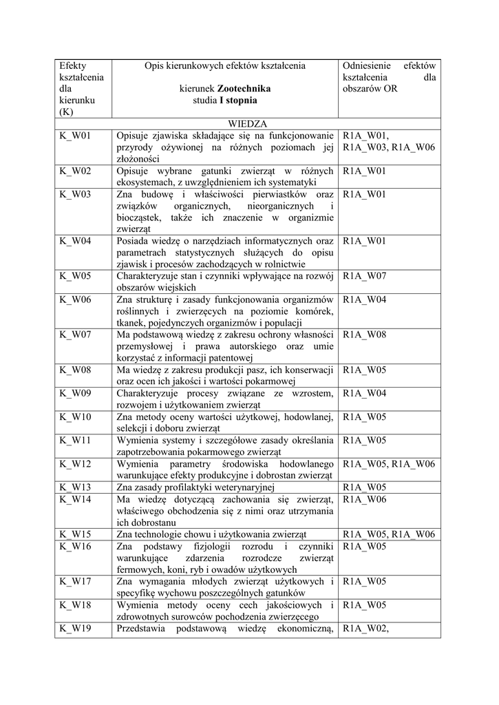 Efekty kształcenia dla kierunku (K) K_W01 K_W02 K_W03 K_W04 K_W05 K_W06 K_W07 K_W08 K_W09 K_W10 K_W11 K_W12 K_W13 K_W14 K_W15 K_W16 K_W17 K_W18 K_W19 Opis kierunkowych efektów kształcenia kierunek Zootechnika studia I stopnia WIEDZA Opisuje zjawiska składające się na funkcjonowanie przyrody ożywionej na różnych poziomach jej złożoności Opisuje wybrane gatunki zwierząt w różnych ekosystemach, z uwzględnieniem ich systematyki Zna budowę i właściwości pierwiastków oraz związków organicznych, nieorganicznych i biocząstek, także ich znaczenie w organizmie zwierząt Posiada wiedzę o narzędziach informatycznych oraz parametrach statystycznych służących do opisu zjawisk i procesów zachodzących w rolnictwie Charakteryzuje stan i czynniki wpływające na rozwój obszarów wiejskich Zna strukturę i zasady funkcjonowania organizmów roślinnych i zwierzęcych na poziomie komórek, tkanek, pojedynczych organizmów i populacji Ma podstawową wiedzę z zakresu ochrony własności przemysłowej i prawa autorskiego oraz umie korzystać z informacji patentowej Ma wiedzę z zakresu produkcji pasz, ich konserwacji oraz ocen ich jakości i wartości pokarmowej Charakteryzuje procesy związane ze wzrostem, rozwojem i użytkowaniem zwierząt Zna metody oceny wartości użytkowej, hodowlanej, selekcji i doboru zwierząt Wymienia systemy i szczegółowe zasady określania zapotrzebowania pokarmowego zwierząt Wymienia parametry środowiska hodowlanego warunkujące efekty produkcyjne i dobrostan zwierząt Zna zasady profilaktyki weterynaryjnej Ma wiedzę dotyczącą zachowania się zwierząt, właściwego obchodzenia się z nimi oraz utrzymania ich dobrostanu Zna technologie chowu i użytkowania zwierząt Zna podstawy fizjologii rozrodu i czynniki warunkujące zdarzenia rozrodcze zwierząt fermowych, koni, ryb i owadów użytkowych Zna wymagania młodych zwierząt użytkowych i specyfikę wychowu poszczególnych gatunków Wymienia metody oceny cech jakościowych i zdrowotnych surowców pochodzenia zwierzęcego Przedstawia podstawową wiedzę ekonomiczną, Odniesienie efektów kształcenia dla obszarów OR R1A_W01, R1A_W03, R1A_W06 R1A_W01 R1A_W01 R1A_W01 R1A_W07 R1A_W04 R1A_W08 R1A_W05 R1A_W04 R1A_W05 R1A_W05 R1A_W05, R1A_W06 R1A_W05 R1A_W06 R1A_W05, R1A_W06 R1A_W05 R1A_W05 R1A_W05 R1A_W02, K_U01 K_U02 K_U03 K_U04 K_U05 K_U06 K_U07 K_U08 K_U09 K_U10 K_U11 K_U12 K_U13 K_U14 K_U15 K_U16 K_U17 K_U18 prawną i społeczną niezbędną do organizowania produkcji rolniczej i funkcjonowania społeczności obszarów wiejskich UMIEJĘTNOŚCI Dokonuje pomiarów i wyznacza wartości oraz ocenia wiarygodność podstawowych wielkości statystycznych, chemicznych, biochemicznych i fizjologicznych Posługuje się systemami informatycznymi wykorzystywanymi w rolnictwie Ocenia zależności między strukturą a funkcją na poziomie komórek, tkanek, pojedynczych organizmów i populacji Ocenia wskaźniki ekologiczne populacji zwierząt Posługuje się podstawowymi technikami laboratoryjnymi Analizuje zagrożenia i korzyści wynikające z właściwości roślin w stosunku do zwierząt i ocenia możliwość prowadzenia produkcji pasz na gruntach ornych i trwałych użytkach zielonych Potrafi określić zapotrzebowanie zwierząt na składniki pokarmowe oraz dobrać odpowiednie pasze i dodatki dla zbilansowania ich wymagań pokarmowych Wykonuje preliminarz pasz z uwzględnieniem zasad produkcji i sposobu ich pozyskiwania Potrafi ocenić dobrostan zwierząt Potrafi wykorzystywać optymalne technologie chowu zwierząt do poprawy efektywności produkcji i jakości produktów zwierzęcych Potrafi kierować użytkowaniem rozpłodowym zwierząt Posługuje się wiedzą niezbędną do prowadzenia pasieki; posiada umiejętność rozróżniania kast pszczół i prowadzenia przeglądu rodziny pszczelej Umie charakteryzować gatunki ryb śródlądowych, zna biotechnologie ich chowu oraz potrafi wykorzystywać wiedzę w planowaniu produkcji ryb Potrafi zarządzać stadem zwierząt Potrafi oceniać jakość produktów pochodzenia zwierzęcego Interpretuje podstawowe prawodawstwo dotyczące rolnictwa Wykonuje samodzielnie lub w zespole pod kierunkiem opiekuna proste zadania projektowe dotyczące hodowli zwierząt i ich użytkowania Korzysta na poziomie podstawowym z literatury w języku polskim oraz języku obcym zgodnie z wymogami określonymi dla poziomu B2 R1A_W07, R1A_W09 R1A_U01 R1A_U03 R1A_U01 R1A_U05 R1A_U06 R1A_U05, R1A_U07 R1A_U03, R1A_U05 R1A_U03, R1A_U04 R1A_U05, R1A_U06 R1A_U06 R1A_U05, R1A_U06 R1A_U06 R1A_U06 R1A_U07 R1A_U06 R1A_U07 R1A_U04 R1A_U10 K_U19 K_U20 K_U21 K_U22 K_U23 K_K01 K_K02 K_K03 K_K04 K_K05 K_K06 K_K07 K_K08 Europejskiego Systemu Opisu Kształcenia Językowego Potrafi posługiwać się miernikami społecznoekonomicznymi w ocenie rynku rolniczego oraz podejmowania decyzji Wykorzystuje rachunek ekonomiczny w podejmowaniu krótko i długookresowych decyzji w zakresie działalności gospodarczej i rolniczej Posiada umiejętność porozumiewania się z podmiotami z obszaru rolnictwa z wykorzystaniem różnych technik komunikowania się Potrafi przygotować i przedstawić udokumentowane źródłowo opracowania i prelekcje w języku polskim i wybranym języku obcym dotyczące studiowanego kierunku z wykorzystaniem technik komputerowych Wykonuje opis i ocenę pokroju, zabiegi pielęgnacyjne oraz przygotowanie koni do użytkowania jeździeckiego Kompetencje społeczne Posiada umiejętność pracy indywidualnej i zespołowej w rozwiązywaniu problemów Wykazuje wrażliwość na potrzeby zwierząt oraz ich dobrostan Wykazuje świadomość potrzeby dokształcania się i samodoskonalenia oraz uczenia się przez całe życie w zakresie studiowanego kierunku Wykazuje zrozumienie roli zespołowego działania w związkach hodowców zwierząt i instytucjach doradztwa rolniczego Jest odpowiedzialny za bezpieczeństwo pracy własnej i innych Ma świadomość wpływu intensywnej produkcji rolniczej na środowi