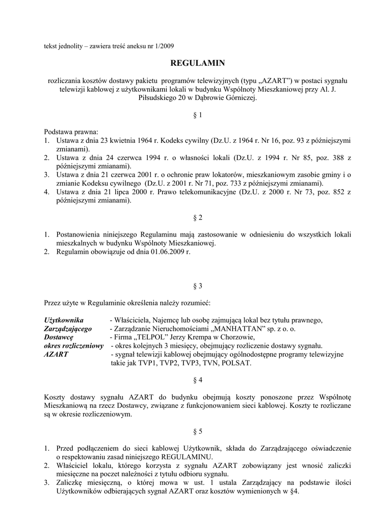 tekst jednolity – zawiera treść aneksu nr 1/2009 REGULAMIN rozliczania kosztów dostawy pakietu programów telewizyjnych (typu „AZART”) w postaci sygnału telewizji kablowej z użytkownikami lokali w budynku Wspólnoty Mieszkaniowej przy Al. J. Piłsudskiego 20 w Dąbrowie Górniczej. §1 Podstawa prawna: 1. Ustawa z dnia 23 kwietnia 1964 r. Kodeks cywilny (Dz.U. z 1964 r. Nr 16, poz. 93 z późniejszymi zmianami). 2. Ustawa z dnia 24 czerwca 1994 r. o własności lokali (Dz.U. z 1994 r. Nr 85, poz. 388 z późniejszymi zmianami). 3. Ustawa z dnia 21 czerwca 2001 r. o ochronie praw lokatorów, mieszkaniowym zasobie gminy i o zmianie Kodeksu cywilnego (Dz.U. z 2001 r. Nr 71, poz. 733 z późniejszymi zmianami). 4. Ustawa z dnia 21 lipca 2000 r. Prawo telekomunikacyjne (Dz.U. z 2000 r. Nr 73, poz. 852 z późniejszymi zmianami). §2 1. Postanowienia niniejszego Regulaminu mają zastosowanie w odniesieniu do wszystkich lokali mieszkalnych w budynku Wspólnoty Mieszkaniowej. 2. Regulamin obowiązuje od dnia 01.06.2009 r. §3 Przez użyte w Regulaminie określenia należy rozumieć: Użytkownika Zarządzającego Dostawcę okres rozliczeniowy AZART - Właściciela, Najemcę lub osobę zajmującą lokal bez tytułu prawnego, - Zarządzanie Nieruchomościami „MANHATTAN” sp. z o. o. - Firma „TELPOL” Jerzy Krempa w Chorzowie, - okres kolejnych 3 miesięcy, obejmujący rozliczenie dostawy sygnału. - sygnał telewizji kablowej obejmujący ogólnodostępne programy telewizyjne takie jak TVP1, TVP2, TVP3, TVN, POLSAT. §4 Koszty dostawy sygnału AZART do budynku obejmują koszty ponoszone przez Wspólnotę Mieszkaniową na rzecz Dostawcy, związane z funkcjonowaniem sieci kablowej. Koszty te rozliczane są w okresie rozliczeniowym. §5 1. Przed podłączeniem do sieci kablowej Użytkownik, składa do Zarządzającego oświadczenie o respektowaniu zasad niniejszego REGULAMINU. 2. Właściciel lokalu, którego korzysta z sygnału AZART zobowiązany jest wnosić zaliczki miesięczne na poczet należności z tytułu odbioru sygnału. 3. Zaliczkę miesięczną, o której mowa w ust. 1 ustala Zarządzający na podstawie ilości Użytkowników odbierających sygnał AZART oraz kosztów wymienionych w §4. 4. Zaliczki miesięczne należy wnosić w terminach ustalonych dla innych opłat wnoszonych przez właścicieli lokali. 5. Przed odłączeniem od sieci kablowej, Użytkownik składa do Zarządzającego oświadczenie, o rezygnacji z dostawy sygnału AZART ze skutkiem na ostatni dzień miesiąca. 6. W przypadku uszkodzenia instalacji AZART w lokalu Użytkownika z jego winy, właściciel lokalu poniesie zryczałtowane koszty naprawy instalacji. Zryczałtowana kwota wynosi 70,00 zł i podlega wpłacie na konto Dostawcy w terminie 30 dni od daty wykonania naprawy potwierdzonej protokółem odbioru. 7. W przypadku zalegania właściciela lokalu z opłatami za koszty zarządu nieruchomością wspólną powyżej ich dwumiesięcznej wartości, Zarządzający wydaje polecenie Dostawcy odcięcia sygnału AZART. Ponowne podłączenie może nastąpić po uregulowaniu przez Użytkownika całości w/w zobowiązań . §6 1. Po zakończeniu okresu rozliczeniowego, Zarządzający dokonuje rozliczenia kosztów dostawy sygnału AZART. Koszt dostawy sygnału do jednego Użytkownika zostaje ustalony jako iloraz kosztów dostawy wymienionych w §4 oraz liczby Użytkowników odbierających sygnał. K1 = K L gdzie: K1 = koszt dostawy sygnału AZART do jednego Użytkownika, K = koszt dostawy sygnału AZART do budynku, L = liczba Użytkowników odbierających sygnał AZART. §7 1. Jeżeli w wyniku rozliczenia kosztów dostawy sygnału AZART nastąpi nadpłata, wysokość nadpłaty zostaje zaliczona na poczet zaległych lub bieżących opłat miesięcznych właściciela związanych z utrzymaniem jego lokalu. 2. Jeżeli suma zaliczek miesięcznych nie pokryje należności wynikającej z rozliczenia (niedopłata), właściciel lokalu zobowiązany jest dopłacić brakującą kwotę równocześnie z najbliższą wpłatą należności na opłaty związane z utrzymaniem jego lokalu. §8 Regulamin został zatwierdzony Uchwałą Zebrania Wspólnoty Mieszkaniowej nr 7/2003 z dnia 06.03.2003 r. Aneks został zatwierdzony Uchwałą Wspólnoty Mieszkaniowej nr 20/2009 z dnia 26.06.2009 r.