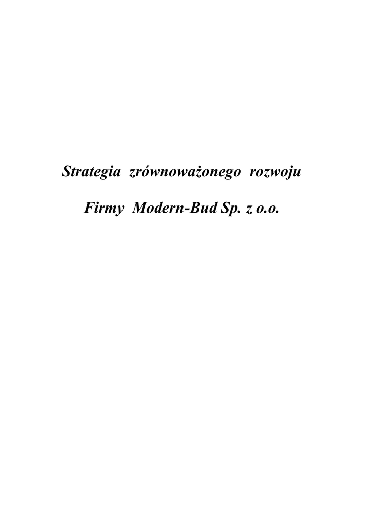 Strategia zrównoważonego rozwoju Firmy Modern-Bud Sp. z o.o. Spis Treści: 1. Cel raportu 2. Historia i profil firmy 3. Wizja i misja firmy w oparciu o strategie zrównoważonego rozwoju 3.1 Prawa konsumenta 3.2 Odpowiedzialność producenta i sprzedawcy 3.3 Polityka firmy a przestrzeganie praw pracowniczych 3.4 Polityka firmy w obszarze ochrony środowiska 3.5 Działalność prospołeczna 4. Podsumowanie 1. Cel raportu Zadaniem raportu jest przedstawienie celów i wyników realizowanej przez firmę polityki pod kątem zrównoważonego rozwoju. Poniżej przedstawiamy osiągnięcia Firmy w zakresie Społecznej Odpowiedzialności Biznesu, według tego podejścia bycie odpowiedzialnym nie oznacza tylko spełnianie przez Firmę wszystkich wymogów formalnych i prawnych, ale przede wszystkim zwiększone inwestycje w zasoby ludzkie, w ochronę środowiska, w relacje z kontrahentami oraz utrzymywanie dobrych stosunków z otoczeniem. Odpowiedzialny biznes to skuteczna strategia zarządzania, która przyczynia się do wzrostu konkurencyjności firmy jak również skuteczne narzędzie do kształtowania stosunków międzyludzkich. 2. Historia i profil firmy Przedsiębiorstwo Usługowo Handlowe MODERN-BUD powstało w roku 1990r., a od 2001r. działa jako Spółka z ograniczona odpowiedzialnością. Siedziba Spółki znajduje sie, przy ul. Zabłocie 7 w Krakowie, w obiektach dzierżawionych od PKP. Podstawowa działalnością firmy jest działalność usługowa związana z wykonywaniem wielkopowierzchniowych elewacji budynków, ich izolacja termiczna, a także inne prace wykończeniowe i budowlane wykonywanie wylewek, prace murarskie. Firma wykonuje roboty budowlane dla inwestorów indywidualnych oraz jako podwykonawca dużych firm budowlanych. Posiadane wyposażenie techniczne - rusztowania systemu PLETAC, DELTA (przeznaczone do wielokrotnego użytku) wykonane są z ram stalowych ocynkowanych, posiada certyfikat bezpieczeństwa. Posiadamy własne agregaty i elektronarzędzia niezbędne do świadczenia usług. Spółka prowadzi również działalność handlową - handel hurtowy oraz detaliczny materiałami budowlanymi i wykończeniowymi. Obecnie dzięki dotacji z UE firma nasza utworzyła nową gałąź jaką jest produkcja styropianu i cemento-styropianu o innowacyjnych właściwościach chemicznych i mechanicznych. Przedsiębiorstwo nasze należy do grona firm, które biorą udział w przetargach na wykonawstwo prac budowlanych organizowanych w Krakowie, województwie małopolskim, a także na terenie województwa śląskiego. Mając wypracowana pozycje na rynku usług remontowo-budowlanych. MODERNBUD jest stałym partnerem firm: Chemobudowa-Kraków, Budostal-2, Budimex-Dromex, Rebau oraz dla developerów. 3. Wizja i misja firmy w oparciu o strategie zrównoważonego rozwoju W naszej Firmie najbardziej cenimy profesjonalizm i rzetelność oraz innowacyjność. „Klient nie kupuje u nas towaru tylko zadowolenie - Jesteśmy o krok przed konkurencją”– tak brzmi hasło przewodnie polityki jakości naszej firmy. Misję Firmy realizujemy poprzez: Systematyczne badanie satysfakcji klientów; Budowanie silnego zespołu współpracowników w celu realizacji założonych zadań; Przestrzeganie zasady odpowiedzialności każdego pracownika za jakość wykonywanej pracy, a w szczególności za zapobieganie niezgodnością; Zapewnienie do produkcji materiałów gwarantujących uzyskanie założonej jakości wyrobów; Systematyczny przegląd ustanowionego systemu i ciągłe jego doskonalenie. 3.1 Prawa konsumenta Firma Modern-Bud Sp. z o.o oferuje klientom bogatą ofertę wyrobów w najlepszej jakości. Rodzinny charakter przedsiębiorstwa i mało rozbudowana struktura organizacyjna ułatwia nam współpracę z klientem. Staramy się aby każda osoba obsługiwana był na jak najwyższym poziomie. W każdej chwili pracownicy Firmy służą klientom swoją wiedzą i doświadczeniem. System dystrybucji w połączeniu ze sprawnie działającym działem logistycznym pozwala na terminowe dostarczanie naszych produktów do odbiorców. 3.2 Odpowiedzialność producenta i sprzedawcy Potwierdzeniem wysokiej jakości produktów Firmy P.U.H. Modern-Bud Sp. z o.o. są uzyskane Certyfikaty Autoryzowanego wykonawcy miedzy innymi firmy BASF, CAPAROL. Posiadamy Aprobaty Techniczne na produkowane przez nas towary uzyskane w Instytucie w Pradze. Jednak w celu ciągłej kontroli Firma przeprowadza systematyczne badania jakości swoich wyrobów. Pobieraniem próbek oraz dokonywania pomiarów parametrów jakościowych zajmuje się technolog produkcji. Posiadamy własne laboratorium w którym na bieżąco prowadzona jest kontrola produkowanego asortymentu. Przedsiębiorstwo współpracuje z wieloma instytucjami naukowymi w celu osiągania i zapewnienia jak najlepszej jakości produkowanych wyrobów. 3.3 Polityka firmy a przestrzeganie praw pracowniczych Największym kapitałem naszej Firmy są jej pracownicy, bez których niemożliwe byłoby istnienie. Polityka kadrowa Firmy ma na celu zapewnienie najwyższych standardów równego traktowania i równych szans pracowników. Jednakowo traktujemy wszystkich pracowników - niezależnie od płci, wieku, koloru skóry, religii czy też stopnia niepełnosprawności – wszyscy mają u nas równe szanse. Dla nas przy zatrudnieniu liczy się tylko profesjonalne i odpowiedzialne podejście do wykonywanych obowiązków. Przy zatrudnianiu nowych pracowników oczekujemy od nich określonych kwalifikacji, umiejętności i doświadczenia zgodnych w wymaganiami stanowiska. 3.4 Polityka firmy w obszarze ochrony środowiska W Firmie Modern-Bud Sp z o.o. podejmujemy wszelkie działania, aby minimalizować negatywny wpływ na środowisko naturalne. Naszym celem jest prowadzenie działalności w sposób ograniczający do minimum szkodliwe oddziaływanie na środowisko. W naszej technologii produkcyjnej wykorzystujemy odpady styropianu z produkcji oraz odpad styropianowy pozyskany z rynku od wykon