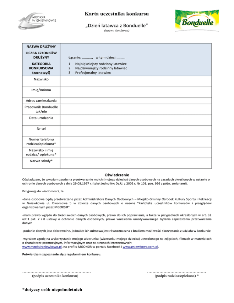 Karta uczestnika konkursu „Dzień latawca z Bonduelle” (nazwa konkursu) NAZWA DRUŻYNY LICZBA CZŁONKÓW DRUŻYNY Łącznie: .........., w tym dzieci: ........ KATEGORIA KONKURSOWA (zaznaczyć) 1. Najpiękniejszy rodzinny latawiec 2. Najdziwniejszy rodzinny latawiec 3. Profesjonalny latawiec Nazwisko Imię/Imiona Adres zamieszkania Pracownik Bonduelle tak/nie Data urodzenia Nr tel Numer telefonu rodzica/opiekuna* Nazwisko i imię rodzica/ opiekuna* Nazwa szkoły* Oświadczenie Oświadczam, że wyrażam zgodę na przetwarzanie moich (mojego dziecka) danych osobowych na zasadach określonych w ustawie o ochronie danych osobowych z dnia 29.08.1997 r. (tekst jednolity: Dz.U. z 2002 r. Nr 101, poz. 926 z późn. zmianami). Przyjmuję do wiadomości, że: -dane osobowe będą przetwarzane przez Administratora Danych Osobowych – Miejsko-Gminny Ośrodek Kultury Sportu i Rekreacji w Gniewkowie ul. Dworcowa 5 w zbiorze danych osobowych o nazwie "Kartoteka uczestników konkursów i przeglądów organizowanych przez MGOKSiR" -mam prawo wglądu do treści swoich danych osobowych, prawo do ich poprawiania, a także w przypadkach określonych w art. 32 ust.1 pkt. 7 i 8 ustawy o ochronie danych osobowych, prawo wniesienia umotywowanego żądania zaprzestania przetwarzania danych -podanie danych jest dobrowolne, jednakże ich odmowa jest równoznaczna z brakiem możliwości skorzystania z udziału w konkursie -wyrażam zgodę na wykorzystanie mojego wizerunku (wizerunku mojego dziecka) utrwalonego na zdjęciach, filmach w materiałach o charakterze promocyjnym, informacyjnym oraz na stronach internetowych: www.mgoksirgniewkowo.pl, na profilu MGOKSIR w portalu facebook i www.gniewkowo.com.pl. Potwierdzam zapoznanie się z regulaminem konkursu. .................................................. (podpis uczestnika konkursu) *dotyczy osób niepełnoletnich ........................................... (podpis rodzica/opiekuna) *