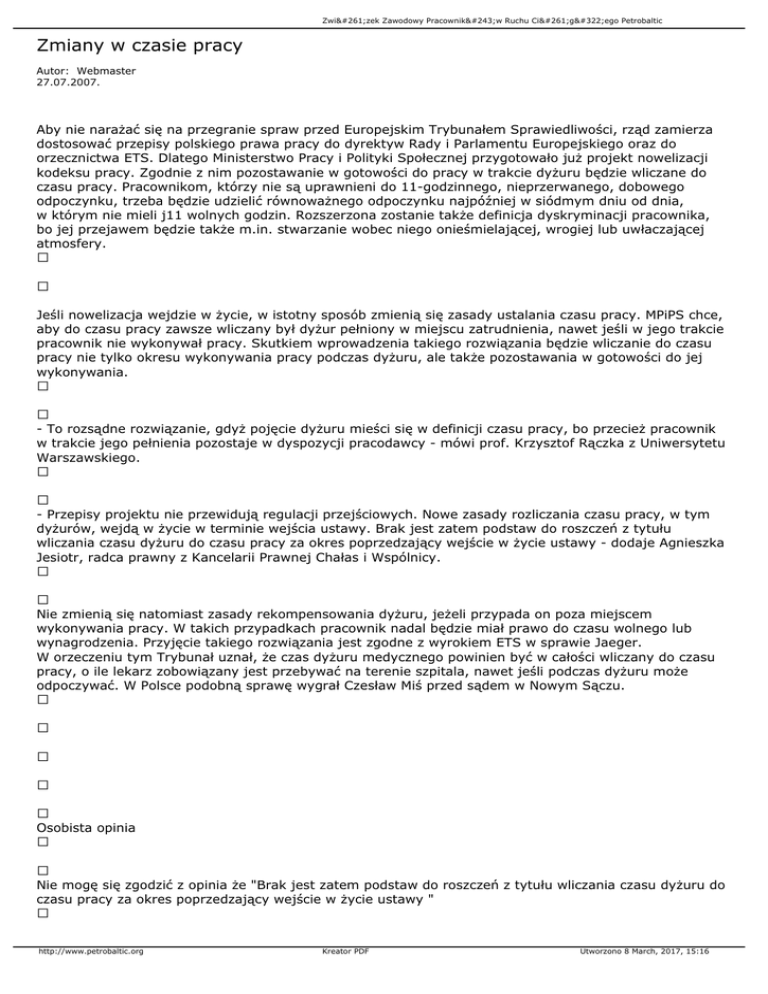 Związek Zawodowy Pracowników Ruchu Ciągłego Petrobaltic Zmiany w czasie pracy Autor: Webmaster 27.07.2007. Aby nie narażać się na przegranie spraw przed Europejskim Trybunałem Sprawiedliwości, rząd zamierza dostosować przepisy polskiego prawa pracy do dyrektyw Rady i Parlamentu Europejskiego oraz do orzecznictwa ETS. Dlatego Ministerstwo Pracy i Polityki Społecznej przygotowało już projekt nowelizacji kodeksu pracy. Zgodnie z nim pozostawanie w gotowości do pracy w trakcie dyżuru będzie wliczane do czasu pracy. Pracownikom, którzy nie są uprawnieni do 11-godzinnego, nieprzerwanego, dobowego odpoczynku, trzeba będzie udzielić równoważnego odpoczynku najpóźniej w siódmym dniu od dnia, w którym nie mieli j11 wolnych godzin. Rozszerzona zostanie także definicja dyskryminacji pracownika, bo jej przejawem będzie także m.in. stwarzanie wobec niego onieśmielającej, wrogiej lub uwłaczającej atmosfery. Jeśli nowelizacja wejdzie w życie, w istotny sposób zmienią się zasady ustalania czasu pracy. MPiPS chce, aby do czasu pracy zawsze wliczany był dyżur pełniony w miejscu zatrudnienia, nawet jeśli w jego trakcie pracownik nie wykonywał pracy. Skutkiem wprowadzenia takiego rozwiązania będzie wliczanie do czasu pracy nie tylko okresu wykonywania pracy podczas dyżuru, ale także pozostawania w gotowości do jej wykonywania. - To rozsądne rozwiązanie, gdyż pojęcie dyżuru mieści się w definicji czasu pracy, bo przecież pracownik w trakcie jego pełnienia pozostaje w dyspozycji pracodawcy - mówi prof. Krzysztof Rączka z Uniwersytetu Warszawskiego. - Przepisy projektu nie przewidują regulacji przejściowych. Nowe zasady rozliczania czasu pracy, w tym dyżurów, wejdą w życie w terminie wejścia ustawy. Brak jest zatem podstaw do roszczeń z tytułu wliczania czasu dyżuru do czasu pracy za okres poprzedzający wejście w życie ustawy - dodaje Agnieszka Jesiotr, radca prawny z Kancelarii Prawnej Chałas i Wspólnicy. Nie zmienią się natomiast zasady rekompensowania dyżuru, jeżeli przypada on poza miejscem wykonywania pracy. W takich przypadkach pracownik nadal będzie miał prawo do czasu wolnego lub wynagrodzenia. Przyjęcie takiego rozwiązania jest zgodne z wyrokiem ETS w sprawie Jaeger. W orzeczeniu tym Trybunał uznał, że czas dyżuru medycznego powinien być w całości wliczany do czasu pracy, o ile lekarz zobowiązany jest przebywać na terenie szpitala, nawet jeśli podczas dyżuru może odpoczywać. W Polsce podobną sprawę wygrał Czesław Miś przed sądem w Nowym Sączu. Osobista opinia Nie mogę się zgodzić z opinia że "Brak jest zatem podstaw do roszczeń z tytułu wliczania czasu dyżuru do czasu pracy za okres poprzedzający wejście w życie ustawy " http://www.petrobaltic.org Kreator PDF Utworzono 8 March, 2017, 15:16 Związek Zawodowy Pracowników Ruchu Ciągłego Petrobaltic Podstaw prawnych jest aż nadto. Począwszy od Konstytucji w której jest mowa o wyższości umów międzynarodowych nad nią samom. Umową tą jest traktat o przystąpieniu do Unii Europejskiej. To w tym traktacie jest odniesienie do minimalnych praw jakie państwa członkowskie muszą zagwarantować swoim pracownikom. Natomiast sam wyrok Europejskiego Trybunału Sprawiedliwości z samej jego intencji mówi że czas pracy jest pozostawanie w dyspozycji pracodawcy niezależnie od stopnia wykonywania pracy czy tez brakiem jej wykonywania. Ponieważ ustawodawca przewidział tylko dwa rodzaje czasów - Pracy i odpoczynku. Jako że dyżur nie można zaliczyć do odpoczynku musi zostać zaliczony do czasu pracy. I tak drodzy prawnicy powinno być stanowione prawo. Bez takich potworków jak "bezzwłocznie w ciągu 7 dni lud do końca okresu rozliczeniowego" np. 6 miesięcznego http://www.petrobaltic.org Kreator PDF Utworzono 8 March, 2017, 15:16