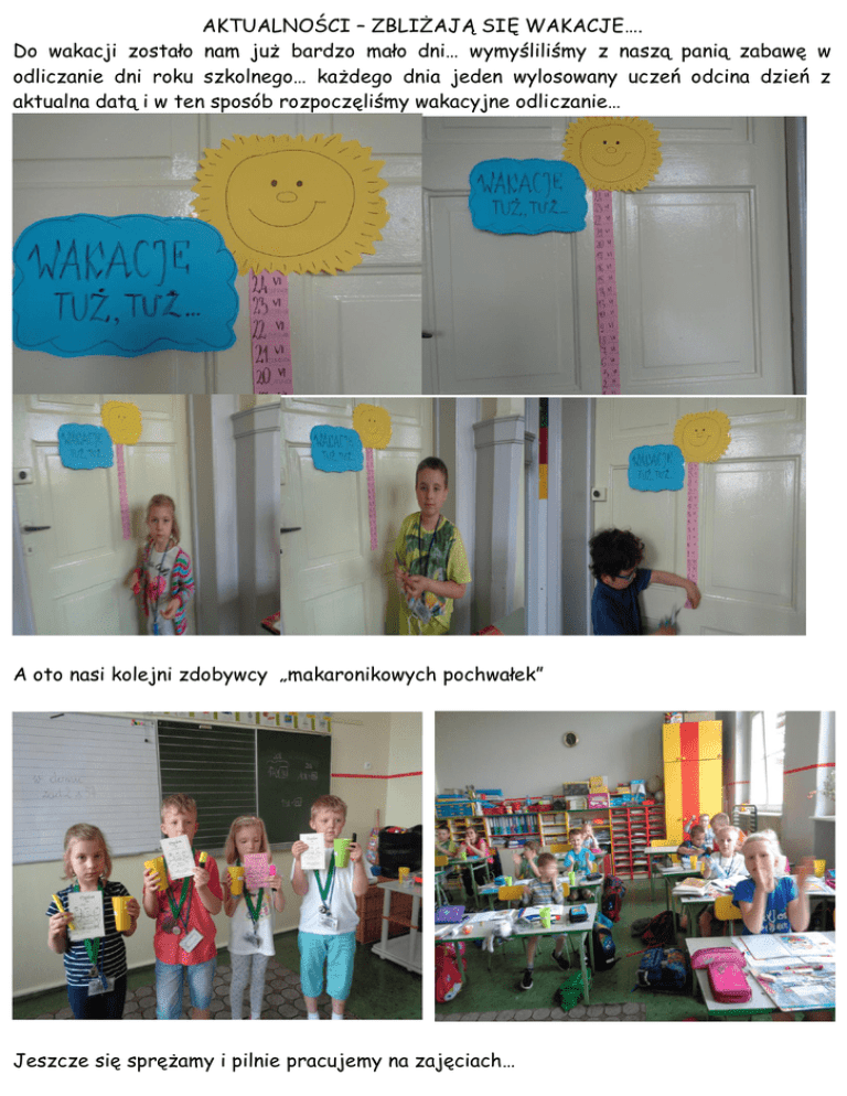 AKTUALNOŚCI – ZBLIŻAJĄ SIĘ WAKACJE…. Do wakacji zostało nam już bardzo mało dni… wymyśliliśmy z naszą panią zabawę w odliczanie dni roku szkolnego… każdego dnia jeden wylosowany uczeń odcina dzień z aktualna datą i w ten sposób rozpoczęliśmy wakacyjne odliczanie… A oto nasi kolejni zdobywcy „makaronikowych pochwałek” Jeszcze się sprężamy i pilnie pracujemy na zajęciach… Tak pracowaliśmy z czasopismami i ze Świerszczykiem…
