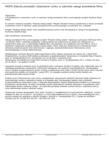 MOPS Gdynia prowadzi rozeznanie rynku w zakresie usługi powielenia filmu Ogłoszenie o prowadzonym rozeznaniu rynku w zakresie usługi powielenia filmu promującego projekt Rodzina bliżej siebie W ramach realizacji projektu "Rodzina bliżej siebie" Miejski Ośrodek Pomocy Społecznej w Gdyni prowadzi rozeznanie rynku w zakresie usługi powielenia filmu promocyjnego na potrzeby ww. projektu. Projekt "Rodzina bliżej siebie" jest współfinansowany przez Unię Europejską w ramach Europejskiego Funduszu Społecznego. Opis przedmiotu zamówienia: Usługa powielenia filmu promującego projekt "Rodzina bliżej siebie" obejmuje wykonanie 400 kopii filmu na płytach DVD, z etykietą wypaloną, wydrukowaną lub wytłoczoną na stałe (nie naklejoną) na powierzchni płyty (np. w technologii LightScribe). Na etykiecie ma znajdować się tytuł filmu, wraz z zestawem logotypów projektu Rodzina bliżej siebie. Płyty mają być dostarczone w obudowach typu slimcase przezroczystych (nie kolorowych). Logotypy zostaną dostarczone Wykonawcy przez Zamawiającego w wersji elektronicznej. Objętościowo (rozmiar danych) jeden egzemplarz filmu będzie zajmował nie więcej niż 1 płytę DVD. Oryginał filmu na płycie DVD będzie przekazany przedstawicielowi Wykonawcy w siedzibie Biura Projektu przy ul. Świętojańskiej 57/1 nie później niż 21.10.2013 o godzinie 9:00. Wykonawca ma dostarczyć kopie filmu do Biura Projektu przy ul. Świętojańskiej 57/1 w Gdyni do dnia 22.10.2013 r. do godziny 14:00. Uprzejmie proszę o podanie ceny za powielenie płyt i transport do Biura Projektu oraz całkowitej ceny za realizację przedmiotu zamówienia. Jeśli koszt transportu nie zostanie wyszczególniony, Zamawiający uzna iż będzie przeprowadzony gratis. Proszę o podawanie kwot netto i brutto (przez koszt netto rozumie się kwotę bez podatku od towarów i usług VAT). W wypadku podania jednej kwoty będzie ona potraktowana jako kwota brutto. Podane przez Wykonawców ceny (przy uwzględnieniu powyższych założeń) stanowić będą podstawę do ewentualnego wyboru realizatora usługi w przypadku gdy Zamawiający będzie miał możliwość przeprowadzenia rozeznania rynku z należytą starannością i będzie dysponował środkami na realizację przedmiotu zamówienia. W takim przypadku wybór Wykonawcy zostanie dokonany na podstawie ceny całkowitego kosztu realizacji usługi - za najatrakcyjniejszą zostanie uznana oferta z najniższą ceną tj. ceną całkowitego kosztu realizacji usługi. Propozycje cenowe zawierające ceny netto i brutto (z uwzględnionymi ewentualnymi rabatami) można składać do dnia 15.10.2013 r. do godziny 13:00 drogą elektroniczną na adres: [email protected], pocztą zwykłą lub osobiście w Biurze Projektu: Gdynia ul. Świętojańska 57/1. Osoba do kontaktu: Tomasz Łoś tel. (0-58) 627-85-05; +48-785-101-303 http://www.mopsgdynia.pl/www - MOPS Gdynia Powered by Mambo Generated: 8 March, 2017, 15:16