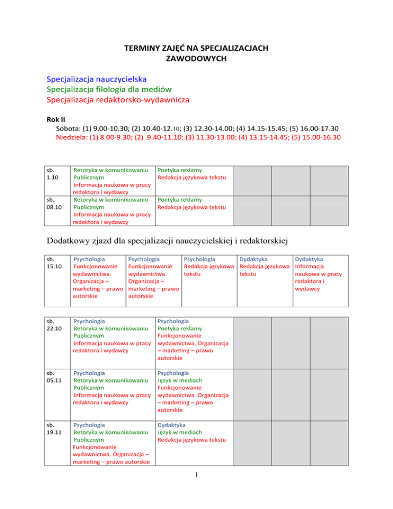 TERMINY ZAJĘĆ NA SPECJALIZACJACH ZAWODOWYCH Specjalizacja nauczycielska Specjalizacja filologia dla mediów Specjalizacja redaktorsko-wydawnicza Rok II Sobota: (1) 9.00-10.30; (2) 10.40-12.10; (3) 12.30-14.00; (4) 14.15-15.45; (5) 16.00-17.30 Niedziela: (1) 8.00-9.30; (2) 9.40-11.10; (3) 11.30-13.00; (4) 13.15-14.45; (5) 15.00-16.30 sb. 1.10 sb. 08.10 Retoryka w komunikowaniu Publicznym Informacja naukowa w pracy redaktora i wydawcy Retoryka w komunikowaniu Publicznym Informacja naukowa w pracy redaktora i wydawcy Poetyka reklamy Redakcja językowa tekstu Poetyka reklamy Redakcja językowa tekstu Dodatkowy zjazd dla specjalizacji nauczycielskiej i redaktorskiej sb. 15.10 Psychologia Funkcjonowanie wydawnictwa. Organizacja – marketing – prawo autorskie Psychologia Psychologia Dydaktyka Funkcjonowanie Redakcja językowa Redakcja językowa wydawnictwa. tekstu tekstu Organizacja – marketing – prawo autorskie sb. 22.10 Psychologia Retoryka w komunikowaniu Publicznym Informacja naukowa w pracy redaktora i wydawcy Psychologia Poetyka reklamy Funkcjonowanie wydawnictwa. Organizacja – marketing – prawo autorskie sb. 05.11 Psychologia Retoryka w komunikowaniu Publicznym Informacja naukowa w pracy redaktora i wydawcy Psychologia Język w mediach Funkcjonowanie wydawnictwa. Organizacja – marketing – prawo autorskie sb. 19.11 Psychologia Retoryka w komunikowaniu Publicznym Funkcjonowanie wydawnictwa. Organizacja – marketing – prawo autorskie Dydaktyka Język w mediach Redakcja językowa tekstu 1 Dydaktyka Informacja naukowa w pracy redaktora i wydawcy Sb. 03.12 Sb. 10.12 Psychologia Retoryka w komunikowaniu Publicznym Informacja naukowa w pracy redaktora i wydawcy Psychologia Retoryka w komunikowaniu Publicznym Informacja naukowa w pracy redaktora i wydawcy Psychologia Język w mediach Redakcja językowa tekstu Dydaktyka Język filmu Redakcja językowa tekstu Dodatkowy zjazd dla specjalizacji nauczycielskiej sb. 17.12 Psychologia Psychologia Dydaktyka Dydaktyka ndz. 18.12 Psychologia Psychologia Dydaktyka Dydaktyka Sb. 14.01 Psychologia Retoryka w komunikowaniu Publicznym Informacja naukowa w pracy redaktora i wydawcy Psychologia Retoryka w komunikowaniu Publicznym Informacja naukowa w pracy redaktora i wydawcy Psychologia Retoryka w komunikowaniu Publicznym Informacja naukowa w pracy redaktora i wydawcy Sb. 21.01 Sb. 28.01 Psychologia Język filmu Redakcja językowa tekstu Psychologia Język filmu Redakcja językowa tekstu Dydaktyka Warsztat literacki autora tekstu reklamowego Redakcja językowa tekstu 2 Dydaktyka II semestr Data sb. 18.02 1 2 Mechanizmy uczenia się Warsztat literacki autora tekstu reklamowego Redakcja językowa tekstu 3 ndz. 19.02 sb. 22.02 Gatunki wypowiedzi w szkole Warsztaty z negocjacji Wprowadzenie do edytorstwa Gatunki wypowiedzi w szkole Warsztaty z negocjacji Historia edycji polskiej literatury pięknej Gatunki wypowiedzi w szkole Warsztaty z negocjacji Wprowadzenie do edytorstwa Gatunki wypowiedzi w szkole Warsztaty z negocjacji Historia edycji polskiej literatury pięknej Gatunki wypowiedzi w szkole Warsztaty z negocjacji Wprowadzenie do edytorstwa Gatunki wypowiedzi w szkole Krytyka tekstu reklamowego Historia edycji polskiej literatury pięknej Mechanizmy uczenia się Warsztat literacki autora tekstu reklamowego Redakcja językowa tekstu ndz. 12.03 sb. 25.03 5 Mechanizmy uczenia się Warsztat literacki autora tekstu reklamowego Redakcja językowa tekstu ndz. 26.02 sb. 11.03 4 Mechanizmy uczenia się Warsztat literacki autora tekstu reklamowego Redakcja językowa tekstu 3 ndz. 26.03 sb. 08.04 Gatunki wypowiedzi Gatunki w szkole wypowiedzi w Krytyka tekstu szkole reklamowego Krytyka tekstu Wprowadzenie do reklamowego edytorstwa Historia edycji polskiej literatury pięknej Mechanizmy uczenia się Krytyka tekstu reklamowego Redakcja językowa tekstu ndz. 09.04 sb. 22.04 Emisja głosu Rynek wirtualny Wprowadzenie do edytorstwa Emisja głosu Rynek filmowy i telewizyjny Historia edycji polskiej literatury pięknej Emisja głosu Rynek wirtualny Wprowadzenie do edytorstwa Emisja głosu Rynek filmowy i telewizyjny Historia edycji polskiej literatury pięknej Emisja głosu Rynek wirtualny Wprowadzenie do edytorstwa Emisja głosu Rynek reklamy i PR Historia edycji polskiej literatury pięknej Mechanizmy uczenia się Krytyka tekstu reklamowego Redakcja językowa tekstu ndz. 07.05 sb. 20.05 Gatunki wypowiedzi w szkole Rynek filmowy i telewizyjny Historia edycji polskiej literatury pięknej Mechanizmy uczenia się Krytyka tekstu reklamowego Redakcja językowa tekstu ndz. 23.04 sb. 06.05 Gatunki wypowiedzi w szkole Krytyka tekstu reklamowego Wprowadzenie do edytorstwa Mechanizmy uczenia się Krytyka tekstu reklamowego Redakcja językowa tekstu ndz. 21.05 4 sb. 03.06 Mechanizmy uczenia się Krytyka tekstu reklamowego Redakcja językowa tekstu ndz. 04.06 sb. 10.06 Emisja głosu Rynek reklamy i PR Wprowadzenie do edytorstwa Emisja głosu Rynek reklamy i PR Historia edycji polskiej literatury pięknej Emisja głosu Wprowadzenie do edytorstwa Emisja głosu Historia edycji polskiej literatury pięknej Mechanizmy uczenia się Krytyka tekstu reklamowego Redakcja językowa tekstu ndz. 11.06 5