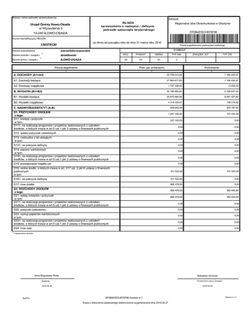 Nazwa i adres jednostki sprawozdawczej Urząd Gminy Iłowo-Osada ul.Wyzwolenia 5 13-240 IŁOWO-OSADA Numer identyfikacyjny REGON 130378120 Nazwa województwa Nazwa powiatu / związku Nazwa gminy / związku warmińsko-mazurskie WOJ. IŁOWO-OSADA 1) 28 Wyszczególnienie A. DOCHODY (A1+A2) Regionalna Izba Obrachunkowa w Olsztynie EF0B4E5D31B70F96 za okres od początku roku do dnia 31 marca roku 2016 działdowski 1) Adresat: Rb-NDS sprawozdanie o nadwyżce / deficycie jednostki samorządu terytorialnego POWIAT Przed wypełnieniem przeczytać instrukcję SYMBOLE GMINA 03 TYP GM. 03 2 Plan (po zmianach) 1 2 A1. Dochody bieżące TYP ZW. Wykonanie 29 758 013,63 3 27 960 677,63 A2. Dochody majątkowe 7 166 435,07 7 156 435,07 B. WYDATKI (B1+B2) 1 797 336,00 10 000,00 30 186 865,63 6 189 647,42 B2. Wydatki majątkowe 25 870 560,56 6 081 427,60 4 316 305,07 108 219,82 -428 852,00 976 787,65 1 297 330,00 101 522,00 327 330,00 0,00 0,00 0,00 0,00 0,00 0,00 0,00 0,00 0,00 0,00 0,00 0,00 0,00 B1. Wydatki bieżące C. NADWYŻKA/DEFICYT (A-B) D1. PRZYCHODY OGÓŁEM z tego: D11. kredyty i pożyczki w tym: D111. na realizację programów i projektów realizowanych z udziałem środków, o których mowa w art.5 ust.1 pkt 2 ustawy o finansach publicznych D12. spłata pożyczek udzielonych D13. nadwyżka z lat ubiegłych w tym: D131. na pokrycie deficytu D14. papiery wartościowe w tym: D141. na realizację programów i projektów realizowanych z udziałem środków, o których mowa w art.5 ust.1 pkt 2 ustawy o finansach publicznych D15. prywatyzacja majątku jst D16. wolne środki, o których mowa w art. 217 ust. 2 pkt 6 ustawy o finansach publicznych w tym: 0,00 0,00 101 522,00 101 522,00 D17. inne źródła 101 522,00 0,00 868 478,00 0,00 868 478,00 360 440,84 868 478,00 360 440,84 0,00 0,00 0,00 0,00 0,00 0,00 0,00 0,00 0,00 0,00 D161. na pokrycie deficytu D2. ROZCHODY OGÓŁEM z tego: D21. spłaty kredytów i pożyczek w tym: D211. na realizację programów i projektów realizowanych z udziałem środków, o których mowa w art.5 ust.1 pkt 2 ustawy o finansach publicznych D22. pożyczki (udzielone) D23. wykup papierów wartościowych w tym: D231. na realizację programów i projektów realizowanych z udziałem środków, o których mowa w art.5 ust.1 pkt 2 ustawy o finansach publicznych 1) ZWIĄZEK JST D24. inne cele niepotrzebne skreślić Irena Bogusława Roda Sebastian Cichocki Przewodnic ząc y Zarządu Skarbnik 2016.04.20 BeSTia 2016.04.20 EF0B4E5D31B70F96 Korekta nr 1 Kopia z dokumentu podpisanego elektronicznie wygenerowana dnia 2016.04.27 Strona 1 z 3 Dane uzupełniające: E. Finansowanie deficytu, zgodnie z art. 217 ust. 2 ustawy o finansach publicznych Wyszczególnienie Plan (po zmianach) 1 2) 2 4) E. FINANSOWANIE DEFICYTU (E1+E2+E3+E4+E5) z tego: E1. sprzedaż papierów wartościowych wyemitowanych przez jednostkę samorządu terytorialnego E2. kredyty i pożyczki Wykonanie 428 852,00 jednostki wypełniają za I, II, III i IV kwartał 4) wypełniają jednostki, w których planowana lub wykonana różnica między dochodami a wydatkami jest ujemna 3) 0,00 0,00 327 330,00 0,00 0,00 0,00 0,00 0,00 101 522,00 0,00 E4. nadwyżka budżetu jednostki samorządu terytorialnego z lat ubiegłych 2) 3 0,00 E3. prywatyzacja majątku jednostki samorządu terytorialnego E5. wolne środki jako nadwyżka środków pieniężnych na rachunku bieżącym budżetu jednostki samorządu terytorialnego, wynikających z rozliczeń wyemitowanych papierów wartościowych, kredytów i pożyczek z lat ubiegłych 3) jednostki wypełniają tylko za IV kwartał F. Dane uzupełniające do wyliczenia relacji, o których mowa w art. 242 i 243 ustawy o finansach publicznych Wyszczególnienie Plan (po zmianach) 1 F1. Łączna kwota wyłączeń z relacji, o której mowa w art. 243 ust. 1 ustawy o finansach publicznych w okresie sprawozdawczym w tym: F11. kwota wyłączeń, o których mowa w art. 243 ust. 3 ustawy o finansach publicznych F12. kwota wyłączeń, o których mowa w art. 243 ust. 3a ustawy o finansach publicznych F13. wykup papierów wartościowych, spłata kredytów i pożyczek zaciągniętych na spłatę przejętych zobowiązań samodzielnego publicznego zakładu opieki zdrowotnej F14. wykup obligacji nominowanych w walutach obcych wyemitowanych na zagraniczne rynki przed 1 stycznia 2010 r. F2. Zobowiązania związku współtworzonego przez jednostkę samorządu terytorialnego przypadające do spłaty w roku budżetowym F3. Kwota związana z realizacją wydatków bieżących, o których mowa w art. 242 ustawy o 5) finansach publicznych 3 375 483,00 193 319,00 0,00 0,00 294 448,00 177 112,00 0,00 0,00 0,00 0,00 81 035,00 16 207,00 X F4. Kwota wydatków bieżących ponoszonych na spłatę przejętych zobowiązań samodzielnego publicznego zakładu opieki zdrowotnej przekształconego na zasadach określonych w ustawie o działalności leczniczej 5) Wykonanie 2 0,00 0,00 0,00 wypełniają jednostki tylko za IV kwartały Irena Bogusława Roda Sebastian Cichocki Przewodnic ząc y Zarządu Skarbnik 2016.04.20 BeSTia 2016.04.20 EF0B4E5D31B70F96 Korekta nr 1 Kopia z dokumentu podpisanego elektronicznie wygenerowana dnia 2016.04.27 Strona 2 z 3 Wyjaśnienia do sprawozdania Rb-NDS Irena Bogusława Roda Sebastian Cichocki Przewodnic ząc y Zarządu Skarbnik 2016.04.20 BeSTia 2016.04.20 EF0B4E5D31B70F96 Korekta nr 1 Kopia z dokumentu podpisanego elektronicznie wygenerowana dnia 2016.04.27 Strona 3 z 3