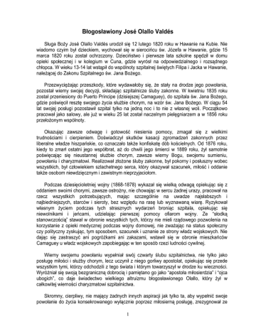 Błogosławiony José Olallo Valdés Sługa Boży José Olallo Valdés urodził się 12 lutego 1820 roku w Hawanie na Kubie. Nie wiadomo czyim był dzieckiem, wychował się w sierocińcu św. Józefa w Hawanie, gdzie 15 marca 1820 roku został ochrzczony. Dzieciństwo i pierwsze lata szkolne spędził w domu opieki społecznej i w kolegium w Cuna, gdzie wyrósł na odpowiedzialnego i rozsądnego chłopca. W wieku 13-14 lat wstąpił do wspólnoty szpitalnej świętych Filipa i Jacka w Hawanie, należącej do Zakonu Szpitalnego św. Jana Bożego. Przezwyciężając przeszkody, które wydawałoby się, że stały na drodze jego powołania, pozostał wierny swojej decyzji, składając szpitalnicze śluby zakonne. W kwietniu 1835 roku został przeniesiony do Puerto Príncipe (dzisiejszej Camaguey), do szpitala św. Jana Bożego, gdzie poświęcił resztę swojego życia służbie chorym, na wzór św. Jana Bożego. W ciągu 54 lat swojej posługi pozostawił szpital tylko na jedną noc i to nie z własnej woli. Początkowo pracował jako salowy, ale już w wieku 25 lat został naczelnym pielęgniarzem a w 1856 roku przełożonym wspólnoty. Okazując zawsze odwagę i gotowość niesienia pomocy, zmagał się z wielkimi trudnościami i cierpieniem. Doświadczył skutków kasacji zgromadzeń zakonnych przez liberalne władze hiszpańskie, co oznaczało także konfiskatę dób kościelnych. Od 1876 roku, kiedy to zmarł ostatni jego współbrat, aż do chwili jego śmierci w 1889 roku, żył samotnie poświęcając się nieustannej służbie chorym, zawsze wierny Bogu, swojemu sumieniu, powołaniu i charyzmatowi. Realizował złożone śluby zakonne, był pokorny i posłuszny wobec wszystkich, był człowiekiem szlachetnego serca, który okazywał szacunek, miłość i oddanie także osobom niewdzięcznym i zawistnym nieprzyjaciołom. Podczas dziesięcioletniej wojny (1868-1878) wykazał się wielką odwagą opiekując się z oddaniem swoimi chorymi, zawsze ostrożny, nie chowając w sercu żadnej urazy, pracował na rzecz wszystkich potrzebujących, mając szczególnie na uwadze najsłabszych i najbiedniejszych, starców i sieroty, bez względu na rasę lub wyznawaną wiarę. Ryzykował własnym życiem podczas tych strasznych wydarzeń broniąc szpitala, opiekując się niewolnikami i jeńcami, udzielając pierwszej pomocy ofiarom wojny. Ze “słodką stanowczością” stawał w obronie wszystkich tych, którzy nie mieli rządowego pozwolenia na korzystanie z opieki medycznej podczas wojny domowej, nie zważając na status społeczny czy polityczny zyskując, tym sposobem, szacunek i uznanie ze strony władz wojskowych. Nie dając się zastraszyć ani pogróżkami ani zakazami, wstawił się w obronie mieszkańców Camaguey u władz wojskowych zapobiegając w ten sposób rzezi ludności cywilnej. Wierny swojemu powołaniu wypełniał swój czwarty ślubu szpitalnictwa, nie tylko jako posługę miłości i służby chorym, lecz uczynił z niego gorliwy apostolat, opiekując się przede wszystkim tymi, którzy odchodzili z tego świata i którym towarzyszył w drodze ku wieczności. Wyróżniał się swoją bezgraniczną dobrocią i pamiętano go jako “apostoła miłosierdzia” i “ojca ubogich”, co daje świadectwo wielkiego altruizmu błogosławionego Olallo, który żył w całkowitej wierności charyzmatowi szpitalnictwa. Skromny, cierpliwy, nie mający żadnych innych aspiracji jak tylko ta, aby wypełnić swoje powołanie do życia konsekrowanego wyłącznie poprzez miłosierną posługę, zrezygnował ze 1 święceń. Mimo że był samoukiem, odznaczał się wielką kompetencją i wrażliwością także jako lekarz - chirurg. Żył z dala od tłumu, stroniąc od zaszczytów, jego spojrzenie było skierowane tylko na Chrystusa, którego odnajdywał w obliczach cierpiących ludzi. Wyrazem jego wielkiej pokory była także rezygnacja z kapłaństwa, pomimo nacisków ze strony swojego arcybiskupa, gdyż powołaniem brata Olallo było całkowite poświęcenie się służbie chorym i ubogim. Świadkowie mówią o jego głębokiej wierze w przeżywaniu konsekracji zakonnej i w wypełnianiu ślubów czystości, posłuszeństwa, ubóstwa i szpiatalnictwa. Kiedy 7 marca 1889 roku, odszedł z tego świata uznano, że umarł jako święty, “śmiercią sprawiedliwego”. Śmierć, czuwanie, pogrzeb, pomnik-mauzoleum, który od tego czasu aż po dzień dzisiejszy jest stale odwiedzany, dają świadectwo jego świętości, która znajduje także odbicie w pobożności wiernych. Umarł, ale pozostał żywy w sercach ludzi, którzy z miłością nazywali go „Ojcem Olallo”. Wielka sława świętości, która go otaczała była owocem stylu jego życia, jako człowieka o szlachetnej duszy, skromnego i sprawiedliwego. Był przykładem cnót, z sercem pełnym gorliwej miłości do “moich umiłowanych braci”: cierpliwy, radosny, uprzejmy ale przede wszystkim niestrudzony apostoł miłosierdzia. Był wiernym naśladowcą Założyciela swojego Zakonu. Bóg był jego życiem, żył napełniony miłością Boga. Odwzajemniał ten dar miłości jak tylko mógł. “Bóg zajmował pierwsze miejsce w jego dziełach i zamysłach: czynił dobro i nosił Chrystusa zawsze w głębi swojej duszy”. To jego nadzwyczajne miłosierdzie było zakorzenione w wierze, która uznaje w “Bogu własnego Ojca, a Jezus był centrum całego jego życia, fundamentem jego miłości i miłosierdzia. Ukrzyżowany był tajemnicą jego wierności bożemu miłosierdziu, które inspirowało każde jego dzieło”. Pomimo że miał silny charakter, zawsze poddawał się woli Bożej, aby lepiej stawiać czoła trudom codzienności wynikającym z posługi szpitalniczej także w trudnych i niebezpiecznych dla życia sytuacjach, starając się zawsze pomagać swoim podopiecznym w jak najlepszy sposób. Od chwili śmierci „Ojca Olallo” sława jego świętości rozszerzała się z dnia na dzień, początkowo wśród mieszka