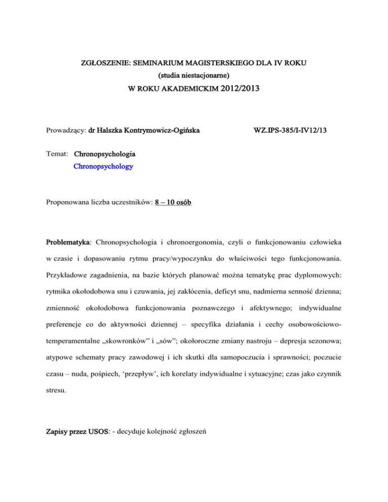 ZGŁOSZENIE: SEMINARIUM MAGISTERSKIEGO DLA IV ROKU (studia niestacjonarne) W ROKU AKADEMICKIM 2012/2013 Prowadzący: dr Halszka Kontrymowicz-Ogińska WZ.IPS-385/I-IV12/13 Temat: Chronopsychologia Chronopsychology Proponowana liczba uczestników: 8 – 10 osób Problematyka: Chronopsychologia i chronoergonomia, czyli o funkcjonowaniu człowieka w czasie i dopasowaniu rytmu pracy/wypoczynku do właściwości tego funkcjonowania. Przykładowe zagadnienia, na bazie których planować można tematykę prac dyplomowych: rytmika okołodobowa snu i czuwania, jej zakłócenia, deficyt snu, nadmierna senność dzienna; zmienność okołodobowa funkcjonowania poznawczego i afektywnego; indywidualne preferencje co do aktywności dziennej – specyfika działania i cechy osobowościowotemperamentalne „skowronków” i „sów”; okołoroczne zmiany nastroju – depresja sezonowa; atypowe schematy pracy zawodowej i ich skutki dla samopoczucia i sprawności; poczucie czasu – nuda, pośpiech, ‘przepływ’, ich korelaty indywidualne i sytuacyjne; czas jako czynnik stresu. Zapisy przez USOS: - decyduje kolejność zgłoszeń