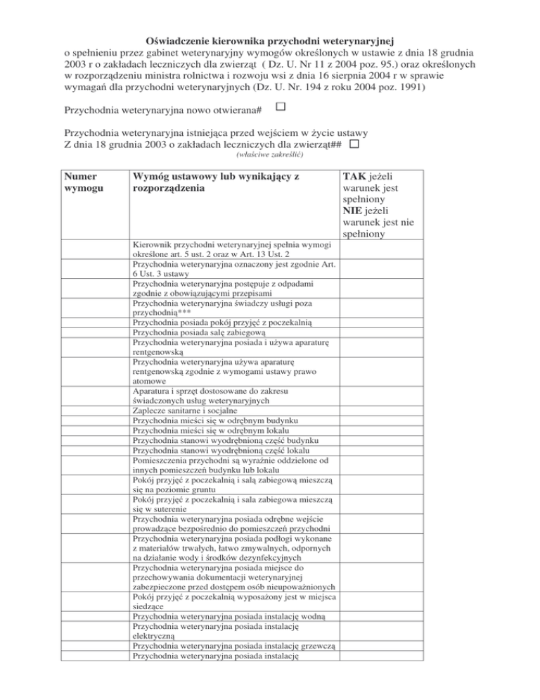 O wiadczenie kierownika przychodni weterynaryjnej o spełnieniu przez gabinet weterynaryjny wymogów okre lonych w ustawie z dnia 18 grudnia 2003 r o zakładach leczniczych dla zwierz t ( Dz. U. Nr 11 z 2004 poz. 95.) oraz okre lonych w rozporz dzeniu ministra rolnictwa i rozwoju wsi z dnia 16 sierpnia 2004 r w sprawie wymaga dla przychodni weterynaryjnych (Dz. U. Nr. 194 z roku 2004 poz. 1991) Przychodnia weterynaryjna nowo otwierana# Przychodnia weterynaryjna istniej ca przed wej ciem w ycie ustawy Z dnia 18 grudnia 2003 o zakładach leczniczych dla zwierz t## (wła ciwe zakre li ) Numer wymogu Wymóg ustawowy lub wynikaj cy z rozporz dzenia Kierownik przychodni weterynaryjnej spełnia wymogi okre lone art. 5 ust. 2 oraz w Art. 13 Ust. 2 Przychodnia weterynaryjna oznaczony jest zgodnie Art. 6 Ust. 3 ustawy Przychodnia weterynaryjna post puje z odpadami zgodnie z obowi zuj cymi przepisami Przychodnia weterynaryjna wiadczy usługi poza przychodni *** Przychodnia posiada pokój przyj z poczekalni Przychodnia posiada sal zabiegow Przychodnia weterynaryjna posiada i u ywa aparatur rentgenowsk Przychodnia weterynaryjna u ywa aparatur rentgenowsk zgodnie z wymogami ustawy prawo atomowe Aparatura i sprz t dostosowane do zakresu wiadczonych usług weterynaryjnych Zaplecze sanitarne i socjalne Przychodnia mie ci si w odr bnym budynku Przychodnia mie ci si w odr bnym lokalu Przychodnia stanowi wyodr bnion cz budynku Przychodnia stanowi wyodr bnion cz lokalu Pomieszczenia przychodni s wyra nie oddzielone od innych pomieszcze budynku lub lokalu Pokój przyj z poczekalni i sal zabiegow mieszcz si na poziomie gruntu Pokój przyj z poczekalni i sala zabiegowa mieszcz si w suterenie Przychodnia weterynaryjna posiada odr bne wej cie prowadz ce bezpo rednio do pomieszcze przychodni Przychodnia weterynaryjna posiada podłogi wykonane z materiałów trwałych, łatwo zmywalnych, odpornych na działanie wody i rodków dezynfekcyjnych Przychodnia weterynaryjna posiada miejsce do przechowywania dokumentacji weterynaryjnej zabezpieczone przed dost pem osób nieupowa nionych Pokój przyj z poczekalni wyposa ony jest w miejsca siedz ce Przychodnia weterynaryjna posiada instalacj wodn Przychodnia weterynaryjna posiada instalacj elektryczn Przychodnia weterynaryjna posiada instalacj grzewcz Przychodnia weterynaryjna posiada instalacj TAK je eli warunek jest spełniony NIE je eli warunek jest nie spełniony kanalizacyjn Przychodnia weterynaryjna posiada urz dzenia zapewniaj ce wymian powietrza ciany pokoju przyj przychodni weterynaryjnej wykonane s z materiałów gładkich, a przy umywalce z materiałów trwałych, łatwo zmywalnych, odpornych na działanie wody i rodków dezynfekcyjnych W pokoju przyj i na zapleczu sanitarnym znajduje si umywalka z doprowadzon bie c wod ciepł i zimn , rodki do mycia i odka ania r k, r czniki jednorazowego u ytku oraz pojemnik na zu yte r czniki Parapety w pomieszczeniach przychodni weterynaryjnej s wyko czone materiałem trwałym, gładkim, odpornym na działanie wody i rodków dezynfekcyjnych i jest łatwy do czyszczenia Grzejniki w pomieszczeniach przychodni weterynaryjnej s gładkie i łatwe do czyszczenia W pokoju przyj i na sali zabiegowej okna s otwierane lub uchylne W pokoju przyj i na sali zabiegowej zainstalowana jest klimatyzacja Powierzchnia pokoju przyj wynosi co najmniej 8m2 Wysoko pokoju przyj wynosi co najmniej 2,2 m Powierzchnia poczekalni wynosi co najmniej 6 m2 Wysoko poczekalni wynosi co najmniej 2,2 m Powierzchnia sali zabiegowej wynosi co najmniej 8 m 2 Wysoko sali zabiegowej wynosi co najmniej 2,2 m Powierzchnia zaplecza sanitarnego wynosi co najmniej 3m2 Wysoko zaplecza sanitarnego wynosi co najmniej 2,2 m Powierzchnia zaplecza socjalnego wynosi co najmniej 3m2 Wysoko zaplecza socjalnego wynosi co najmniej 2,2 m Przychodnia weterynaryjna wyposa ona jest w sprz t i urz dzenia do przechowywania produktów leczniczych, artykułów sanitarnych, sprz tu jednorazowego u ytku i innych produktów medycznych zgodnie z wymaganiami okre lonymi przez producenta lub wynikaj cymi z ich wła ciwo ci Przychodnia weterynaryjna posiada pojemniki na odpady w tym na odpady weterynaryjne Urz dzenia i sprz t znajduj ce si w pokoju przyj wykonane s z materiałów trwałych, łatwo zmywalnych i odpornych na działanie rodków dezynfekcyjnych Pokój przyj wyposa ony jest w stół zabiegowy dostosowany wielko ci do zakresy i rodzaju wiadczonych usług weterynaryjnych, wykonany z materiału trwałego, łatwo zmywalnego i odpornego na działanie rodków dezynfekcyjnych Pokój przyj wyposa ony jest w lamp bakteriobójcz Pokój przyj wyposa ony jest w stetoskop Sala zabiegowa wyposa ona jest w sprz t umo liwiaj cy podawanie tlenu Sala zabiegowa wyposa ona jest w zestaw do intubacji dotchawiczej z rurkami intubacyjnymi i laryngoskopem dostosowany do zakresu wiadczonych usług weterynaryjnych Sala zabiegowa wyposa ona jest w worek samorozpr ny Sala zabiegowa wyposa ona jest w sprz t do do ylnego podawania leków Sala zabiegowa wyposa ona jest w stetoskop Sala zabiegowa wyposa ona jest w ródło wiatła bezcieniowego Sala zabiegowa wyposa ona jest w autoklaw lub sterylizator na suche powietrze Sala zabiegowa wyposa ona jest w stół zabiegowy dostosowany wielko ci do zakresy i rodzaju wiadczonych usług weterynaryjnych, wykonany z materiału trwałego, łatwo zmywalnego i odpornego na działanie rodków dezynfekcyjnych Sala zabiegowa wyposa ona jest w lamp bakteriobójcz Sala zabiegowa wyposa ona jest w pojemnik na odpady medyczne Przychodnia weterynaryjna wyposa ona jest w przeno ny sprz t weterynaryjny*** Przychodnia weterynaryjna wyposa ona jest w pojemniki zapewniaj ce sterylno transportowanego sprz tu*** Przychodnia weterynaryjna wyposa ona jest w sprz t i urz dzenia do przechowywania, podczas transportu, produktów leczniczych, artykułów sanitarnych, sprz tu jednorazowego u ytku i innych produktów medycznych, zgodnie z wymogami okre lonymi przez ich producenta lub wynikaj cymi z i