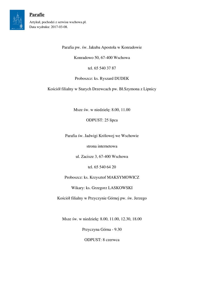 Parafie Artykuł‚ pochodzi z serwisu wschowa.pl. Data wydruku: 2017-03-08. Parafia pw. św. Jakuba Apostoła w Konradowie Konradowo 50, 67-400 Wschowa tel. 65 540 37 87 Proboszcz: ks. Ryszard DUDEK Kościół filialny w Starych Drzewcach pw. Bł.Szymona z Lipnicy Msze św. w niedzielę: 8.00, 11.00 ODPUST: 25 lipca Parafia św. Jadwigi Królowej we Wschowie strona internetowa ul. Zacisze 3, 67-400 Wschowa tel. 65 540 64 20 Proboszcz: ks. Krzysztof MAKSYMOWICZ Wikary: ks. Grzegorz LASKOWSKI Kościół filialny w Przyczynie Górnej pw. św. Jerzego Msze św. w niedzielę: 8.00, 11.00, 12.30, 18.00 Przyczyna Górna - 9.30 ODPUST: 8 czerwca Parafie Artykuł‚ pochodzi z serwisu wschowa.pl. Data wydruku: 2017-03-08. Parafia Matki Bożej Bolesnej strona internetowa Łysiny 32, 67-400 Wschowa tel. 65 540 13 38 Proboszcz: ks. Bogumił BASZKO Kościół filialny wTylewicach pw. Narodzenia Najświętszej Mari Panny Msze św w niedzielę: 8.00, 11:30 Tylewice: 9.30 ODPUST: 15 września Parafia pw. św. Bartłomieja Apostoła 67-400 Lgiń tel. 65 549 13 69 Proboszcz: ks. Ryszard MARCZYK Kościół filialny w Hetmanicach pw. św. Jana Chrzciciela Msze św w niedzielę: Lgiń - 7.45, 12.00, 18.30 (sobota - wakacje) Strona 2/4 Parafie Artykuł‚ pochodzi z serwisu wschowa.pl. Data wydruku: 2017-03-08. Hetmanice - 9.00 Nowa Wieś - 10.30 ODPUST: 24 sierpnia Parafia pw. św. Stanisława Biskupa i Męczennika we Wschowie Plac Farny 2, 67-400 Wschowa tel. 65 540 21 21 Proboszcz: ks. prałat Zygmunt ZAJĄC Wikariusze: ks. Ziemowit Katulski ks. Michał Graczyk Kościół filialny pw. Trójcy Świętej we Wschowie Msze św w niedzielę 7.00, 8.30, 10.00, 11.30, 13.00, 19.00 Kościół pw. Trójcy Świętej przy Placu Kosynierów - 16.00 ODPUST: 8 maja http://www.fara.zw.pl/ zdjęcia Bogusław Świtała Parafia pw. świętych Fabiana i Sebastiana Osowa Sień, 67 - 400 Wschowa Strona 3/4 Parafie Artykuł‚ pochodzi z serwisu wschowa.pl. Data wydruku: 2017-03-08. tel. 65 540 21 40 Proboszcz: ks. Zbigniew GARBAREK Msze św w niedzielę: 8.30, 11.30 ODPUST: 20 stycznia Parafia pw. Narodzenia Najświętszej Maryi Panny i św. Jana Apostoła Siedlnica 39, 67 - 400 Wschowa tel. 65 540 08 25 Proboszcz: ks. wicedziekan Bolesław GUMIENIUK Rezydent: ks. Antoni KOSTECKI Kościóły filialne pw. Bł. Jana z Dukli w Jędrzychowicach pw. Bł. Władysława z Gielniowa w Olbrachciach Msza św. w niedzielę: 10.30 Jędrzychowice - 12.00 Olbrachcice - 10.30 ODPUST: 8 września Strona 4/4 Powered by TCPDF (www.tcpdf.org)