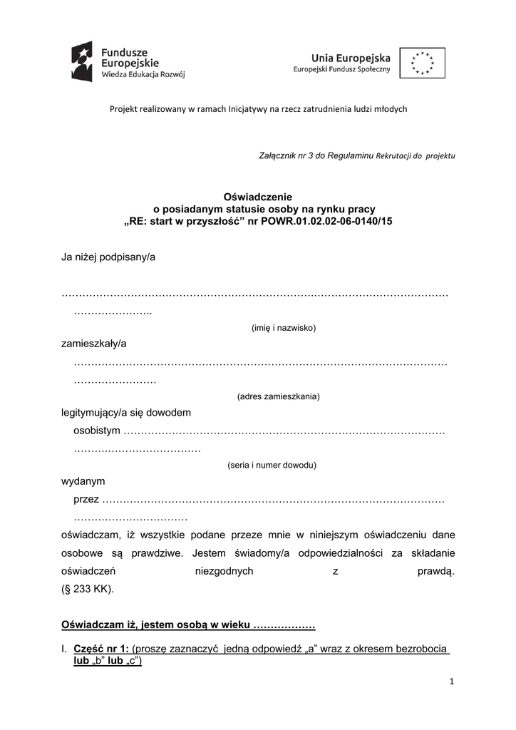 Projekt realizowany w ramach Inicjatywy na rzecz zatrudnienia ludzi młodych Załącznik nr 3 do Regulaminu Rekrutacji do projektu Oświadczenie o posiadanym statusie osoby na rynku pracy „RE: start w przyszłość” nr POWR.01.02.02-06-0140/15 Ja niżej podpisany/a ……………………………………………………………….………………………………… ………………….. (imię i nazwisko) zamieszkały/a ……………………………………………………………………………………………… …………………… (adres zamieszkania) legitymujący/a się dowodem osobistym ………………………………………………………………………………… ……….……………………… (seria i numer dowodu) wydanym przez ……………………………………………………………………………………… …………………………… oświadczam, iż wszystkie podane przeze mnie w niniejszym oświadczeniu dane osobowe są prawdziwe. Jestem świadomy/a odpowiedzialności za składanie oświadczeń niezgodnych z prawdą. (§ 233 KK). Oświadczam iż, jestem osobą w wieku ……………… I. Część nr 1: (proszę zaznaczyć jedną odpowiedź „a” wraz z okresem bezrobocia lub „b” lub „c”) 1 Projekt realizowany w ramach Inicjatywy na rzecz zatrudnienia ludzi młodych a) osobą bezrobotną zarejestrowaną w urzędzie pracy: do 6-ciu miesięcy 6-12 miesięcy powyżej 12 miesięcy w tym osobą długotrwale bezrobotną Lub b) osobą bezrobotną niezarejestrowaną w urzędzie pracy Lub c) osobą bierną zawodowo II. Część nr 2: (Proszę zaznaczyć odpowiedzi w punktach 1-10, które dotyczą kandydata) 1. osobą nieuczestniczącą w kształceniu formalnym w trybie stacjonarnym: do 6-ciu miesięcy 6-12 miesięcy powyżej 12 miesięcy 2. osobą nieuczestniczącą w pozostałych zajęciach mających na celu uzyskanie, uzupełnienie lub doskonalenie umiejętności lub kwalifikacji zawodowych lub ogólnych potrzebnych do wykonywania pracy, a finansowanych ze środków publicznych w ciągu ostatnich 4 tygodni 3. osobą posiadającą orzeczenie o niepełnosprawności 4. osobą o niskich kwalifikacjach (max. średnie wykształcenie) 5. osobą bez doświadczenia zawodowego 6. osobą z doświadczeniem zawodowym: powyżej 2-óch lat 1-2 lata poniżej 3 miesięcy 7. osobą wychowującą dzieci 8. osobą z terenów wiejskich1 9. osobą bez kwalifikacji zawodowych 10. osobą posiadającą wykształcenie ……………………………………… 2 Projekt realizowany w ramach Inicjatywy na rzecz zatrudnienia ludzi młodych III. Część nr 3: STATUS UCZESTNIKA PROJEKTU W CHWILI PRZYSTĄPIENIA DO PROJEKTU (Proszę zaznaczyć odpowiedzi w punktach 1-6 , które dotyczą kandydata) 1. Osobą należącą do mniejszości narodowej lub etnicznej, migrant, osoba obcego pochodzenia2: Nie Tak Odmowa podania informacji 2. Osobą bezdomną lub dotkniętą wykluczeniem z dostępu do mieszkań Nie Tak 3. Osobą z niepełnosprawnościami Nie Tak Odmowa podania informacji 4. Osobą przebywającą w gospodarstwie domowym bez osób pracujących Nie Tak w tym: w gospodarstwie domowym z dziećmi pozostającymi na utrzymaniu3 Nie Tak 5. Osobą żyjącą w gospodarstwie składającym się z jednej osoby dorosłej i dzieci pozostających na utrzymaniu4 Nie Tak 6. Osobą w innej niekorzystnej sytuacji społecznej (innej niż wymienione powyżej)5 Nie Tak Odmowa podania informacji 3 Projekt realizowany w ramach Inicjatywy na rzecz zatrudnienia ludzi młodych ………………………………. ……………………………………………………… (miejscowość, data) Podpis Kandydata do Projektu 1 Obszary wiejskie ‐ 300 osób/km2 na obszarze, którym minimalna liczba ludności wynosi 5 000 mieszkańców. Migrant ‐ cudzoziemcy na stale mieszkający w danym państwie, obywatele obcego pochodzenia lub obywatele należący do mniejszości. Zgodnie z prawem krajowym mniejszości narodowe to mniejszość: białoruska, czeska, litewska, niemiecka, ormiańska, rosyjska, słowacka, ukraińska, żydowska. Mniejszości etniczne: karaimska, łemkowska, romska, tatarska. Osoby obcego pochodzenia to cudzoziemcy ‐ każda osoba, która nie posiada polskiego obywatelstwa, bez względu na fakt posiadania lub nie obywatelstwa (obywatelstw) innych krajów lub osoba, której co najmniej jeden z rodziców urodził się poza terenem Polski. 3 Wskaźnik jest podkategorią wskaźnika dot. osób żyjących w gospodarstwach domowych bez osób pracujących. Oznacza to, że osoba wykazana w kategorii dot. gospodarstw domowych bez osób pracujących, z dziećmi pozostającymi na utrzymaniu powinna być również wykazana we wskaźniku dot. gospodarstw domowych bez osób pracujących. Gospodarstwo domowe bez osób pracujących ‐ gospodarstwo domowe, w którym żaden członek nie pracuje; wszyscy członkowie są albo bezrobotni albo bierni zawodowo. Gospodarstwo domowe to jednostka (ekonomiczna, społeczna): ‐ posiadająca wspólne zobowiązania ‐ dzieląca wydatki domowe lub codzienne potrzeby ‐ wspólnie zamieszkująca. Gospodarstwo domowe to zarówno osoba zamieszkująca samotnie, jak również grupa ludzi (niekoniecznie spokrewniona) mieszkająca pod tym samym adresem wspólnie prowadząca dom np. mająca przynajmniej jeden wspólny posiłek dziennie lub wspólny pokój dzienny. Gospodarstwem domowym nie jest: ‐ gospodarstwo zbiorowe lub gospodarstwo instytucjonalne (jako przeciwieństwo prywatnych); przede wszystkim szpitale, domy opieki dla osób starszych, więzienia, koszary wojskowe, instytucje religijne, szkoły z internatem, pensjonaty, hotele robotnicze itp. Dzieci pozostające na utrzymaniu to osoby w wieku 0‐17 lat oraz 18‐24 lata, które są bierne zawodowo oraz mieszkają z rodzicem. Wiek dzieci liczony jest od daty urodzenia i ustalany w dniu rozpoczęcia udziału uczestnika w projekcie. Kategoria obejmuje
