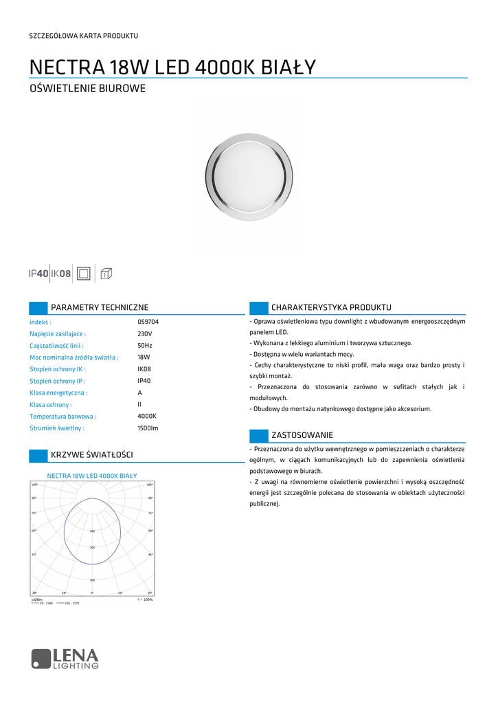 SZCZEGÓŁOWA KARTA PRODUKTU NECTRA 18W LED 4000K BIAŁY OŚWIETLENIE BIUROWE PARAMETRY TECHNICZNE indeks : 059704 - Oprawa oświetleniowa typu downlight z wbudowanym energooszczędnym Napięcie zasilajace : 230V panelem LED. Częstotliwość linii : 50Hz - Wykonana z lekkiego aluminium i tworzywa sztucznego. Moc nominalna źródła światła : 18W - Dostępna w wielu wariantach mocy. Stopień ochrony IK : IK08 Stopień ochrony IP : IP40 Klasa energetyczna : A Klasa ochrony : II Temperatura barwowa : 4000K Strumień świetlny : 1500lm - Cechy charakterystyczne to niski profil, mała waga oraz bardzo prosty i szybki montaż. - Przeznaczona do stosowania zarówno w sufitach stałych jak i modułowych. - Obudowy do montażu natynkowego dostępne jako akcesorium. CHARAKTERYSTYKA PRODUKTU KRZYWE ŚWIATŁOŚCI NECTRA 18W LED 4000K BIAŁY ZASTOSOWANIE - Przeznaczona do użytku wewnętrznego w pomieszczeniach o charakterze ogólnym, w ciągach komunikacyjnych lub do zapewnienia oświetlenia podstawowego w biurach. - Z uwagi na równomierne oświetlenie powierzchni i wysoką oszczędność energii jest szczególnie polecana do stosowania w obiektach użyteczności publicznej. SZCZEGÓŁOWA KARTA PRODUKTU NECTRA 18W LED 4000K BIAŁY OŚWIETLENIE BIUROWE TABELA PARAMETRÓW TECHNICZNYCH indeks: 059704 Napięcie zasilajace: 230V Częstotliwość linii: 50Hz Moc nominalna źródła światła: 18W Stopień ochrony IK: IK08 Stopień ochrony IP: IP40 Skuteczność świetlna: 83lm/W Klasa energetyczna: A Klasa ochrony: II Wymiary: ø234/67mm Wymiary montażowe: ø206mm Waga: 0,65kg Materiał korpusu: Aluminium Temperatura barwowa: 4000K Kolor: Biały Temperatura pracy oprawy: -17°C +35°C Strumień świetlny: 1500lm Kod EAN: 5905963059704 Materiał klosza: PC Rodzaj klosza: Opal Źródło światła: LED www.lenalighting.pl | Strona 2 SZCZEGÓŁOWA KARTA PRODUKTU NECTRA 18W LED 4000K BIAŁY OŚWIETLENIE BIUROWE RYSUNKI TECHNICZNE SZCZEGÓŁY TECHNICZNE Data aktualizacji karty: 2016-04-22 37/2013 www.lenalighting.pl | Strona 3
