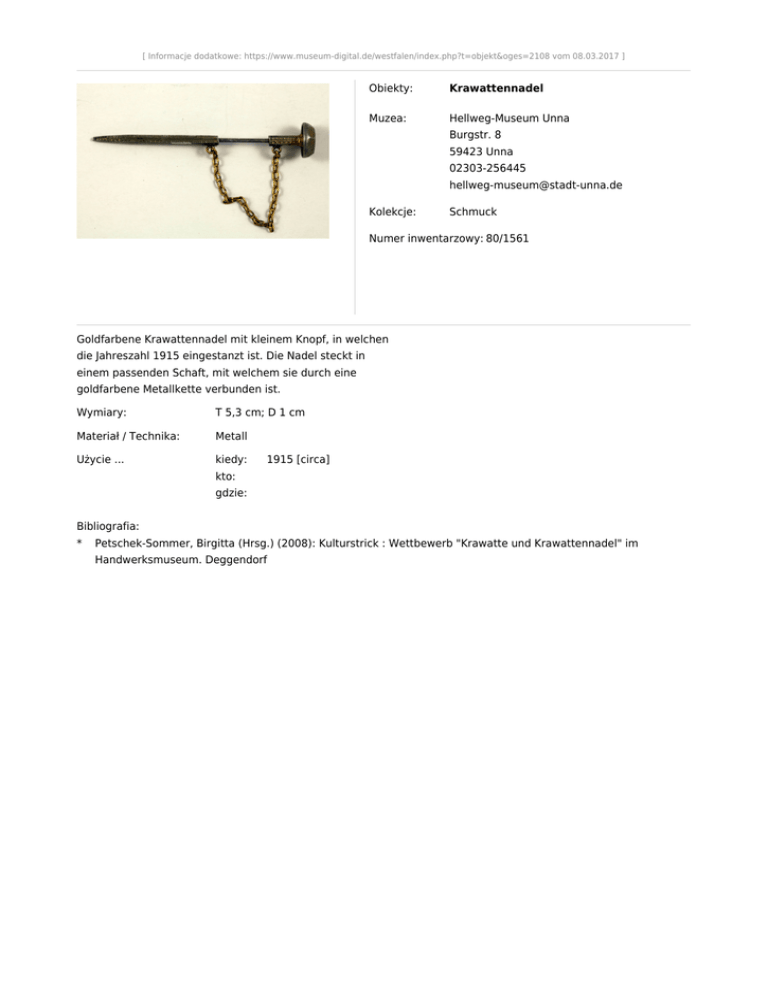 [ Informacje dodatkowe: https://www.museum-digital.de/westfalen/index.php?t=objekt&oges=2108 vom 08.03.2017 ] Obiekty: Krawattennadel Muzea: Hellweg-Museum Unna Burgstr. 8 59423 Unna 02303-256445 [email protected] Kolekcje: Schmuck Numer inwentarzowy: 80/1561 Goldfarbene Krawattennadel mit kleinem Knopf, in welchen die Jahreszahl 1915 eingestanzt ist. Die Nadel steckt in einem passenden Schaft, mit welchem sie durch eine goldfarbene Metallkette verbunden ist. Wymiary: T 5,3 cm; D 1 cm Materiał / Technika: Metall Użycie ... kiedy: 1915 [circa] kto: gdzie: Bibliografia: * Petschek-Sommer, Birgitta (Hrsg.) (2008): Kulturstrick : Wettbewerb "Krawatte und Krawattennadel" im Handwerksmuseum. Deggendorf