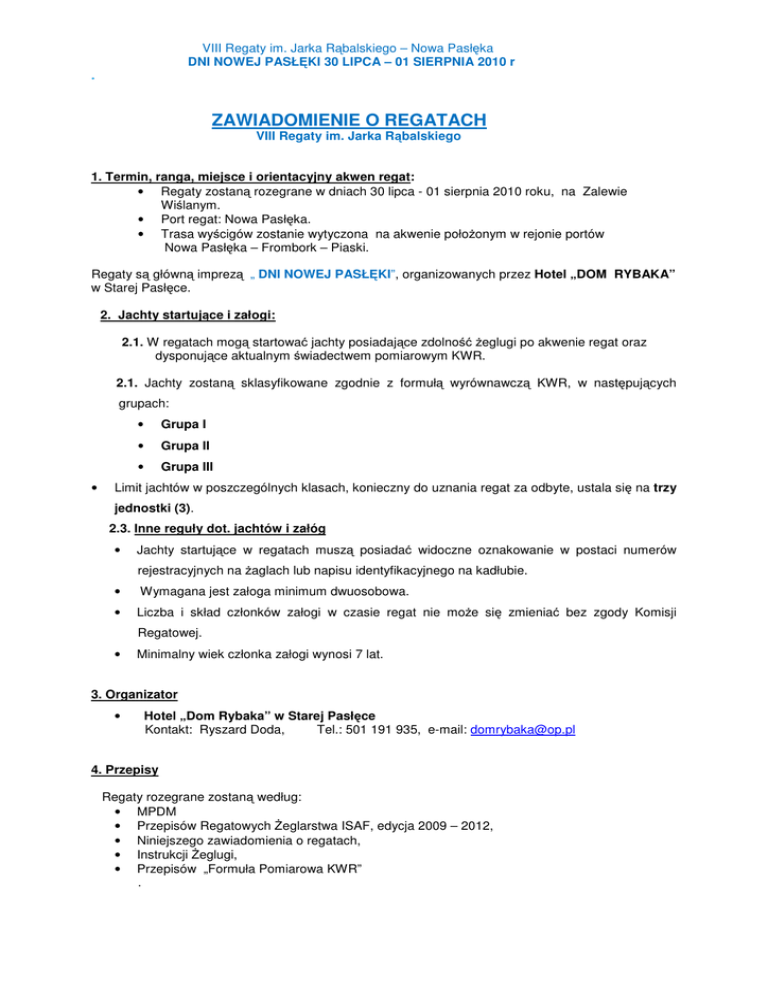VIII Regaty im. Jarka Rąbalskiego – Nowa Pasłęka DNI NOWEJ PASŁĘKI 30 LIPCA – 01 SIERPNIA 2010 r . ZAWIADOMIENIE O REGATACH VIII Regaty im. Jarka Rąbalskiego 1. Termin, ranga, miejsce i orientacyjny akwen regat: • Regaty zostaną rozegrane w dniach 30 lipca - 01 sierpnia 2010 roku, na Zalewie Wiślanym. • Port regat: Nowa Pasłęka. • Trasa wyścigów zostanie wytyczona na akwenie położonym w rejonie portów Nowa Pasłęka – Frombork – Piaski. Regaty są główną imprezą „ DNI NOWEJ PASŁĘKI”, organizowanych przez Hotel „DOM RYBAKA” w Starej Pasłęce. 2. Jachty startujące i załogi: 2.1. W regatach mogą startować jachty posiadające zdolność żeglugi po akwenie regat oraz dysponujące aktualnym świadectwem pomiarowym KWR. 2.1. Jachty zostaną sklasyfikowane zgodnie z formułą wyrównawczą KWR, w następujących grupach: • • Grupa I • Grupa II • Grupa III Limit jachtów w poszczególnych klasach, konieczny do uznania regat za odbyte, ustala się na trzy jednostki (3). 2.3. Inne reguły dot. jachtów i załóg • Jachty startujące w regatach muszą posiadać widoczne oznakowanie w postaci numerów rejestracyjnych na żaglach lub napisu identyfikacyjnego na kadłubie. • Wymagana jest załoga minimum dwuosobowa. • Liczba i skład członków załogi w czasie regat nie może się zmieniać bez zgody Komisji Regatowej. • Minimalny wiek członka załogi wynosi 7 lat. 3. Organizator • Hotel „Dom Rybaka” w Starej Pasłęce Kontakt: Ryszard Doda, Tel.: 501 191 935, e-mail: [email protected] 4. Przepisy Regaty rozegrane zostaną według: • MPDM • Przepisów Regatowych Żeglarstwa ISAF, edycja 2009 – 2012, • Niniejszego zawiadomienia o regatach, • Instrukcji Żeglugi, • Przepisów „Formuła Pomiarowa KWR” . VIII Regaty im. Jarka Rąbalskiego – Nowa Pasłęka DNI NOWEJ PASŁĘKI 30 LIPCA – 01 SIERPNIA 2010 r . Uwaga: W czasie postoju w portach załogi mają obowiązek przestrzegać postanowień Zarządzenia Nr 12 Dyrektora Urzędu Urzędu Morskiego w Gdyni, z dnia 14.06.2005 r. „Przepisy Portowe”. 5. Wyniki W wynikach ostatecznych nie będą klasyfikowane jachty, które nie ukończyły żadnego • wyścigu. Regaty zostaną uznane za ważne przy rozegraniu 1 wyścigu. 6. Protesty • Zgodnie z Instrukcją Żeglugi. 8. Inne postanowienia • Załoga jachtu zgłaszająca się do regat wyraża zgodę na bezpłatne wykorzystanie przez organizatorów i sponsorów swego wizerunku, nazwiska, głosu w środkach masowego przekazu, w celu reklamy i promocji regat oraz w materiałach dotyczących regat. • Wszyscy uczestnicy biorą udział w regatach na własną odpowiedzialność. Żadna z czynności wykonana lub nie wykonana przez organizatorów, nie zwalnia uczestników regat od ponoszenia odpowiedzialności za jakąkolwiek szkodę spowodowaną przez zawodnika lub jego jacht, wynikającą z udziału w regatach. 9. Ubezpieczenie Ubezpieczenie OC jachtów na czas regat jest zalecane. Jachty nie posiadające polisy OC startują na wyłączne ryzyko osób zgłaszających jachty do regat. 10. Zgłoszenia i wpisowe • Zgłoszenia, wyłącznie na oficjalnych formularzach „ZGŁOSZENIE”, przyjmowane będą w Biurze Regat, zlokalizowanym przy Hotelu „Dom Rybaka” w Starej Pasłęce , w terminie podanym w pkt. 11. Przy zgłoszeniu należy obligatoryjnie przedłożyć do wglądu aktualne świadectwo pomiarowe KWR. • Wpisowe do regat wynosi 100,00 zł od jachtu. 11. Program dzień 1. – piątek 30. lipca • 17.00 – Biuro Regat, przyjmowanie zgłoszeń do regat, • 19.00 – 23.30 - ognisko integracyjne wodniaków , występ szantymena, • 24.00 - cisza nocna. VIII Regaty im. Jarka Rąbalskiego – Nowa Pasłęka DNI NOWEJ PASŁĘKI 30 LIPCA – 01 SIERPNIA 2010 r . dzień 2. – sobota 31. lipca • 09.00 – Biuro Regat, c.d. rejestracji uczestników regat, • 10.30 – odprawa sterników przed regatami, • 12.30 – start, • ok. 16.30 – 17.00- powrót jachtów do portu, • 18.00 – komunikat Komisji Regatowej o wynikach regat (czas na reklamacje i odwołania), • 18.30 – uroczystość oficjalnego zakończenie regat , dekoracja zwycięzców, losowanie nagród, • 19.30 – bankiet żeglarski i zabawa • 00.30 - cisza nocna. Dzień 3. – niedziela 01. sierpnia Dzień rezerwowy. W przypadku nierozegrania żadnego wyścigu w dniu 31 lipca, program na dzień 01 sierpnia zostanie ustalony doraźnie przez organizatora, w zależności od okoliczności. 12. Nagrody i inne świadczenia dla zawodników: • Jachty zajmujące wg klasyfikacji oststecznej miejsca I ÷ III otrzymają puchary. • Wśród załóg sklasyfikowanych zostaną rozlosowane, zgodnie z regulaminem Organizatora, atrakcyjne nagrody rzeczowe, ufundowane przez Sponsorów, tj.: URZĄD MIASTA I GMINY BRANIEWA, DOM RYBAKA, JANMOR, APOLLO SAILS, CZECH, WOJCIECH HOŁOWNIA, ZENON LICHOŃCZAK, ROMAN PUTAŁA. • Załogom uczestniczącym w regatach zapewnia się ponadto wstęp na bankiet, ufundowany przez Sponsorów, tj.: Hotel DOM RYBAKA, Gospodarstwo Rolne Wojciecha Hołowni, Gospodarstwo Rolne Zenona Lichończaka. .ZAPRASZAMY ! Organizator Ryszard Doda VIII Regaty im. Jarka Rąbalskiego – Nowa Pasłęka DNI NOWEJ PASŁĘKI 30 LIPCA – 01 SIERPNIA 2010 r .