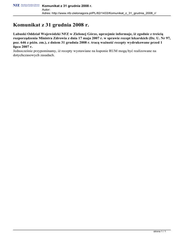 Komunikat z 31 grudnia 2008 r. Autor: Adres: http://www.nfz-zielonagora.pl/PL/82/1433/Komunikat_z_31_grudnia_2008_r/ Komunikat z 31 grudnia 2008 r. Lubuski Oddział Wojewódzki NFZ w Zielonej Górze, uprzejmie informuje, iż zgodnie z treścią rozporządzenia Ministra Zdrowia z dnia 17 maja 2007 r. w sprawie recept lekarskich (Dz. U. Nr 97, poz. 646 z późn. zm.), z dniem 31 grudnia 2008 r. tracą ważność recepty wydrukowane przed 1 lipca 2007 r. Jednocześnie przypominamy, iż recepty wystawiane na kuponie RUM mogą być realizowane na dotychczasowych zasadach. strona 1 / 1 Powered by TCPDF (www.tcpdf.org)