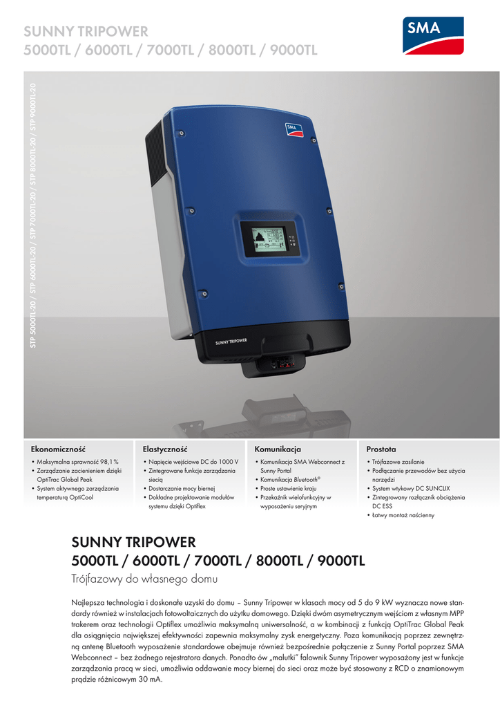 STP 5000TL-20 / STP 6000TL-20 / STP 7000TL-20 / STP 8000TL-20 / STP 9000TL-20 SUNNY TRIPOWER 5000TL / 6000TL / 7000TL / 8000TL / 9000TL Ekonomiczność Elastyczność Komunikacja Prostota • Maksymalna sprawność 98,1 % • Zarządzanie zacienieniem dzięki OptiTrac Global Peak • System aktywnego zarządzania temperaturą OptiCool • Napięcie wejściowe DC do 1000 V • Zintegrowane funkcje zarządzania siecią • Dostarczanie mocy biernej • Dokładne projektowanie modułów systemu dzięki Optiflex • Komunikacja SMA Webconnect z Sunny Portal • Komunikacja Bluetooth® • Proste ustawienie kraju • Przekaźnik wielofunkcyjny w wyposażeniu seryjnym • Trójfazowe zasilanie • Podłączanie przewodów bez użycia narzędzi • System wtykowy DC SUNCLIX • Zintegrowany rozłącznik obciążenia DC ESS • Łatwy montaż naścienny SUNNY TRIPOWER 5000TL / 6000TL / 7000TL / 8000TL / 9000TL Trójfazowy do własnego domu Najlepsza technologia i doskonałe uzyski do domu – Sunny Tripower w klasach mocy od 5 do 9 kW wyznacza nowe standardy również w instalacjach fotowoltaicznych do użytku domowego. Dzięki dwóm asymetrycznym wejściom z własnym MPP trakerem oraz technologii Optiflex umożliwia maksymalną uniwersalność, a w kombinacji z funkcją OptiTrac Global Peak dla osiągnięcia największej efektywności zapewnia maksymalny zysk energetyczny. Poza komunikacją poprzez zewnętrzną antenę Bluetooth wyposażenie standardowe obejmuje również bezpośrednie połączenie z Sunny Portal poprzez SMA Webconnect – bez żadnego rejestratora danych. Ponadto ów „malutki” falownik Sunny Tripower wyposażony jest w funkcje zarządzania pracą w sieci, umożliwia oddawanie mocy biernej do sieci oraz może być stosowany z RCD o znamionowym prądzie różnicowym 30 mA. SUNNY TRIPOWER 5000TL / 6000TL / 7000TL / 8000TL / 9000TL Dane techniczne Wejście (DC) Maks. moc DC (przy cos ϕ = 1) Maks. napięcie wejściowe Zakres napięcia MPP / znamionowe napięcie wejściowe Min. / początkowe napięcie wejściowe Maks. prąd wejściowy wejście A / wejście B Maks. prąd wejściowy na pasmo wejście A / wejście B Liczba niezależnych wejść MPP / pasm na wejście MPP Wyjście (AC) Moc znamionowa (przy 230 V, 50 Hz) Maks. moc pozorna AC Napięcie znamionowe AC Zakres napięcia znamionowego AC Częstotliwość sieci AC / zakres Znamionowa częstotliwość sieci / znamionowe napięcie sieci Maks. prąd wyjściowy Współczynnik mocy przy mocy znamionowej Regulowany współczynnik przesuwu fazowego Liczba faz zasilających / podłączonych Sprawność Maks. sprawność / europ. sprawność Zabezpieczenia Punkt odcięcia prądu na wejściu Kontrola zwarcia doziemnego / kontrola sieci Zabezpieczenie DC przed niewłaściwym podłączeniem biegunów / zabezpieczenie przeciwzwarciowe AC / separacja galwaniczna Uniwersalna jednostka monitorowania prądu różnicowego Klasa ochronności (wg IEC 62103) / kategoria przepięciowa (wg IEC 60664-1) Dane ogólne Wymiary (szer. / wys. / głęb.) Masa Zakres temperatur pracy Standardowy poziom emisji hałasu Pobór mocy na potrzeby własne (noc) Topologia / rodzaj chłodzenia Stopień ochrony (wg IEC 60529) Klasa klimatyczna (wg IEC 60721-3-4) Maks. dopuszczalna wilgotność względna (bez skraplania) Wyposażenie Przyłącze DC / Przyłącze AC Ekran Złącze: RS485, Bluetooth, Speedwire/Webconnect Przekaźnik wielofunkcyjny / Power Control Module Gwarancja: 5 / 10 / 15 / 20 / 25 Jahre Certyfikaty dopuszczenia (inne na zapytanie) Nazwa typu Sunny Tripower 5000TL Sunny Tripower 6000TL 5100 W 1000 V 245 V – 800 V / 580 V 150 V / 188 V 11 A / 10 A 11 A / 10 A 2 / A:2; B:2 6125 W 1000 V 295 V – 800 V / 580 V 150 V / 188 V 11 A / 10 A 11 A / 10 A 2 / A:2; B:2 5000 W 6000 W 5000 VA 6000 VA 3 / N / PE; 220 / 380 V 3 / N / PE; 220 / 380 V 3 / N / PE; 230 / 400 V 3 / N / PE; 230 / 400 V 3 / N / PE; 240 / 415 V 3 / N / PE; 240 / 415 V 160 V – 280 V 160 V – 280 V 50 Hz, 60 Hz / −5 Hz … +5 Hz 50 Hz, 60 Hz / −5 Hz … +5 Hz 50 Hz / 230 V 50 Hz / 230 V 7,3 A 8,7 A 1 1 0,8 (przewzbudzenie) ... 0,8 (niedowzbudzenie) 3/3 3/3 98 % / 97,1 % 98 % / 97,4 % ● ●/● ●/●/— ● ●/● ●/●/— ● I / III ● I / III 470 / 730 / 240 mm 470 / 730 / 240 mm (18,5 / 28,7 / 9,5 cali) (18,5 / 28,7 / 9,5 cali) 37 kg (81,6 lb) 37 kg (81,6 lb) −25 °C … +60 °C (−13 °F … +140 °F) −25 °C … +60 °C (−13 °F … +140 °F) 40 dB(A) 40 dB(A) 1W 1W Brak transformatora / OptiCool Brak transformatora / OptiCool IP65 IP65 4K4H 4K4H 100 % 100 % SUNCLIX / Zacisk sprężynowy SUNCLIX / Zacisk sprężynowy Graficzn Graficzn ○/●/● ○/●/● ●/○ ●/○ ●/○/○/○/○ ●/○/○/○/○ AS 4777, C10/11, CE, CEI 0-21 (> 6 kWp), EN 504381, G59/2, G83/1-1, IEC 61727, NEN EN 50438, NRS 097-2-1, PPC, PPDS, RD1699, RD 661/2007, SI 4777, UTE C15-712-1, VDE-AR-N 4105, VDE0126-1-1 STP 5000TL-20 STP 6000TL-20 Wyposażenie Złącze RS485 485BRD-10 1 Power Control Module PWCBRD-10 Nie dotyczy wszystkich załączników krajowych do normy EN 50438 ● Wyposażenie standardowe ○ Opcja — Niedostępne Dane tymczasowe, ostatnia aktualizacja – maj 2013 Dane dotyczą parametrów znamionowych Sunny Tripower 7000TL Sunny Tripower 8000TL Sunny Tripower 9000TL 7175 W 1000 V 290 V – 800 V / 580 V 150 V / 188 V 15 A / 10 A 15 A / 10 A 2 / A:2; B:2 8200 W 1000 V 330 V – 800 V / 580 V 150 V / 188 V 15 A / 10 A 15 A / 10 A 2 / A:2; B:2 9225 W 1000 V 370 V – 800 V / 580 V 150 V / 188 V 15 A / 10 A 15 A / 10 A 2 / A:2; B:2 7000 W 8000 W 9000 W 7000 VA 8000 VA 9000 VA 3 / N / PE; 220 / 380 V 3 / N / PE; 220 / 380 V 3 / N / PE; 220 / 380 V 3 / N / PE; 230 / 400 V 3 / N / PE; 230 / 400 V 3 / N / PE; 230 / 400 V 3 / N / PE; 240 / 415 V 3 / N / PE; 240 / 415 V 3 / N / PE; 240 / 415 V 160 V – 280 V 160 V – 280 V 160 V – 280 V 50 Hz, 60 Hz / −5 Hz … +5 Hz 50 Hz, 60 Hz / −5 Hz … +5 Hz 50 Hz, 60 Hz / −5 Hz … +5 Hz 50 Hz / 230 V 50 Hz / 230 