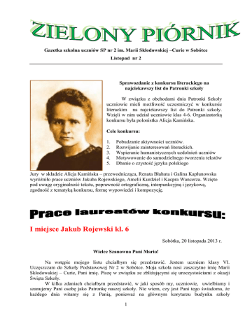 Gazetka szkolna uczniów SP nr 2 im. Marii Skłodowskiej –Curie w Sobótce Listopad nr 2 Sprawozdanie z konkursu literackiego na najciekawszy list do Patronki szkoły W związku z obchodami dnia Patronki Szkoły uczniowie mieli możliwość uczestniczyć w konkursie literackim na najciekawszy list do Patronki szkoły. Wzięli w nim udział uczniowie klas 4-6. Organizatorką konkursu była polonistka Alicja Kamińska. Cele konkursu: 1. 2. 3. 4. 5. Pobudzanie aktywności uczniów. Rozwijanie zainteresowań literackich. Wspieranie humanistycznych uzdolnień uczniów Motywowanie do samodzielnego tworzenia tekstów Dbanie o czystość języka polskiego Jury w składzie Alicja Kamińska – przewodnicząca, Renata Błahuta i Galina Kapłunowska wyróżniło prace uczniów Jakuba Rojewskiego, Amelii Kurdziel i Kacpra Wancerza. Wzięto pod uwagę oryginalność tekstu, poprawność ortograficzną, interpunkcyjną i językową, zgodność z tematyką konkursu, formę wypowiedzi i kompozycję. I miejsce Jakub Rojewski kl. 6 Sobótka, 20 listopada 2013 r. Wielce Szanowna Pani Mario! Na wstępie mojego listu chciałbym się przedstawić. Jestem uczniem klasy VI. Uczęszczam do Szkoły Podstawowej Nr 2 w Sobótce. Moja szkoła nosi zaszczytne imię Marii Skłodowskiej – Curie, Pani imię. Piszę w związku ze zbliżającymi się uroczystościami z okazji Święta Szkoły. W kilku zdaniach chciałbym przedstawić, w jaki sposób my, uczniowie, uwielbiamy i szanujemy Pani osobę jako Patronkę naszej szkoły. Nie wiem, czy jest Pani tego świadoma, że każdego dnia witamy się z Panią, ponieważ na głównym korytarzu budynku szkoły 1 umiejscowiony jest Pani popiersie na tle biało-czerwonej flagi. Codzienne „spotkanie” z Panią zobowiązuje nas, uczniów, do starań i wysiłków, aby dzień nauki był dla nas owocny w wiedzę, a zachowanie wzorowe. Jest przecież Pani dla nas największym autorytetem i wzorem, z którego czerpiemy przykład. Towarzyszy nam Pani w każdym ważnym dniu - podczas uroczystości szkolnych, takich jak np.: rozpoczęcie roku szkolnego, Dzień Edukacji Narodowej, Dzień Niepodległości, rocznica uchwalenia Konstytucji 3-Maja, zakończenie roku szkolnego. Jest Pani zawsze obecna wśród nas! Nasza Szkoła posiada sztandar, na którym złotymi nićmi wyhaftowany jest Pani wizerunek. Poczet Sztandarowy wprowadza sztandar, a my w postawie na baczność śpiewamy hymn państwowy i hymn szkoły. W jego treści wspominamy również o Pani. Dla młodego Polaka, takiego jak ja, chlubą jest, że swoją ciężką pracą i poświęceniem dla nauki przyniosła Pani rozgłos naszej Ojczyźnie na cały świat. Gratuluję przyznanej Nagrody Nobla. Jestem zachwycony tak Wielką Polką, jak Pani. Wzorem Pani nie szczędzę wysiłków, aby zdobywać wiedzę i umiejętności. Planuję w przyszłości zdobyć ciekawy zawód, którym będę mógł – podobnie jak Pani – służyć moim Rodakom i Ojczyźnie. Powtarzam często Pani słowa: „Trzeba mieć odwagę i (…) wiarę w siebie, (…) że się jest do czegoś zdolnym i że do tego czegoś dojść trzeba”. Moim marzeniem jest wyjazd do Paryża, spotkanie z Panią i zwiedzenie laboratorium, w którym zostały odkryte pierwiastki rad i polon. Marzenia często się spełniają, a do tego potrzeba wytrwałości, zapału do pracy i zadowolenia z tego, co się robi. Chyba mi się to udaje. Kończąc, przesyłam wyrazy szacunku. Serdecznie pozdrawiam. Jakub Rojewski II miejsce Amelia Kurdziel kl. 4 Sobótka, 21 listopada 2013r Szanowna Pani Mario! Nazywam się Amelia Kurdziel. Jestem uczennicą Szkoły Podstawowej nr 2 w Sobótce, której patronem jest Pani. Codziennie przechadzam się po naszym szkolnym holu i widzę Pani popiersie, które stoi dumnie na granitowym cokole. Często się zastanawiam, skąd pani czerpała siłę, chęci oraz wytrwałość w dążeniu do celu. Była Pani pierwszą kobietą, która obroniła doktorat na Sorbonie, pierwszą, która prowadziła wykłady na tej uczelni oraz pierwszą, która zdobyła Nagrodę Nobla. Tak wiele Pani osiągnęła w bardzo trudnych czasach. Gdy mam chwilę słabości oraz zwyczajnego lenistwa, Pani pomaga mi zebrać siły i wciąż chętnie pracować. Wiem, że dzięki systematyczności i wytrwałości można osiągnąć wiele, tak jak Pani. Jest Pani wzorem dla dzisiejszej młodzieży, przekazując jej najważniejsze wartości w życiu, jakimi są pracowitość i zapał w poszukiwaniu odpowiedzi na nieznane. Dumnie jest chodzić do szkoły opatrzonej tak zacnym patronatem. Z wyrazami szacunku Amelia Kurdziel 2 III miejsce Kacper Wancerz kl.5 Sobótka, 14 listopada 2013 Szanowna Pani Mario! Na pewno dziwi Panią ten list od chłopca, którego Pani nie zna. Długo zastanawiałem się, co mam napisać w tym liście. Pomimo, że nie znamy się, ja Panią spotykam codziennie na szkolnym korytarzu. Jest Pani patronką szkoły, do której chodzę od pięciu lat. Może napiszę parę słów o sobie. Mam 11 lat, jestem jedynakiem. W szkole radzę sobie całkiem nieźle. Jak większość moich rówieśników interesuję się grami komputerowymi. Rodzice ciągle protestują i twierdzą, że wieczory powinienem spędzać przy książkach i pogłębiać wiedzę. Przypominają o tym również nauczyciele w mojej szkole, przekazując nam, jak ważna jest nauka, tradycja i pamięć. Za kilka dni będziemy obchodzili Święto Szkoły. Z tej okazji przeczytałem kilka artykułów o Pani osiągnieciach naukowych, co bardzo mnie zaciekawiło. Była Pani z zawodu fizykiem i chemikiem, lecz to drugie zajęcie bardziej poprowadziło Panią przez życie. To Pani wynalazła pierwiastki, takie jak rad i polon. A także wprowadziła Pani nową gałęź chemii- radiochemię, co pomagało leczyć raka. Jest Pani naszą dumą, gdyż została Pani dwukrotną noblistką. Dziś chemia poszła do przodu, ale nasza patronka odgrywała ważną rolę w jej początku. Teraz - spoglądając z góry - jest pewnie 