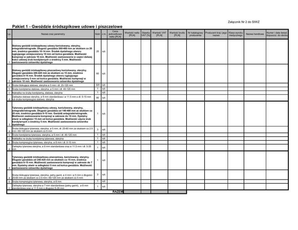 Załącznik Nr 2 do SIWZ Pakiet 1 - Gwoździe śródszpikowe udowe i piszczelowe Lp. Nazwa oraz parametry Stalowy gwóźdź śródszpikowy udowy kaniulowany, sterylny, antegrade/retrograde. Długość gwoździa 260-480 mm ze skokiem co 20 mm, średnica gwoździa 10-14 mm. Środek dystalnego otworu ryglującego umiejscowiony 10 mm od końca gwoździa. Możliwość kompresji w zakresie 10 mm. Możliwość zastosowania w części dalszej kości udowej śrub kondylarnych o średnicy 5 mm. Możliwość 1 zastosowania celownika dystalnego Stalowy gwóźdź śródszpikowy piszczelowy kaniulowany, sterylny. Długość gwoździa 240-420 mm ze skokiem co 15 mm, średnica gwoździa 8-14 mm. Środek dystalnego otworu ryglującego umiejscowiony 5 mm od końca gwoździa. Możliwość kompresji w 2 zakresie 10 mm. Możliwość zastosowania celownika dystalnego Cena Ilość J.m. jednostkowa netto [PLN] 20 szt. 60 szt. 320 szt. b Śruba kondylarna stalowa, sterylna, ø 5 mm i dł. 40-120 mm 1 szt. c Nakrętka na śrubę kondylarną, stalowa, sterylna 1 szt. Zaślepka stalowa sterylna, ø 8 mm standardowa i ø 11.5 mm o dł. 5-15 mm d lub śruba kompresyjna stalowa, sterylna 80 szt. 1 szt. Śruba blokująca tytanowa, sterylna, ø 5 mm, dł. 25-60 mm ze skokiem co 2.5 a mm i 60-120 mm ze skokiem co 5 mm 3 szt. b Śruba kondylarna tytanowa, sterylna, ø 5 mm i dł. 40-120 mm 1 szt. c Nakładka na śrubę kondylarną tytanowa, sterylna 1 szt. d Śruba kompresyjna tytanowa, sterylna, ø 8 mm i dł. 0-15 mm 1 szt. Zaślepka tytanowa sterylna, ø 8 mm standardowa oraz ø 11.5 mm i dł. 5-35 e mm 1 szt. 1 szt. Śruba blokująca tytanowa, sterylna, pełny gwint, ø 4 mm i ø 5 mm o długości a 25-60 mm ze skokiem co 2.5 mm i 60-120 mm ze skokiem co 5 mm 3 szt. b Śruba kompresyjna tytanowa, sterylna, ø 8 mm 1 szt. Zaślepka tytanowa, sterylna ø 7 mm standardowa (pełny gwint), ø 8 mm c standardowa oraz ø 11.5 mm o długości 5-35 mm 1 szt. a Śruba blokująca stalowa, sterylna ø 5 mm i dł. 25-120 mm Tytanowy gwóźdź śródszpikowy udowy, kaniulowany, sterylny, antegrade/retrograde. Długość gwoździa od 140-480 mm ze skokiem co 20 mm, średnica gwoździa 9-15 mm. Gwóźdź antegrade/retrograde. Możliwość zastosowania kompresji w zakresie do 10 mm. Dystalny otwór w odległości 15 mm od końca gwoździa. Możliwość użycia śrub kondylarnych o średnicy 5 mm. Możliwość zastosowania celownika 3 dystalnego Tytanowy gwóźdź śródszpikowy piszczelowy, kaniulowany, sterylny. Długość gwoździa od 240-420 mm ze skokiem co 15 mm, średnica gwoździa 8-15 mm. Możliwość zastosowania kompresji w zakresie do 7 mm. Dystalny otwór w odległości 5 mm od końca gwoździa. Możliwość 4 zastosowania celownika dystalnego RAZEM Wartość netto Stawka Wartość VAT [PLN] VAT [%] [PLN] Wartość brutto [PLN] Nr katalogowy producenta Producent kraj i jego Klasa wyrobu nazwa medycznego Nazwa handlowa Numer i data świad. dopuszcz. do obrotu Pakiet 2 - Płyty nasadowe do złamań piszczeli i strzałki Lp. Nazwa oraz parametry Ilość J.m. Stalowa płyta ukształtowana anatomicznie do bliższej nasady kości piszczelowej, boczna, prawa/lewa. Ilość otworów w trzonie: od 2 do 14. W części nasadowej płyty 4 otwory gwintowane pod śruby blokowane ø 4.0 mm i 2 otwory niegwintowane pod śruby gąbczaste ø 4.0 mm oraz otwór podpórkowy pod śrubę blokowaną ø 4.0 mm skierowaną we fragment tylno-przyśrodkowy. W trzonie płyty naprzemiennie otwory standardowe pod śruby korowe ø 3.5 mm oraz otwory gwintowane na całym obwodzie pod śruby blokowane ø 4.0 mm. Na całej długości płyty otwory do wprowadzenia drutów Kirschnera. Możliwość zastosowania przeziernego celownika 10 szt. Stalowa płyta ukształtowana anatomicznie do dalszej nasady kości piszczelowej, przednioboczna, prawa/lewa. Ilość otworów w trzonie: od 4 do 16. W części nasadowej płyty 3 otwory gwintowane pod śruby blokowane ø 4.0 mm i otwory niegwintowane pod śruby gąbczaste ø 4.0 mm oraz otwór podpórkowy pod śrubę blokowaną ø 4.0 mm skierowaną we fragment przyśrodkowy. W trzonie płyty naprzemiennie otwory standardowe pod śruby korowe ø 3.5 mm oraz otwory gwintowane na całym obwodzie pod śruby blokowane ø 4.0 mm. Na całej długości płyty otwory do wprowadzenia drutów Kirschnera 10 szt. Stalowa płyta ukształtowana anatomicznie do dalszej nasady kości piszczelowej, przyśrodkowa, prawa/lewa. Ilość otworów w trzonie: od 4 do 16. W części nasadowej płyty 4 otwory gwintowane pod śruby blokowane ø 4.0 mm i otwory niegwintowane pod śruby gąbczaste ø 4.0 mm oraz otwór podpórkowy pod śrubę blokowaną ø 4.0 mm skierowaną we fragment boczny. W trzonie płyty naprzemiennie otwory standardowe pod śruby korowe ø 3.5 mm oraz otwory gwintowane na całym obwodzie pod śruby blokowane ø 4.0 mm. Na całej długości płyty otwory do wprowadzenia drutów Kirschnera 10 szt. 120 szt. 60 szt. 20 szt. Tytanowe płytki anatomiczne do zespoleń złamań dalszej nasady kości strzałkowej. Grubość płytek w części trzonowej 2.0 mm, w części nasadowej 1.3 mm. Szerokość płytek w części trzonowej 10 mm, w części nasadowej 16 mm. Ilość otworów: od 3 do 12. Długość płytek: od 77 do 185 mm. Otwory niegwintowane do śrub o średnicy 3.5 mm korowych i blokowanych z nagwintowanymi głowami, które blokują się w płycie przez plastyczne wytworzenie gwintu w trakcie wkręcania, bez konieczności stosowania śrubokrętu dynamometrycznego. Możliwość ustawienia kąta wprowadzenia śruby blokowanej w zakresie +/- 15° 20 szt. Śruba blokowana tytanowa ø 3.5 mm, dł. 10-70 mm 100 szt. Śruba korowa tytanowa ø 3.5 mm, dł. 10-70 mm 40 szt. Cena jednostkowa netto [PLN] 1 2 3 a Stalowa śruba blokująca ø 4.0 mm, dł. 14-95 mm b Stalowa śruba korowa ø 3.5 mm, dł. 14-95 mm Stalowa śruba gąbczasta ø 4.0 mm (częściowo lub w pełni gwintowana), dł. c 14-95 mm RAZEM Wartość netto [PLN] Stawka VA