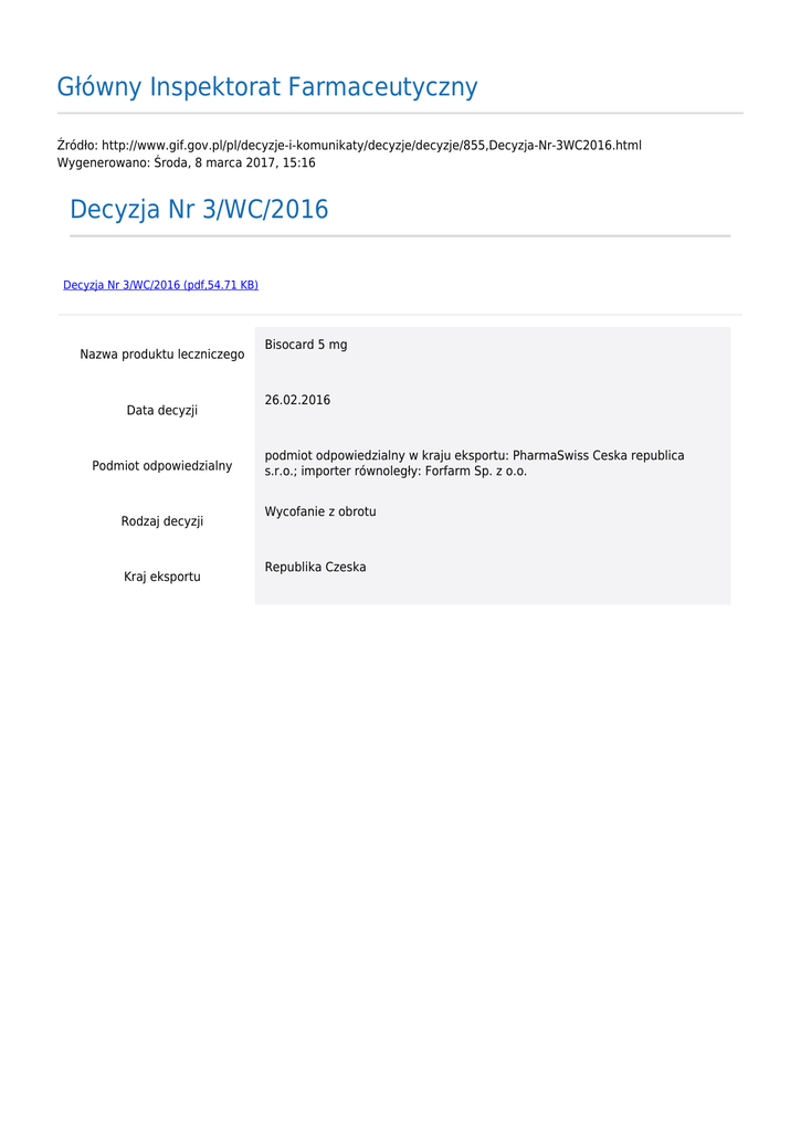 Główny Inspektorat Farmaceutyczny Źródło: http://www.gif.gov.pl/pl/decyzje-i-komunikaty/decyzje/decyzje/855,Decyzja-Nr-3WC2016.html Wygenerowano: Środa, 8 marca 2017, 15:16 Decyzja Nr 3/WC/2016 Decyzja Nr 3/WC/2016 (pdf,54.71 KB) Nazwa produktu leczniczego Data decyzji Podmiot odpowiedzialny Rodzaj decyzji Kraj eksportu Bisocard 5 mg 26.02.2016 podmiot odpowiedzialny w kraju eksportu: PharmaSwiss Ceska republica s.r.o.; importer równoległy: Forfarm Sp. z o.o. Wycofanie z obrotu Republika Czeska