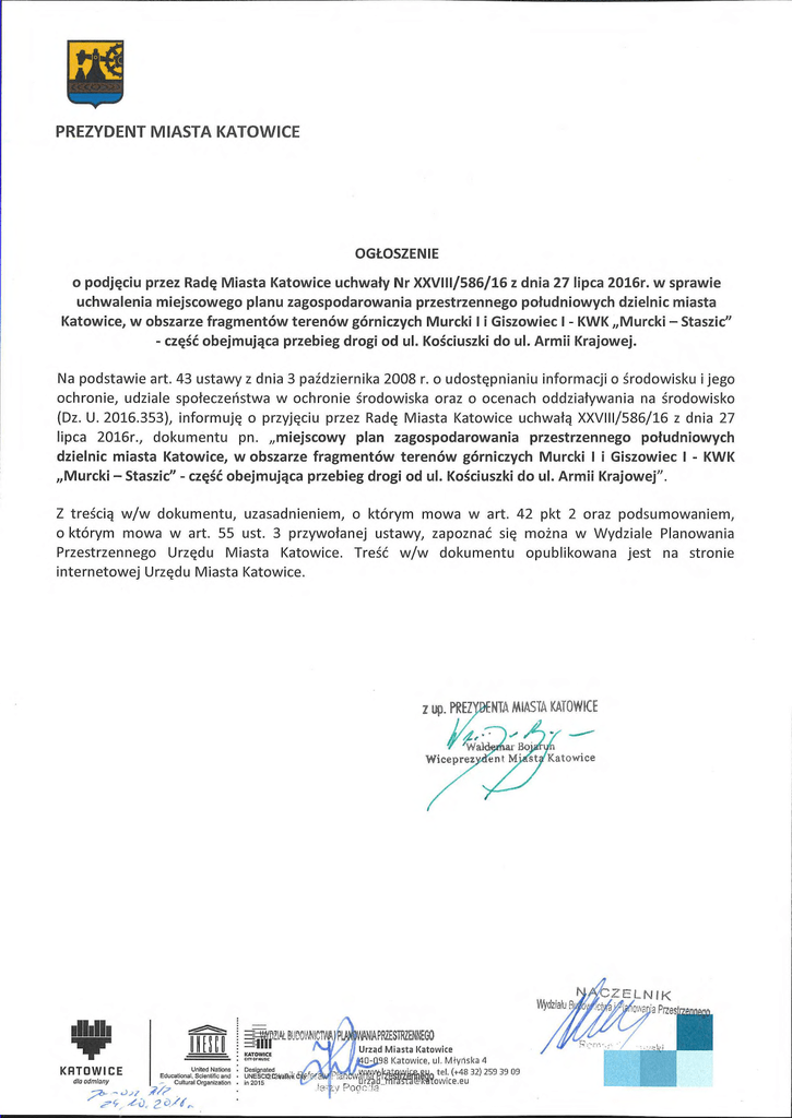 PREZYDENT MIASTA KATOWICE OGŁOSZENIE o podjęciu przez Radę Miasta Katowice uchwały Nr XXVIII/586/16 z dnia 27 lipca 2016r. w sprawie uchwalenia miejscowego planu zagospodarowania przestrzennego południowych dzielnic miasta Katowice, w obszarze fragmentów terenów górniczych Murcki I i Giszowiec I - KWK „Murcki — Staszic" - część obejmująca przebieg drogi od ul. Kościuszki do ul. Armii Krajowej. Na podstawie art. 43 ustawy z dnia 3 października 2008 r. o udostępnianiu informacji o ś rodowisku i jego ochronie, udziale społeczeństwa w ochronie ś rodowiska oraz o ocenach oddziaływania na ś rodowisko (Dz. U. 2016.353), informuję o przyjęciu przez Radę Miasta Katowice uchwałą XXVIII/586/16 z dnia 27 lipca 2016r., dokumentu pn. „miejscowy plan zagospodarowania przestrzennego południowych dzielnic miasta Katowice, w obszarze fragmentów terenów górniczych Murcki I i Giszowiec I - KWK „Murcki — Staszic" - część obejmująca przebieg drogi od ul. Kościuszki do ul. Armii Krajowej". Z treścią w/w dokumentu, uzasadnieniem, o którym mowa w art. 42 pkt 2 oraz podsumowaniem, o którym mowa w art. 55 ust. 3 przywołanej ustawy, zapoznać się moż na w Wydziale Planowania Przestrzennego Urzędu Miasta Katowice. Treść w/w dokumentu opublikowana jest na stronie internetowej Urzędu Miasta Katowice. z up. PREZ NTA MIASTA KATOWICE Wiceprez Katowice ZE L N IK WydzIału WHO KRTOWICE dla odmlany ""--4157 4L BI lONNICTWA iurrowia United Nations Designated Educational, Scientific and UNESCQQ-dia Cultural Organization • in 2015 ,?7> MAPRESTRZENNEGO Urzad Miasta Katowice 8 Katowice, ul. Młyńska 0 POC, 4 , w„., tel. (+48 32) 259 39 09 v_IsAW WEowice.eu O,va 'a Przes