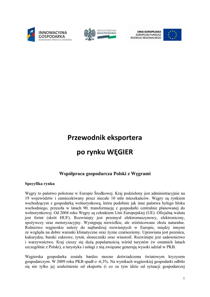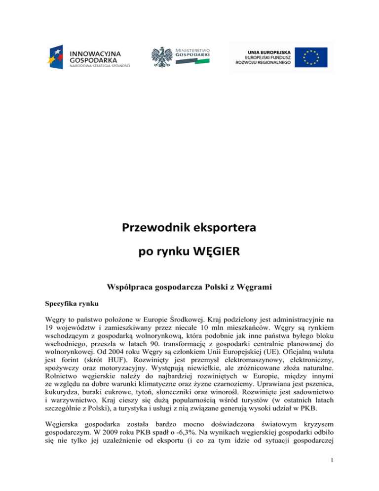 Przewodnik eksportera po rynku WĘGIER Współpraca gospodarcza Polski z Węgrami Specyfika rynku Węgry to państwo położone w Europie Środkowej. Kraj podzielony jest administracyjnie na 19 województw i zamieszkiwany przez niecałe 10 mln mieszkańców. Węgry są rynkiem wschodzącym z gospodarką wolnorynkową, która podobnie jak inne państwa byłego bloku wschodniego, przeszła w latach 90. transformację z gospodarki centralnie planowanej do wolnorynkowej. Od 2004 roku Węgry są członkiem Unii Europejskiej (UE). Oficjalną waluta jest forint (skrót HUF). Rozwinięty jest przemysł elektromaszynowy, elektroniczny, spożywczy oraz motoryzacyjny. Występują niewielkie, ale zróżnicowane złoża naturalne. Rolnictwo węgierskie należy do najbardziej rozwiniętych w Europie, między innymi ze względu na dobre warunki klimatyczne oraz żyzne czarnoziemy. Uprawiana jest pszenica, kukurydza, buraki cukrowe, tytoń, słoneczniki oraz winorośl. Rozwinięte jest sadownictwo i warzywnictwo. Kraj cieszy się dużą popularnością wśród turystów (w ostatnich latach szczególnie z Polski), a turystyka i usługi z nią związane generują wysoki udział w PKB. Węgierska gospodarka została bardzo mocno doświadczona światowym kryzysem gospodarczym. W 2009 roku PKB spadł o -6,3%. Na wynikach węgierskiej gospodarki odbiło się nie tylko jej uzależnienie od eksportu (i co za tym idzie od sytuacji gospodarczej 1 u głównych odbiorców), ale także bardzo słaby rynek wewnętrzny. W dwóch kolejnych latach węgierskie PKB rosło bardzo powoli – o 1,2% w roku 2010 i 1,7% w 2011 (dane wstępne), co oznacza że jeszcze długo będą odrabiane straty z roku 2009. Obecny (2012) roku zapowiada się jeszcze trudniejszy. Rząd prognozuje wzrost gospodarczy na jedynie 0,5%, MFW na 0,3%, ale wiele instytucji przewiduje dla Węgier ponowną, choć nie tak głęboką jak poprzednio, recesję. Pierwsze dostępne dane statystyczne (produkcja przemysłowa) potwierdzają tezę o ponownym hamowaniu gospodarki. Wymiana handlowa Od wielu lat wymiana handlowa, w tym także polski eksport szybko rośnie. Eksport Import Obroty Saldo 2004 1.532,7 1.346,4 2.879,2 +186,3 2005 2.035,1 1.466,6 3.501,7 +568,5 2006 2.672,1 2.164,3 4.836,4 +507,8 2007 2.960,0 2.536,4 5.496,4 +423,6 2008 3.230,1 2.526,4 5.756,5 +703,8 2009 2010 2.654,8 3.404,1 2.010,2 2.332,8 4.664,9 5.736,9 +644,6 +1.071,3 2011 3.471,7 2.613,9 6.085,7 +857,7 w mln euro Źródło: dane GUS , 2011 – dane wstępne Po dobrym początku 2011 roku, w kolejnych kwartałach dynamika polskiego eksportu na Węgry zaczęła słabnąć. O ile jeszcze na koniec pierwszego kwartału wzrost eksportu wynosił około 14%, to na koniec roku wyniósł już tylko 2%. Ten nie najlepszy wynik nie powinien jednak być zaskoczeniem, jeżeli weźmie się pod uwagę stan węgierskiej gospodarki. W 2011 roku wzrost PKB szacowany jest jedynie na 1,7%. W ciągu roku wyhamowywała także dynamika węgierskiej produkcji przemysłowej, osiągając w listopadzie tylko 3,5% wzrostu - wynik ponad trzykrotnie niższy niż na początku roku. Najpoważniejszym zagrożeniem dla gospodarki węgierskiej są nie najlepsze wyniki gospodarki niemieckiej. Jest ona największym odbiorcą węgierskiego eksportu (głównie wyrobów przemysłowych), stąd spowolnienie w Niemczech będzie miało bardzo negatywne skutki dla Węgier. Drugim czynnikiem wpływającym negatywnie jest brak rozwoju rynku wewnętrznego. Sprzedaż na rynek wewnętrzny cały czas spada, popyt wewnętrzny z miesiąca na miesiąc maleje, budownictwo szósty rok znajduje się w recesji (coraz zresztą poważniejszej). W efekcie polski eksport (według wstępnych danych GUS) w 2011 roku osiągnął wartość 3.471,7 mln euro i było to więcej o 2% od wyniku z 2010 roku. Import z Węgier miał wartość 2.614,0 mln euro i było to więcej o 12% niż w ubiegłym roku. Łączne obroty wzrosły o 6% do wartości 6.085,7 mln euro. Polski eksport na Węgry w 2011 roku Wartość w Dynamika Struktura na Struktura na mln euro w% koniec 2009 roku koniec 2011 roku Zwierzęta i prod. poch. zwierzęcego 3,7 3,8 131,7 82 Rośliny 0,5 0,9 30,5 149 Tłuszcze 0,9 0,7 24,7 100 Przetworzona żywność 13,3 8,5 296,2 109 Nazwa sekcji 2 Polski eksport na Węgry w 2011 roku Nazwa sekcji Wartość w Dynamika Struktura na Struktura na mln euro w% koniec 2009 roku koniec 2011 roku Produkty mineralne 0,9 1,9 67,0 97 Produkty chemiczne 8,1 7,2 248,2 128 Tworzywa sztuczne 6,6 7,5 259,8 118 Skóry 0,8 0,6 22,1 108 Drewno 1,3 0,7 22,7 93 Papier 4,0 3,0 104,7 112 Tekstylia i ubrania 2,6 2,2 77,6 121 Buty, czapki 0,3 0,1 5,2 77 Ceramika i wyroby z kamieni 2,0 1,7 60,1 111 Metale i kamienie szlachetne 0,1 0,1 3,3 101 Metale nieszlachetne 9,9 12,5 433,3 122 Maszyny i urządzenia 29,4 38,1 1.321,9 90 Pojazdy 9,1 6,9 238,9 100 Wyroby precyzyjne 0,5 0,5 16,0 118 Towary różne (meble) 5,3 3,1 107,5 100 RAZEM 3.471,7 102 100,0 100,0 Źródło: GUS dane wstępne Saldo handlowe jest dla Polski dodatnie i wynosi 857,7 mln euro. Wśród towarów rolnych i spożywczych największa grupa - żywność przetworzona, notowała przyzwoity wzrost dostaw, mimo wielkiej presji ze strony węgierskich dystrybutorów na obniżanie cen. Dostawy tytoniu i papierosów (największe pozycje w eksporcie rolnym) powróciły do wielkości sprzed dwóch lat. Równocześnie notujemy zwiększony eksport roślin (nasiona rzepaku i kukurydzy!). Spadek dostaw trzody chlewnej żywej (drugiej co do wartości grupy produktów rolnych) w części jest rekompensowany zwiększonymi dostawami mięsa (wieprzowego, wołowiny, drobiowego) oraz przetworów mięsnych. Mimo mniejszej wartości eksportu cieszy większy wywóz produktów bardziej przetworzonych. Rosnącą dynamikę dostaw wykazują sekcje produktów chemicznych (chemikalia i tworzywa sztuczne). Mimo bardzo trudnej sytuacji na węgierskim rynku odzieżowym (wzrost sprzedaży od lat wykazuje jedynie odzież używana) polskie ubrania 