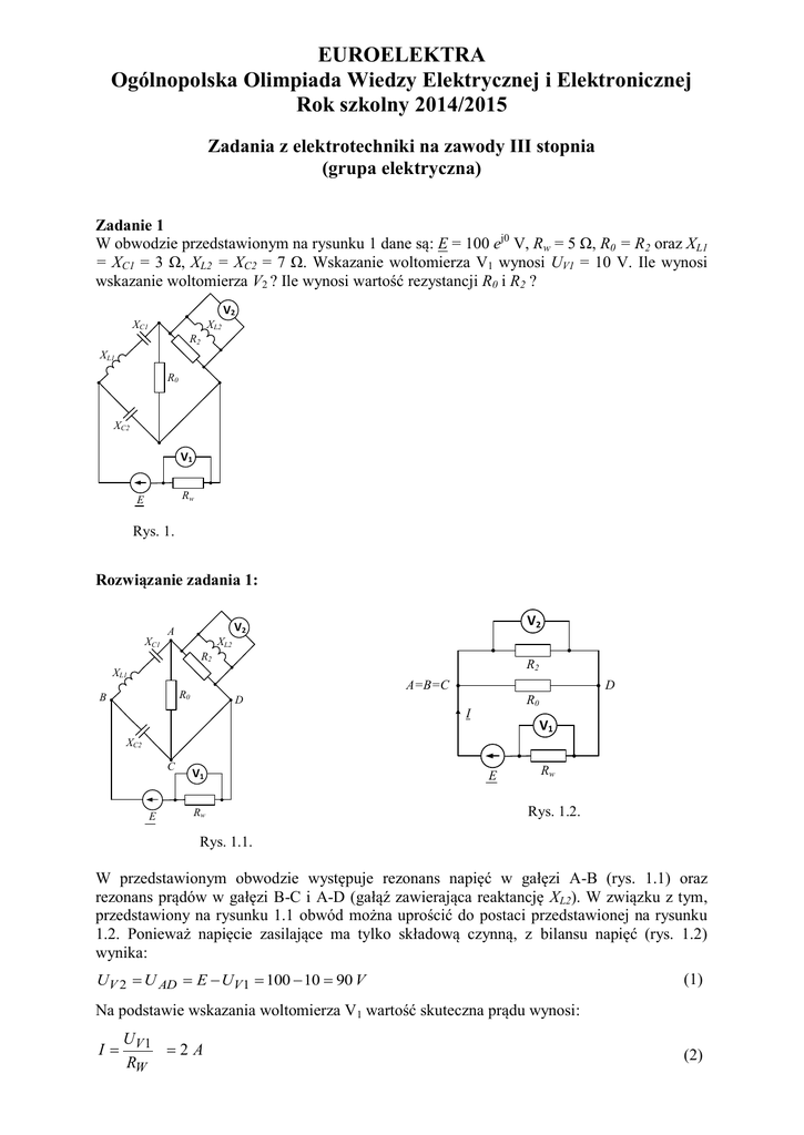 EUROELEKTRA Ogólnopolska Olimpiada Wiedzy Elektrycznej i Elektronicznej Rok szkolny 2014/2015 Zadania z elektrotechniki na zawody III stopnia (grupa elektryczna) Zadanie 1 W obwodzie przedstawionym na rysunku 1 dane są: E = 100 ej0 V, Rw = 5 Ω, R0 = R2 oraz XL1 = XC1 = 3 Ω, XL2 = XC2 = 7 Ω. Wskazanie woltomierza V1 wynosi UV1 = 10 V. Ile wynosi wskazanie woltomierza V2 ? Ile wynosi wartość rezystancji R0 i R2 ? V2 XL2 XC1 R2 XL1 R0 XC2 V1 Rw E Rys. 1. Rozwiązanie zadania 1: V2 V2 A XC1 XL2 R2 R2 XL1 A=B=C R0 B D R0 D I V1 XC2 C E V1 Rw E Rw Rys. 1.2. Rys. 1.1. W przedstawionym obwodzie występuje rezonans napięć w gałęzi A-B (rys. 1.1) oraz rezonans prądów w gałęzi B-C i A-D (gałąź zawierająca reaktancję XL2). W związku z tym, przedstawiony na rysunku 1.1 obwód można uprościć do postaci przedstawionej na rysunku 1.2. Ponieważ napięcie zasilające ma tylko składową czynną, z bilansu napięć (rys. 1.2) wynika: UV 2 U AD E UV 1 100 10 90 V (1) Na podstawie wskazania woltomierza V1 wartość skuteczna prądu wynosi: U I V1 2 A RW (2) W obwodzie jak na rysunku 1.2 prąd I jest w fazie z napięciem E, zatem: E R R RW 0 2 R0 R2 I (3) Ponieważ R0 = R2: E I R RW 0 2 (4) Wobec tego, podstawiając wartość prądu (2) do równania (4) otrzymamy: 100 R 5 0 2 2 R0 90 R2 (5) Zadanie 2 Uzasadnić równoważność obwodów przedstawionych na rysunku 2. a) M L1 L1R1 -M c) b) L2 C3 L1+M L1+M C3 C3 L2 R1 A R1 A B B A B Rys. 2 Rozwiązanie zadania 2 Uzasadnienie równoważności obwodu przedstawionego na rysunku 2.1.a i 2.1.b: a) f L1R1 I2 I2 I3 C3 L2 -M c) b) I3 M L1 L2 I2 I3 L1+M C3 L1+M C3 R1 R1 I1 I1 I1 A U B A U B A U B Rys. 2.1. Uzwojenie „1” i uzwojenie „2” są nawinięte na rdzeń w tym samym kierunku. Jeżeli do zacisków A-B przyłożymy napięcie przemienne, to prąd w obydwu cewkach płynie od umownie oznaczonych początków obu cewek (rys. 2.1.a). W takim przypadku mamy do czynienia ze sprzężeniem dodatnim cewek, co pokazane jest na schemacie „b” (rys. 2.1.b). Równoważność obwodu „b” i „c” udowodnimy w oparciu o prawa Kirchhoffa: Dla schematu „b” zapisujemy układ równań w postaci zespolonej: (1) (2) (3) Z równania (3) wyznaczamy prąd I2: (4) i podstawiamy do równania (1): (5) Po przekształceniu równania (5) otrzymujemy: (6) Do równania (2) podstawiamy prąd I1 (równanie (3)). Wówczas: (7) Stąd (8) Równania (6), (8) oraz (3) opisują obwód przedstawiony na schemacie „c”. Zadanie 3 Silnik indukcyjny klatkowy ma następujące dane znamionowe: PN = 12 kW, UN = 400 V, nN = 1430 obr/min., cosφN = 0,86, ηN = 88%, f1N = 50 Hz, przeciążalność znamionowa momentem λN = 2,5. Silnik pracujący w warunkach znamionowych został przełączony na sieć o napięci U = 400 V i częstotliwości f1 = 40 Hz. Wyznaczyć moment obrotowy tuż po przełączeniu silnika. Jaki rodzaj pracy wystąpi po przełączeniu silnika. Uwaga: - przeciążalność momentem jest określona zależnością: - poślizg krytyczny sk dla charakterystyki naturalnej obliczamy z zależności: - wartość momentu elektromagnetycznego po przełączeniu silnika obliczyć z wzoru Klossa dla charakterystyki po zmianie parametrów zasilania: Rozwiązanie zadania 3 M. Mk *. b. Mk. a. MN. nN. n1. 0 n1* . n Mx. Rys. 5.1. Silnik pracuje przy zasilaniu napięciem znamionowym o częstotliwości znamionowej. W stanie ustalonym silnik pracuje obciążony momentem znamionowym – punkt pracy MN na charakterystyce „a” (rys. 5.1). Obliczamy parametry znamionowego punktu pracy: - moment znamionowy (1) - poślizg przy obciążeniu znamionowym – na podstawie danych znamionowych wnioskujemy, że silnik ma p = 2 pary biegunów czyli prędkość synchroniczna n1 = 1500 obr/min.: (2) oraz: - wartość momentu krytycznego przy zasilaniu napięciem znamionowym: (3) - poślizg krytyczny w tych warunkach (na podstawie wzoru Klossa) (4) czyli (5) W chwili przełączenia silnika (t = 0 s) na sieć o napięciu U = 400 V i częstotliwości f1 = 40 Hz zmieni się wartość momentu wytwarzanego przez silnik, natomiast prędkość obrotowa pozostanie taka sama – silnik będzie rozwijał moment Mx (charakterystyka „b” na rys. 5.1). Dla charakterystyki „b” zmieni się wartość momentu krytycznego i poślizgu krytycznego. Ponieważ zmianie uległa częstotliwość napięcia zasilania prędkość synchroniczna w tych warunkach wynosi: (6) Stąd poślizg dla momentu Mx w chwili przełączenia: (7) Moment krytyczny dla charakterystyki „b” wynosi: (8) oraz poślizg krytyczny (9) Wartość momentu po przełączeniu silnika wynosi (z wzoru Klossa): (10) Ujemna wartość momentu wskazuje, że silnik rozwija moment hamujący, natomiast ujemna wartość poślizgu wskazuje na hamowanie odzyskowe. Zadanie 4 Dany jest transformator trójfazowy o mocy znamionowej SN = 75 kVA, napięciach znamionowych 1000/400 V, Yy0. Straty mocy w uzwojeniach transformatora przy obciążeniu prądem znamionowym wynoszą ΔPCu = 990 W, natomiast straty w rdzeniu przy zasileniu napięciem znamionowym ΔPFe = 300 W. Przy jakim obciążeniu rezystancyjnym i zasileniu napięciem znamionowym sprawność transformatora będzie mieć wartość maksymalną. Wyznaczyć wartość tej sprawności. Uwaga - przyjąć: - rezystancja zwarcia jednej fazy transformatora Rz = R1 + R2’ = 0,176 Ω, - reaktancja zwarcia jednej fazy transformatora Xz = X1 + X2’ = 0,576 Ω, - spadek napięcia transformatora ΔU = U1 – υ U2 = I1 (Rz cosφodb ± Xz sinφodb), gdzie υ jest przekładnią transformatora. Rozwiązanie zadania 4 Maksymalna sprawność transformatora wystąpi w warunkach gdy ΔPCu = ΔPFe. Straty w uzwojeniach transformatora dla dowolnej wartości prądu obciążenia wynoszą: (1) Przy obciążeniu prądem znamionowym (2) Dzieląc równanie (1) przez równanie (2), otrzymujemy: (3) Z równania (3) wyznaczamy wartość prądu I1: (4) Wartość prądu znamionowego transformatora wynosi: (5) Ponieważ dla maksym