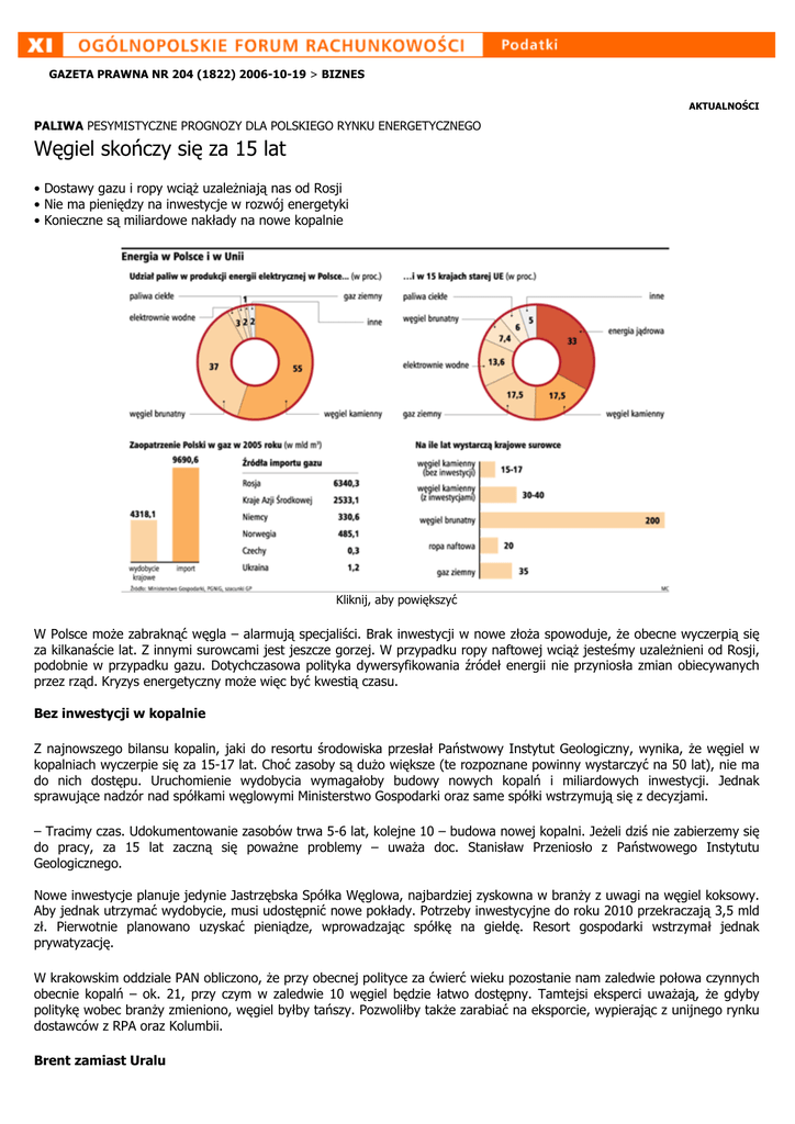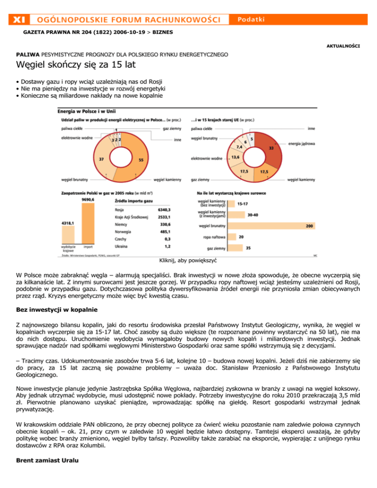 GAZETA PRAWNA NR 204 (1822) 2006-10-19 > BIZNES AKTUALNOŚCI PALIWA PESYMISTYCZNE PROGNOZY DLA POLSKIEGO RYNKU ENERGETYCZNEGO Węgiel skończy się za 15 lat • Dostawy gazu i ropy wciąż uzależniają nas od Rosji • Nie ma pieniędzy na inwestycje w rozwój energetyki • Konieczne są miliardowe nakłady na nowe kopalnie Kliknij, aby powiększyć W Polsce może zabraknąć węgla – alarmują specjaliści. Brak inwestycji w nowe złoża spowoduje, że obecne wyczerpią się za kilkanaście lat. Z innymi surowcami jest jeszcze gorzej. W przypadku ropy naftowej wciąż jesteśmy uzależnieni od Rosji, podobnie w przypadku gazu. Dotychczasowa polityka dywersyfikowania źródeł energii nie przyniosła zmian obiecywanych przez rząd. Kryzys energetyczny może więc być kwestią czasu. Bez inwestycji w kopalnie Z najnowszego bilansu kopalin, jaki do resortu środowiska przesłał Państwowy Instytut Geologiczny, wynika, że węgiel w kopalniach wyczerpie się za 15-17 lat. Choć zasoby są dużo większe (te rozpoznane powinny wystarczyć na 50 lat), nie ma do nich dostępu. Uruchomienie wydobycia wymagałoby budowy nowych kopalń i miliardowych inwestycji. Jednak sprawujące nadzór nad spółkami węglowymi Ministerstwo Gospodarki oraz same spółki wstrzymują się z decyzjami. – Tracimy czas. Udokumentowanie zasobów trwa 5-6 lat, kolejne 10 – budowa nowej kopalni. Jeżeli dziś nie zabierzemy się do pracy, za 15 lat zaczną się poważne problemy – uważa doc. Stanisław Przeniosło z Państwowego Instytutu Geologicznego. Nowe inwestycje planuje jedynie Jastrzębska Spółka Węglowa, najbardziej zyskowna w branży z uwagi na węgiel koksowy. Aby jednak utrzymać wydobycie, musi udostępnić nowe pokłady. Potrzeby inwestycyjne do roku 2010 przekraczają 3,5 mld zł. Pierwotnie planowano uzyskać pieniądze, wprowadzając spółkę na giełdę. Resort gospodarki wstrzymał jednak prywatyzację. W krakowskim oddziale PAN obliczono, że przy obecnej polityce za ćwierć wieku pozostanie nam zaledwie połowa czynnych obecnie kopalń – ok. 21, przy czym w zaledwie 10 węgiel będzie łatwo dostępny. Tamtejsi eksperci uważają, że gdyby politykę wobec branży zmieniono, węgiel byłby tańszy. Pozwoliłby także zarabiać na eksporcie, wypierając z unijnego rynku dostawców z RPA oraz Kolumbii. Brent zamiast Uralu Wstrzymanie dostaw ropy do przejmowanej przez Orlen litewskiej rafinerii w Możejkach pokazało, jak niebezpieczne może być opieranie się na praktycznie jedynym dostawcy tego surowca – Rosji. Roczne krajowe zużycie ropy szacowane jest na ok. 22 mln ton, z czego blisko 97 proc. to import ropy typu Ural. Pozostałe 3 proc. kupujemy w Kazachstanie, na Ukrainie, w Czechach i Norwegii. Własne zasoby, szacowane na ok. 19,5 mln ton, nie zaspokoiłyby nawet rocznego zapotrzebowania. – Rosjanie, walcząc o wpływy na rynku, w dalszym ciągu stosują środki zwiększające siłę oddziaływania na rządy i podmioty gospodarcze. Trzeba więc liczyć się z możliwością perturbacji w dostawach – uważa Janusz Steinhoff, były wicepremier w rządzie Jerzego Buzka. Groźbę kryzysu energetycznego mogłaby zażegnać budowa elektrowni jądrowej, o której wspominał w swoim exposé premier Jarosław Kaczyński. Jednak na razie nic w tym celu nie zostało zrobione Przy tym całkowitym uzależnieniu mamy zawór bezpieczeństwa: gdański Naftoport, o zdolnościach przeładunkowych 34 mln ton (razem ze stanowiskami Portu Północnego), dwukrotnie przekraczających roczne potrzeby przerobowe polskich rafinerii. Problem w tym, że import statkami znacznie podnosi koszty produkcji. Mimo to, gdańska Grupa Lotos zdecydowała się sprowadzić sondażowo 1 mln baryłek z Kuwejtu. Bardzo możliwe, że wkrótce podpisze długoterminowy kontrakt z dostawcą. Opinie co do zasadności tej transakcji są podzielone. Część ekspertów widzi korzyści. – Wszystko zależy od ceny. Skoro na ropie brent pracują inne rafinerie i mogą być rentowne, dlaczego przyjmujemy założenie, że polskie rafinerie mogą być rentowne tylko na ropie rosyjskiej? – pyta Robert Gwiazdowski, prezes Centrum im. Adama Smitha. – To nie ma sensu. Dopóki istnieje możliwość kupowania ropy rosyjskiej, trzeba z niej korzystać. Tu powinna decydować ekonomia – zauważa Janusz Szum, niezależny konsultant branży paliwowej, były przedstawiciel Jukosu na Polskę. Mglisty gazoport W przypadku gazu nie ma takiej alternatywy. Do tej pory rząd nie znalazł recepty na zabezpieczenie się przed zakręceniem rosyjskiego kurka. O tym, że jest to możliwe, pokazało wstrzymanie dostaw na Białoruś i Ukrainę. Polska zużywa rocznie ok. 14,5 mld metrów sześc. gazu, z których jedna trzecia pochodzi ze źródeł krajowych. Większość importu realizuje lub kontroluje rosyjski Gazprom. Według raportu Biura Bezpieczeństwa Narodowego w perspektywie krótkoterminowej możemy jedynie złagodzić zagrożenie: rozbudowując własne magazyny gazu i budując połączenia z siecią gazową Niemiec. W perspektywie średniej (3-4 lata) moglibyśmy zdywersyfikować dostawy poprzez budowę terminalu LNG i dołączając się do budowy gazociągu Nabucco (gaz z Iranu). Gazoport byłby jednak budowany w okresie, gdy na rynku LNG wysoki popyt uniemożliwia szybkie zakontraktowanie dostaw. Tymczasem bez wcześniejszego podpisania kontraktów budowa terminala obarczona jest ogromnym ryzykiem. Z kolei Nabucco, podobnie jak inne projekty gazociągów (Sarmacja czy Amber), wciąż pozostają w sferze projektów. Adam Woźniak [email protected], współpraca Cezary Pytlos Więcej artykułów z podobnym nagłówkiem ... OPINIE Przemysław Wipler kierujący zespołem ds. dywersyfikacji dostaw nośników energii w Ministerstwie Gospodarki Jednym z elementów dywersyfikacji są działania podejmowane w związku z budową terminalu gazu skroplonego LNG. Do końca listopada będzie gotowe studium wykonalności projektu, równ