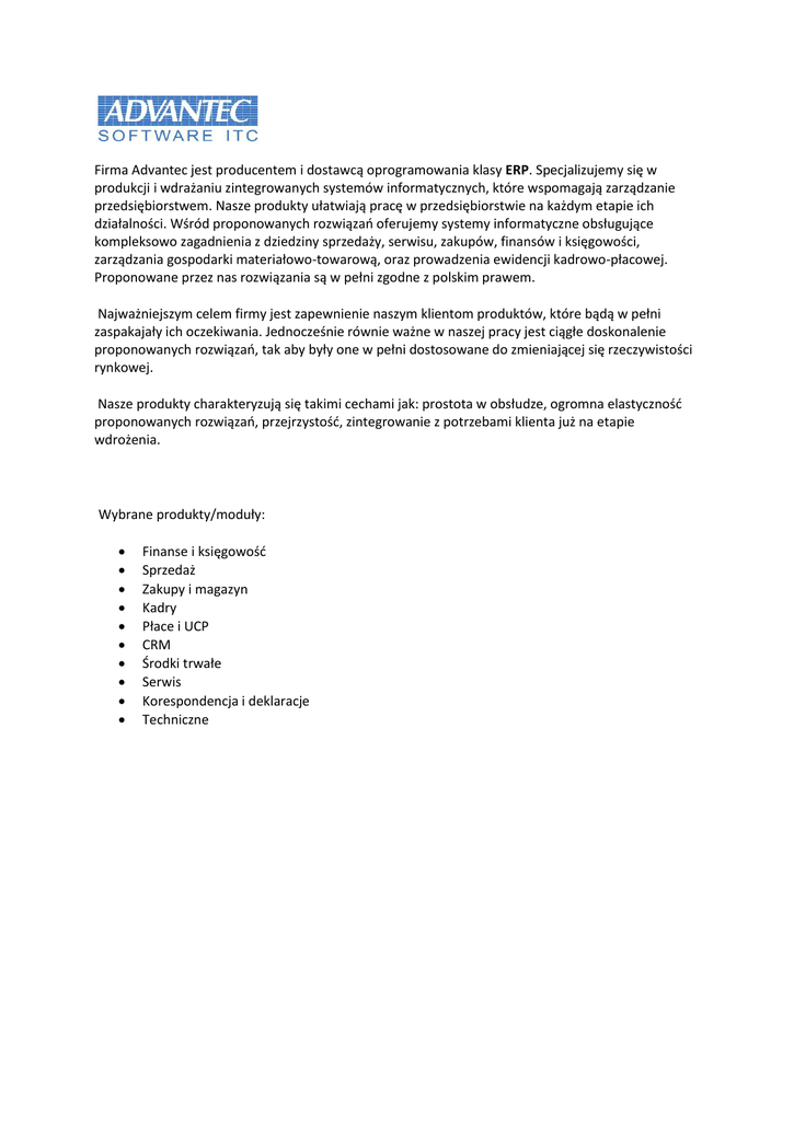 Firma Advantec jest producentem i dostawcą oprogramowania klasy ERP. Specjalizujemy się w produkcji i wdrażaniu zintegrowanych systemów informatycznych, które wspomagają zarządzanie przedsiębiorstwem. Nasze produkty ułatwiają pracę w przedsiębiorstwie na każdym etapie ich działalności. Wśród proponowanych rozwiązao oferujemy systemy informatyczne obsługujące kompleksowo zagadnienia z dziedziny sprzedaży, serwisu, zakupów, finansów i księgowości, zarządzania gospodarki materiałowo-towarową, oraz prowadzenia ewidencji kadrowo-płacowej. Proponowane przez nas rozwiązania są w pełni zgodne z polskim prawem. Najważniejszym celem firmy jest zapewnienie naszym klientom produktów, które bądą w pełni zaspakajały ich oczekiwania. Jednocześnie równie ważne w naszej pracy jest ciągłe doskonalenie proponowanych rozwiązao, tak aby były one w pełni dostosowane do zmieniającej się rzeczywistości rynkowej. Nasze produkty charakteryzują się takimi cechami jak: prostota w obsłudze, ogromna elastycznośd proponowanych rozwiązao, przejrzystośd, zintegrowanie z potrzebami klienta już na etapie wdrożenia. Wybrane produkty/moduły: Finanse i księgowośd Sprzedaż Zakupy i magazyn Kadry Płace i UCP CRM Środki trwałe Serwis Korespondencja i deklaracje Techniczne