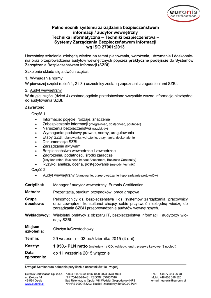 Pełnomocnik systemu zarządzania bezpieczeństwem informacji / audytor wewnętrzny Technika informatyczna – Techniki bezpieczeństwa – Systemy Zarządzania Bezpieczeństwem Informacji wg ISO 27001:2013 Uczestnicy szkolenia zdobędą wiedzę na temat planowania, wdrożenia, utrzymania i doskonalenia oraz przeprowadzenia audytów wewnętrznych poprzez praktyczne podejście do Systemów Zarządzania Bezpieczeństwem Informacji (SZBI). Szkolenie składa się z dwóch części: 1. Wymagania normy W pierwszej części (dzień 1, 2 i 3.) uczestnicy zostaną zapoznani z zagadnieniami SZBI. 2. Audyt wewnętrzny W drugiej części (dzień 4) zostaną ogólnie przedstawione wszystkie ważne informacje niezbędne do audytowania SZBI. Zawartość Część 1 Informacje: pojęcie, rodzaje, znaczenie Zabezpieczenie informacji (integralność, dostępność, poufność) Naruszenia bezpieczeństwa (przykłady) Wymagania: podstawy prawne, normy, uregulowania Etapy SZBI: planowania, wdrożenie, utrzymanie, doskonalenie Dokumentacja SZBI Zarządzanie aktywami Bezpieczeństwo wewnętrzne i zewnętrzne Zagrożenia, podatności, środki zaradcze (listy kontrolne, Business Impact Assesment, Business Continuity) Ryzyko: analiza, ocena, postępowanie (metody, techniki) Część 2 Audyt wewnętrzny (planowanie, przeprowadzanie i sporządzanie protokołów) Certyfikat: Manager / audytor wewnętrzny Euronis Certification Metoda: Prezentacja, studium przypadków, praca grupowa Grupa docelowa: Pełnomocnicy ds. bezpieczeństwa i ds. systemów zarządzania, pracownicy oraz zewnętrzni konsultanci chcący sobie przyswoić niezbędną wiedzę do zarządzania SZBI i przeprowadzania audytów wewnętrznych. Wykładowcy: Wieloletni praktycy z obszaru IT, bezpieczeństwa informacji i audytorzy wiodący SZBI. Miejsce szkolenia: Olsztyn k/Częstochowy Termin: 29 września – 02 października 2015 (4 dni) Koszty: 1 950,- PLN netto (materiały na CD, wykłady, lunch, przerwy kawowe, 3 noclegi) Data zgłoszenia: do 11 września 2015 włącznie Uwaga! Seminarium odbędzie przy liczbie uczestników 10 i więcej Euronis Certification Sp. z o.o. ul. Zielona 14 45-554 Opole www.euronis.pl Konto : 15 1050 1966 1000 0023 2578 4003 NIP 754-26-81-431 REGON 531857318 Sąd Rejonowy w Opolu, VIII Wydział Gospodarczy KRS Nr KRS 0000152293, Kapitał zakładowy 50.000,00 PLN Tel.: +48 77 454 06 78 Mobil: +48 608 319 520 e-mail : [email protected] Konto Bankowe: Osoba do kontaktu: ING Bank Śląski o/Opole nr konta: 15 1050 1966 1000 0023 2578 4003 Anna Bajor – 608 319 520 Uwaga! Seminarium odbędzie przy liczbie uczestników 10 i więcej Euronis Certification Sp. z o.o. ul. Zielona 14 45-554 Opole www.euronis.pl Konto : 15 1050 1966 1000 0023 2578 4003 NIP 754-26-81-431 REGON 531857318 Sąd Rejonowy w Opolu, VIII Wydział Gospodarczy KRS Nr KRS 0000152293, Kapitał zakładowy 50.000,00 PLN Tel.: +48 77 454 06 78 Mobil: +48 608 319 520 e-mail : [email protected] ZGŁOSZENIE na SEMINARIUM: „Pełnomocnik SZBI / audytor wewnętrzny ” ZGŁASZAJĄCY Pełna nazwa firmy: Dokładny adres: tel.: (+48 - ) e-mail: NIP: Imię i nazwisko osoby zgłaszanej na szkolenie – stanowisko 1. 2. 3. Imię i nazwisko osoby dokonującej zgłoszenia – stanowisko Data zgłoszenia: Pieczęć i podpis osoby upoważnionej Uwaga! Seminarium odbędzie przy liczbie uczestników 10 i więcej Euronis Certification Sp. z o.o. ul. Zielona 14 45-554 Opole www.euronis.pl Konto : 15 1050 1966 1000 0023 2578 4003 NIP 754-26-81-431 REGON 531857318 Sąd Rejonowy w Opolu, VIII Wydział Gospodarczy KRS Nr KRS 0000152293, Kapitał zakładowy 50.000,00 PLN Tel.: +48 77 454 06 78 Mobil: +48 608 319 520 e-mail : [email protected]