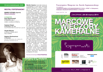 RECITAL FORTEPIANOWY MAMIKO UEYAMA (Japonia) Wieczór preludiów w programie: Karol Szymanowski 6 Preludiów z op. 1 h-moll nr 1, b-moll nr 4, d-moll nr 5, c-moll nr 7, es-moll nr 8, b-moll nr 9 Fryderyk Chopin 6 Preludiów z op. 28 A-dur / fis-moll / E-dur / cis-moll/ H-dur / gis-moll Claude Debussy La fille aux cheveux de lin Feux d'artifice Sergiusz Rachmaninow 5 Preludiów D-dur op. 23, g-moll op. 23, c-moll op. 23, gis-moll op. 32, Des-dur op. 32 Mamiko Ueyama rozpoczęła naukę gry na fortepianie w 3 roku życia. Ukończyła Akademię Muzyczną w Osace w klasie prof. S. Ueda. Po ukończeniu Akademii Muzycznej została tam zatrudniona w charakterze asystentki. Już w czasie studiów występowała wielokrotnie z recitalami oraz jako solistka z orkiestrą Opera House w Osace. W 1993 została finalistką Konkursu Japońskiego Stowarzyszenia Pianistów Pedagogów (JPTAK) otrzymując nagrodę specjalną. W 1994 roku na Koncercie Młodych Talentów w Japonii zdobyła nagrodę specjalną za wykonanie utworów Karola Szymanowskiego. W 1997 roku uczestniczyła w "Wieczorze Chopinowskim" zorganizowanym przez Japońskie Stowarzyszenie Chopinowskie. W 1997 roku odbyła trzyletni staż podyplomowy w Polsce. Ukończyła go z oceną celującą. Następnie brała udział w wielu konkursach pianistycznych m.in. w Międzynarodowym Konkursie im. Karola Szymanowskiego w Łodzi w 2001 roku, oraz Międzynarodowym Konkursie im. Marii Canals w Barcelonie w 2003 roku gdzie otrzymała honorowy medal. Artystka doskonaliła swój warsztat pod kierunkiem profesorów: K. Katada, S. Ueda, M. Noijma, J. Romaniuka, R. Sanjinez, K. Kennera i T. Szebanowej. Ma bardzo szeroki repertuar sięgający od Bacha, przez Mozarta, Beethovena, Chopina, Schumanna, Rachmaninowa, po klasyków XX wieku. Koncerty komentuje dr Karol Rafał Bula Podaruj 1% muzyce Aby wesprzeć działalność Towarzystwa Muzycznego im. Karola Szymanowskiego wystarczy podać w zeznaniu podatkowym KRS 0000085929 Darowiznę pieniężną w dowolnej kwocie można również przekazać bezpośrednio na konto: 47 1540 1128 2112 7004 6528 0001 Wszystkim darczyńcom gorąco dziękujemy! Towarzystwo Muzyczne im. Karola Szymanowskiego we współpracy z MUZEUM KAROLA SZYMANOWSKIEGO W WILLI „Atma” w Zakopanem, Oddziałem MUZEUM NARODOWEGO w Krakowie zaprasza na Zakopane | 29-30 marca 2014 marcowe wieczory kameralne DLA UPAMIĘTNIENIA 77. ROCZNICY ŚMIERCI KAROLA SZYMANOWSKIEGO Pa r t n e r koncertu 30 marca (niedziela) godz. 18.00 Dofinansowano ze środków Ministerstwa Kultury i Dziedzictwa Narodowego Imp r e s a r i a t a r t y s t y c z n y M a ł g o r z ata J a w o r s k a pat r o n at m e d i a l n y miejsce koncertów: WILLA „Atma”, ul. Kasprusie 19 29 marca (sobota) godz. 18.00 WIECZÓR KAMERALNY ADAM MOKRUS – skrzypce MAGDALENA LISAK – fortepian w programie: Witold Lutosławski Partita (1984) Allegro giusto / Ad libitum / Largo / Ad libitum / Presto Karol Szymanowski Romans op. 23 Mity, trzy poematy op. 30 Źródło Aretuzy / Narcyz / Driady i Pan Kołysanka (La berceuse d’Aïtacho Enia) op. 52 Pieśń Roksany z opery „Król Roger” (1926) Pieśń kurpiowska (1931) Taniec z baletu „Harnasie” (1931) Adam Mokrus ukończył studia z wynikiem celującym w Akademii Muzycznej im. Karola Szymanowskiego w Katowicach w klasie skrzypiec prof. Pawła Puczka i ad. Beaty Warykiewicz-Siwy. Odbył studia podyplomowe w macierzystej uczelni pod kierunkiem ad. Piotra Pławnera. Swoje umiejętności wiolinistyczne doskonalił na kursach mistrzowskich m.in. pod kierunkiem Konstantego Andrzeja Kulki, Stefana Kamasy i Romana Jabłońskiego podczas Musica Festa Gedaniae w Gdańsku, gdzie otrzymał nagrodę specjalną dla najlepszego uczestnika. Jako solista i kameralista uczestniczył w wielu koncertach i festiwalach, występował z czołowymi orkiestrami polskimi. Najważniejsze doświadczenia artystyczne to wspólne koncerty wraz z Konstantym Andrzejem Kulką (Gdańsk, Częstochowa). W latach 2003-2009 pełnił funkcję koncertmistrza orkiestry symfonicznej Filharmonii Częstochowskiej, z którą występował w kraju i za granicą (Niemcy, Belgia, Holandia, Korea Południowa). Obok działalności artystycznej prowadzi również działalność pedagogiczną. Jest zatrudniony w katowickiej Akademii Muzycznej na stanowisku adiunkta. Magdalena Lisak urodzona w Katowicach pielęgnuje rodzinne tradycje muzyczne. Od najmłodszych lat zdobywała najwyższe laury na konkursach krajowych i międzynarodowych. W 1994 roku ukończyła z wyróżnieniem klasę fortepianu prof. Andrzeja Jasińskiego w Akademii Muzycznej im. Karola Szymanowskiego w Katowicach. W tym samym roku, po dojściu do półfinału Konkursu Gézy Andy w Zurychu otrzymała prywatne stypendium i kontynuowała naukę w Konser- watorium w Zurychu u Homero Francescha. Jednym z jej najcenniejszych doświadczeń były studia w Musik-Akademie w Bazylei w latach 1996-1998 pod kierunkiem Krystiana Zimermana. Zdobyta na XIII Międzynarodowym Konkursie Pianistycznym im. Fryderyka Chopina w Warszawie w 1995 roku VI nagroda otworzyła Magdalenie Lisak drzwi do prestiżowych sal koncertowych, jak Hitomi Memorial Hall w Tokio, Stadt– Casino w Bazylei, Rudolfinum w Pradze czy Filharmonii Narodowej w Warszawie. Uczestniczyła także w festiwalach chopinowskich w Dusznikach-Zdroju, NohantLa Châtre, Mariańskich Łaźniach, Gandawie, Genewie oraz Festiwalu „Chopin i jego Europa” w Warszawie. Jej interpretacje zostały utrwalone dla Deutsche Rundfunk, Radio Suisse Romande, Polskiego Radia, Telewizji Polskiej oraz na płytach CD dla firmy DUX oraz Polskiego Radia Katowice. Występuje regularnie z recitalami, wykonuje koncerty z orkiestrami i zespołami kameralnymi w Polsce i większości krajów europejskich, a także w USA, Kanadzie, Japonii, Chinach i Brazylii. Fascynuje ją muzyka najnowsza. W 2000 roku wykonała dla György Ligetiego jego Etiudy, których interpretacja spotkała się z wysoką oceną kompozyto