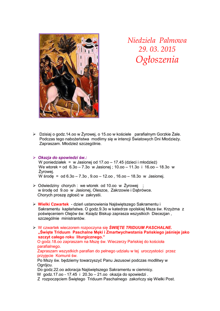 Niedziela Palmowa 29. 03. 2015 Ogłoszenia Dzisiaj o godz.14.oo w Żyrowej, o 15.oo w kościele parafialnym Gorzkie Żale. Podczas tego nabożeństwa modlimy się w intencji Światowych Dni Młodzieży. Zapraszam. Młodzież szczególnie. Okazja do spowiedzi św.: W poniedziałek = w Jasionej od 17.oo – 17.45 (dzieci i młodzież) We wtorek = od 6.3o – 7.3o w Jasionej ; 10.oo – 11.3o i 16.oo – 18.3o w Żyrowej. W środę = od 6.3o – 7.3o , 9.oo – 12.oo , 16.oo – 18.3o w Jasionej. Odwiedziny chorych : we wtorek od 10.oo w Żyrowej ; w środę od 9.oo w Jasionej, Oleszce, Zakrzowie i Dąbrówce. Chorych proszę zgłosić w zakrystii. Wielki Czwartek - dzień ustanowienia Najświętszego Sakramentu i Sakramentu kapłaństwa. O godz.9.3o w katedrze opolskiej Msza św. Krzyżma z poświęceniem Olejów św. Ksiądz Biskup zaprasza wszystkich Diecezjan , szczególnie ministrantów. W czwartek wieczorem rozpoczyna się ŚWIĘTE TRIDUUM PASCHALNE. „Święte Triduum Paschalne Męki i Zmartwychwstania Pańskiego jaśnieje jako szczyt całego roku liturgicznego.” O godz.18.oo zapraszam na Mszę św. Wieczerzy Pańskiej do kościoła parafialnego. Zapraszam wszystkich parafian do pełnego udziału w tej uroczystości przez przyjęcie Komunii św. Po Mszy św. będziemy towarzyszyć Panu Jezusowi podczas modlitwy w Ogrójcu. Do godz.22.oo adoracja Najświętszego Sakramentu w ciemnicy. W godz.17.oo - 17.45 i 20.3o – 21.oo okazja do spowiedzi . Z rozpoczęciem Świętego Triduum Paschalnego zakończy się Wielki Post. Wielki Piątek - dzień w którym umarł Pan Jezus. Obowiązuje post ścisły. O godz.8.oo zapraszam na nabożeństwo Drogi Krzyżowej do kościoła parafialnego. Po nabożeństwie próba obrzędów dla ministrantów. O godz.18.oo Obrzędy Wielkopiątkowe z adoracją Krzyża św. i Komunią św. Po nabożeństwie adorujemy Pana Jezusa w Grobie. O godz.20.oo parafianie z Jasionej i Oleszki ; 21.oo parafianie z Żyrowej ; o 22.oo parafianie z Zakrzowa i Dąbrówki ; o 23.oo młodzież ; o 24.oo zakończenie adoracji . O godz.7.oo – 7.45 ; 17.oo – 17.45 i 20.3o – 21.oo – okazja do spowiedzi św. Ofiara składana przy nawiedzeniu Bożego Grobu przeznaczone jest na utrzymanie kościołów w Ziemi Świętej. Możemy też złożyć skarbonki „Jałmużna postna” . Na Górze św. Anny obchody kalwaryjskie. Wielka Sobota - adorujemy Pana Jezusa w Grobie. Zalecany jest post jakościowy, jak w każdy piątek. Godz.11.oo - próba obrzędów dla ministrantów. Godz.12.oo - poświęcenie pokarmów wielkanocnych. Po poświęceniu adoracja Bożego Grobu do godz.18.oo. Godz.16.oo - poświęcenie pokarmów wielkanocnych w Żyrowej. W I E L K A N O C .O godz.22.oo w sobotę zapraszam na Obrzędy Wielkanocne: poświęcenie ognia i paschału, Orędzie Wielkanocne, poświęcenie wody chrzcielnej, odnowienie przyrzeczeń chrzcielnych, Mszę św. wielkanocną i procesję. Przynosimy świece. Do udziału w liturgii wielkanocnej zapraszam wszystkich parafian. Szczególnie proszę młodzież, panie i strażaków ze sztandarami; orkiestrę, mężczyzn do baldachimu, ministrantów. W dzień Wielkanocy Msze św. jak w niedzielę. Kolekta wielkanocna jest przeznaczona na parafialne remonty i inwestycje. Po południu zapraszam na nieszpory wielkanocne: o 14.oo do Żyrowej , o 15.oo do kościoła parafialnego. Proszę zgłosić w zakrystii chorych parafian, którzy chcieliby przyjąć Komunię św. w Święta. W Poniedziałek Wielkanocny porządek Mszy św. niedzielny. Podczas sumy uroczyste udzielanie chrztu św. Modlitwą i ofiarą wspieramy Katolicki Uniwersytet Lubelski. Zapowiedzi: Patryk Żurek z Zakrzowa i Ines Lepich z Rozwadzy = zap. III. Z czasopism: Gość Niedzielny, Różaniec, Anioł Stróż, Tak rodzinie