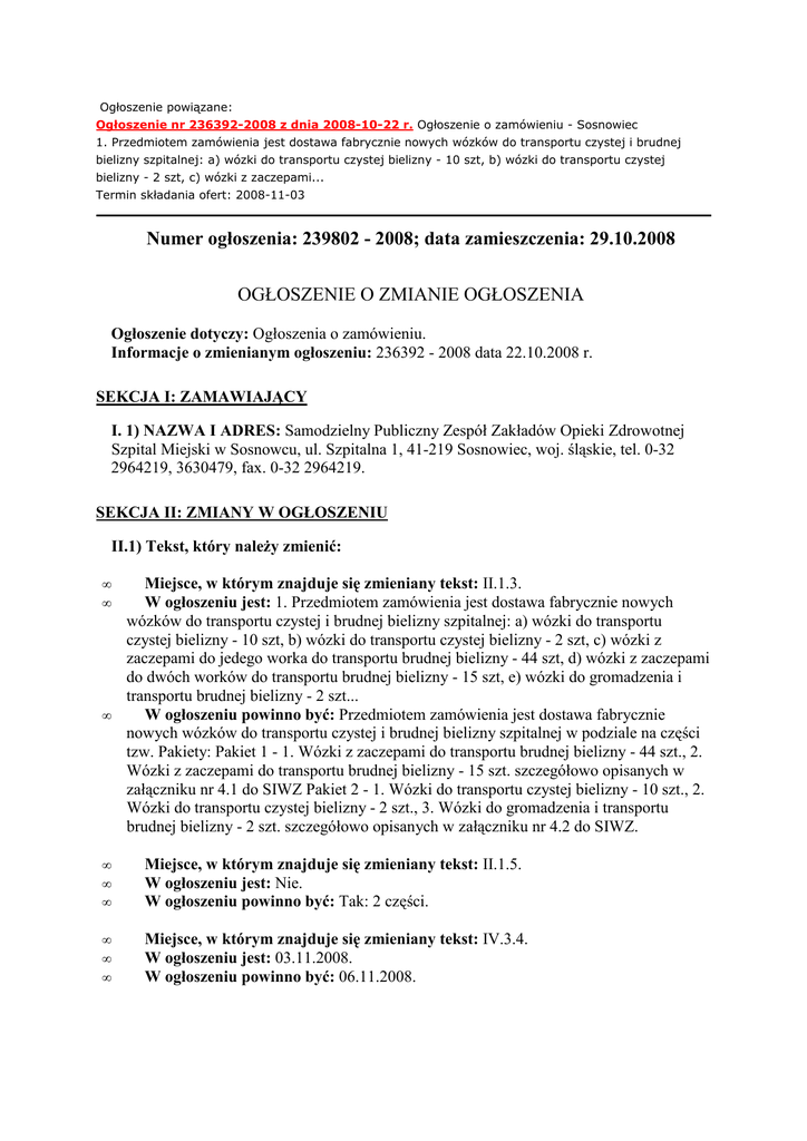 Ogłoszenie powiązane: Ogłoszenie nr 236392-2008 z dnia 2008-10-22 r. Ogłoszenie o zamówieniu - Sosnowiec 1. Przedmiotem zamówienia jest dostawa fabrycznie nowych wózków do transportu czystej i brudnej bielizny szpitalnej: a) wózki do transportu czystej bielizny - 10 szt, b) wózki do transportu czystej bielizny - 2 szt, c) wózki z zaczepami... Termin składania ofert: 2008-11-03 Numer ogłoszenia: 239802 - 2008; data zamieszczenia: 29.10.2008 OGŁOSZENIE O ZMIANIE OGŁOSZENIA Ogłoszenie dotyczy: Ogłoszenia o zamówieniu. Informacje o zmienianym ogłoszeniu: 236392 - 2008 data 22.10.2008 r. SEKCJA I: ZAMAWIAJĄCY I. 1) NAZWA I ADRES: Samodzielny Publiczny Zespół Zakładów Opieki Zdrowotnej Szpital Miejski w Sosnowcu, ul. Szpitalna 1, 41-219 Sosnowiec, woj. śląskie, tel. 0-32 2964219, 3630479, fax. 0-32 2964219. SEKCJA II: ZMIANY W OGŁOSZENIU II.1) Tekst, który naleŜy zmienić: • • • Miejsce, w którym znajduje się zmieniany tekst: II.1.3. W ogłoszeniu jest: 1. Przedmiotem zamówienia jest dostawa fabrycznie nowych wózków do transportu czystej i brudnej bielizny szpitalnej: a) wózki do transportu czystej bielizny - 10 szt, b) wózki do transportu czystej bielizny - 2 szt, c) wózki z zaczepami do jedego worka do transportu brudnej bielizny - 44 szt, d) wózki z zaczepami do dwóch worków do transportu brudnej bielizny - 15 szt, e) wózki do gromadzenia i transportu brudnej bielizny - 2 szt... W ogłoszeniu powinno być: Przedmiotem zamówienia jest dostawa fabrycznie nowych wózków do transportu czystej i brudnej bielizny szpitalnej w podziale na części tzw. Pakiety: Pakiet 1 - 1. Wózki z zaczepami do transportu brudnej bielizny - 44 szt., 2. Wózki z zaczepami do transportu brudnej bielizny - 15 szt. szczegółowo opisanych w załączniku nr 4.1 do SIWZ Pakiet 2 - 1. Wózki do transportu czystej bielizny - 10 szt., 2. Wózki do transportu czystej bielizny - 2 szt., 3. Wózki do gromadzenia i transportu brudnej bielizny - 2 szt. szczegółowo opisanych w załączniku nr 4.2 do SIWZ. • • • Miejsce, w którym znajduje się zmieniany tekst: II.1.5. W ogłoszeniu jest: Nie. W ogłoszeniu powinno być: Tak: 2 części. • • • Miejsce, w którym znajduje się zmieniany tekst: IV.3.4. W ogłoszeniu jest: 03.11.2008. W ogłoszeniu powinno być: 06.11.2008.