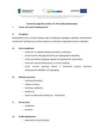 Scenariusz zajęć dla uczniów z kl. 0-III szkoły podstawowej I. Temat: Jak zostać EcoBohaterem? II. Cel ogólny: Doskonalenie przez uczniów podczas zajęć umiejętności segregacji odpadów, kształtowanie świadomości ekologicznej uczniów związanej z właściwym zagospodarowaniem odpadów. III. Cele szczegółowe: Uczeń wie, że odpady szkodzą przyrodzie i środowisku, Uczeń rozumie, dlaczego tak ważne jest segregowanie odpadów, Uczeń prawidłowo segreguje odpady do odpowiednich pojemników, Uczeń wie i potrafi wytłumaczyć, co to jest recykling, Uczeń rozumie potrzebę dbania o środowisko wykorzystanie odpadów i ich segregację. IV. Metody nauczania: rozmowa kierowana, zabawa ruchowa, rozmowa z pokazem, praktyczna, oparta na aktywności praktyczno – technicznej. V. Formy pracy: zespołowa, grupowa. VI. Środki dydaktyczne: pojemniki w trzech kolorach, poprzez ponowne trzy obrazki do naklejenia na kolorowe pojemniki, na których jest słoik, plastikowa butelka, gazeta (załącznik nr 1, 2, 3), czyste odpady z trzech różnych grup (tworzywa sztuczne, papierowe, szklane), klej, taśma klejąca, sznurek, drucik, gumki recepturki, nożyczki. VII. Przebieg zajęć 1. Powitanie uczniów Nauczyciel wita uczniów i zaprasza ich do ustawienia się w kole. 2. Przedstawienie tematu zajęć Nauczyciel wyjaśnia uczniom, że zajęcia rozpoczynamy od zabawy, która ma pomóc w odgadnięciu tematu zajęć. Nauczyciel podaje kolejno zdania określające problem odpadów. Uczniowie, którzy domyślają się, czego dotyczą zdania, podnoszą do góry rękę. Jeśli po kolejnym zdaniu nie są pewne prawidłowej odpowiedzi, dyskretnie opuszczają rękę. Po podaniu wszystkich przygotowanych zdań większość uczniów ma rękę w górze i wszystkie razem na znak prowadzącego podają głośno odpowiedź. Dzieci odgadują, że zajęcia dotyczą śmieci. Przykłady zdań: Można je znaleźć wszędzie. Wszyscy je produkują. Jest ich coraz więcej. Większość to opakowania. Mogą się w nie zaplątać zwierzęta. Czasami są niebezpieczne. Nie wolno ich palić w piecu domowym. Mogą być z papieru, plastiku, metalu lub szkła. Czasami brzydko pachną. Gdy są w pokoju to jest brudno. Wyrzucamy je do kosza. 3. Zabawa ruchowa „Ekologiczny spacer” Nauczyciel rozkłada na wytyczonym miejscu kilka plastikowych butelek (butelki bez zakrętek). Na sygnał nauczyciela uczniowie rozpoczynają spacer. Poruszając się po wyznaczonym miejscu uczniowie mają za zadanie omijać butelki i nie dotykać ich. Nauczyciel dokłada coraz więcej śmieci: kule z gazet, worki foliowe, butelki. Z czasem spacer jest coraz trudniejszy. Nauczyciel pyta uczniów: Dlaczego coraz trudniej się poruszać? Śmieci przeszkadzają. Czy przyjemnie jest jak śmieci są rozsypane i jest bałagan? Nie. Jakie są śmieci? Brzydkie, brudne, brzydko pachną. Nauczyciel podsumowuje rozmowę i przypomina, że czystość Ziemi zależy od prawidłowego działania wszystkich ludzi. Pyta uczniów: Skąd się biorą śmieci? Kto je wytwarza? Wszyscy ludzie. Ile odpadów wytwarzamy? Dużo. Co można zrobić z tymi śmieciami? Zakopać, wywieźć na wysypisko. 4. Nauczyciel informuje uczniów, że śmieci mogą zostać ponownie wykorzystane. Prezentuje przedmioty i wskazuje z jakich surowców wtórnych zostały wykonane: kartonowy długopis, kartka z życzeniami z makulatury, polar z plastikowych butelek, wazon ze szkła. 5. Nauczyciel zaznacza, że aby odpady mogły zostać ponownie przetworzone i wykorzystane, wcześniej muszą być odpowiednio posegregowane. Pyta uczniów czy segregują śmieci w swoim domu? Nauczyciel wskazuje i omawia rodzaje pojemników, do których należy wrzucać odpowiednie odpady: niebieski – makulatura, zielony – szkło, żółty – tworzywa sztuczne. 6. Ćwiczenie praktyczne Uczniowie mają za zadanie posegregować rozsypane w sali odpady do odpowiednich pojemników. 7. Praca plastyczna „EcoBohater” Nauczyciel mówi uczniom, że z tak posegregowanych odpadów mogą powstać nowe rzeczy i przedmioty. Dzieli uczniów na zespoły. Zadanie każdego zespołu polega na stworzeniu Ekobohatera z uzbieranych surowców wtórnych. Nauczyciel inspiruje do pracy, pomaga uczniom. 8. Podsumowanie zajęć Uczniowie wraz z nauczycielem zastanawiają się wspólnie, jakie są zadania Ekobohatera. Następnie wszyscy składają ślubowanie Ekobohatera: Ja Ekobohater zobowiązuje się: dbać o planetę Ziemię i moje otoczenie, nie zaśmiecać środowiska, ponownie wykorzystywać odpady, wyrzucać odpady do odpowiednich pojemników, zachęcać innych do bycia Ekobohaterami. Załącznik nr 1 Załącznik nr 2 Załącznik nr 3