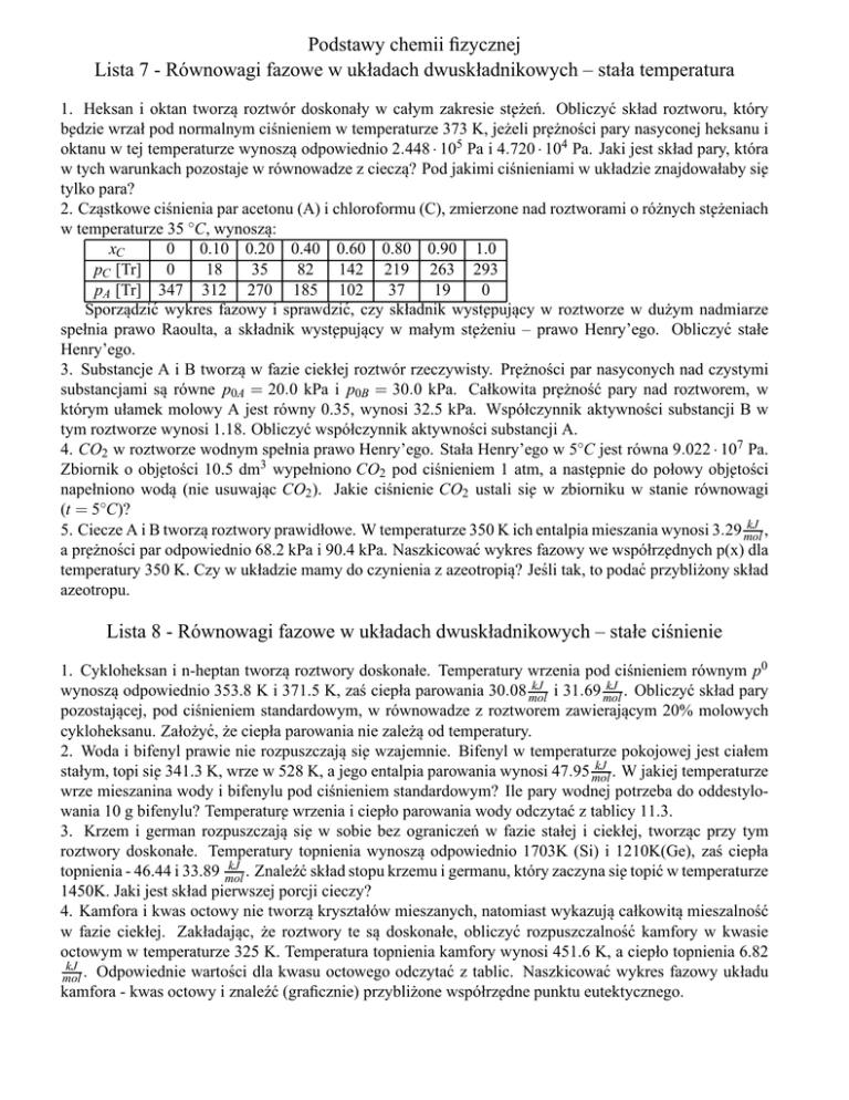 Podstawy chemii fizycznej Lista 7 - Równowagi fazowe w układach dwuskładnikowych – stała temperatura 1. Heksan i oktan tworza˛ roztwór doskonały w całym zakresie st˛eżeń. Obliczyć skład roztworu, który b˛edzie wrzał pod normalnym ciśnieniem w temperaturze 373 K, jeżeli pr˛eżności pary nasyconej heksanu i oktanu w tej temperaturze wynosza˛ odpowiednio 2.448 · 105 Pa i 4.720 · 104 Pa. Jaki jest skład pary, która w tych warunkach pozostaje w równowadze z ciecza? ˛ Pod jakimi ciśnieniami w układzie znajdowałaby si˛e tylko para? 2. Czastkowe ˛ ciśnienia par acetonu (A) i chloroformu (C), zmierzone nad roztworami o różnych st˛eżeniach w temperaturze 35 ◦C, wynosza: ˛ xC 0 0.10 0.20 0.40 0.60 0.80 0.90 1.0 pC [Tr] 0 18 35 82 142 219 263 293 pA [Tr] 347 312 270 185 102 37 19 0 Sporzadzić ˛ wykres fazowy i sprawdzić, czy składnik wyst˛epujacy ˛ w roztworze w dużym nadmiarze spełnia prawo Raoulta, a składnik wyst˛epujacy ˛ w małym st˛eżeniu – prawo Henry’ego. Obliczyć stałe Henry’ego. 3. Substancje A i B tworza˛ w fazie ciekłej roztwór rzeczywisty. Pr˛eżności par nasyconych nad czystymi substancjami sa˛ równe p0A = 20.0 kPa i p0B = 30.0 kPa. Całkowita pr˛eżność pary nad roztworem, w którym ułamek molowy A jest równy 0.35, wynosi 32.5 kPa. Współczynnik aktywności substancji B w tym roztworze wynosi 1.18. Obliczyć współczynnik aktywności substancji A. 4. CO2 w roztworze wodnym spełnia prawo Henry’ego. Stała Henry’ego w 5◦C jest równa 9.022 · 107 Pa. Zbiornik o obj˛etości 10.5 dm3 wypełniono CO2 pod ciśnieniem 1 atm, a nast˛epnie do połowy obj˛etości napełniono woda˛ (nie usuwajac ˛ CO2 ). Jakie ciśnienie CO2 ustali si˛e w zbiorniku w stanie równowagi (t = 5◦C)? kJ 5. Ciecze A i B tworza˛ roztwory prawidłowe. W temperaturze 350 K ich entalpia mieszania wynosi 3.29 mol , a pr˛eżności par odpowiednio 68.2 kPa i 90.4 kPa. Naszkicować wykres fazowy we współrz˛ednych p(x) dla temperatury 350 K. Czy w układzie mamy do czynienia z azeotropia? ˛ Jeśli tak, to podać przybliżony skład azeotropu. Lista 8 - Równowagi fazowe w układach dwuskładnikowych – stałe ciśnienie 1. Cykloheksan i n-heptan tworza˛ roztwory doskonałe. Temperatury wrzenia pod ciśnieniem równym p0 kJ kJ i 31.69 mol . Obliczyć skład pary wynosza˛ odpowiednio 353.8 K i 371.5 K, zaś ciepła parowania 30.08 mol pozostajacej, ˛ pod ciśnieniem standardowym, w równowadze z roztworem zawierajacym ˛ 20% molowych cykloheksanu. Założyć, że ciepła parowania nie zależa˛ od temperatury. 2. Woda i bifenyl prawie nie rozpuszczaja˛ si˛e wzajemnie. Bifenyl w temperaturze pokojowej jest ciałem kJ stałym, topi si˛e 341.3 K, wrze w 528 K, a jego entalpia parowania wynosi 47.95 mol . W jakiej temperaturze wrze mieszanina wody i bifenylu pod ciśnieniem standardowym? Ile pary wodnej potrzeba do oddestylowania 10 g bifenylu? Temperatur˛e wrzenia i ciepło parowania wody odczytać z tablicy 11.3. 3. Krzem i german rozpuszczaja˛ si˛e w sobie bez ograniczeń w fazie stałej i ciekłej, tworzac ˛ przy tym roztwory doskonałe. Temperatury topnienia wynosza˛ odpowiednio 1703K (Si) i 1210K(Ge), zaś ciepła kJ . Znaleźć skład stopu krzemu i germanu, który zaczyna si˛e topić w temperaturze topnienia - 46.44 i 33.89 mol 1450K. Jaki jest skład pierwszej porcji cieczy? 4. Kamfora i kwas octowy nie tworza˛ kryształów mieszanych, natomiast wykazuja˛ całkowita˛ mieszalność w fazie ciekłej. Zakładajac, ˛ że roztwory te sa˛ doskonałe, obliczyć rozpuszczalność kamfory w kwasie octowym w temperaturze 325 K. Temperatura topnienia kamfory wynosi 451.6 K, a ciepło topnienia 6.82 kJ mol . Odpowiednie wartości dla kwasu octowego odczytać z tablic. Naszkicować wykres fazowy układu kamfora - kwas octowy i znaleźć (graficznie) przybliżone współrz˛edne punktu eutektycznego. 5. Opisać wykresy fazowe (p=const). Przygotować si˛e do omawiania przebiegu ostygania lub ogrzewania układów o różnych składach. T X Lista 9 - Równowagi fazowe w układach dwuskładnikowych – ebuliometria, krioskopia, ciśnienie osmotyczne 1. Benzen i antracen nie tworza˛ kryształów mieszanych, zaś ich roztwór można w przybliżeniu uważać za dokonały. Obliczyć, za pomoca˛ równania van Laara - Hildebranda oraz wzorów ebuliometrycznego i krioskopowego, temperatury wrzenia i krzepni˛ecia roztworów antracenu w benzenie, gdy ułamek molowy antracenu wynosi 0.001 i 0.065. Pod jakimi ciśnieniami roztwory te pozostawałyby w równowadze osmotycznej z czystym benzenem, znajdujacym ˛ si˛e pod ciśnieniem standardowym, w temperaturze 300 K? Dla kJ 0 0 =9.837 kJ . Założyć, że ułamek molowy benzenu Twrz=353.25 K, ∆H par =30.76 mol , Ttop =278.68 K, ∆Htop mol antracenu w parze jest zaniedbywalnie mały. 2. W 98.37 g czystej wody rozpuszczono 0.2879 g mieszaniny glukozy i sacharozy. Otrzymany roztwór krzepł w temperaturze −0.021◦C. Obliczyć skład mieszaniny cukrów. Stała krioskopowa wody wynosi 1.86 K·kg mol . 3. Obliczyć temperatur˛e wrzenia zupy zawierajacej ˛ 1 g soli kuchennej w 1 dm3 . Ciepło parowania wody g kJ wynosi 40.66 mol , a masy molowe odpowiednio MH2 O =18.015 i MNaCl =58.443 mol . Przyjać, ˛ że g˛estość zupy wynosi 1 cmg 3 , współczynnik osmotyczny jest równy 1, a wpływ pozostałych zwiazków ˛ zawartych w zupie na temperatur˛e wrzenia - zaniedbywalny. 4. Obliczyć mas˛e molowa˛ stałego zwiazku ˛ organicznego, który rozpuszczony w ilości 5.47 g w 100 g benzenu podwyższa jego temperatur˛e wrzenia o 1.100◦C. Znaleźć wzgl˛edne obniżenie pr˛eżności pary benzenu nad tym roztworem oraz jego ciśnienie osmotyczne w temp. 293 K. G˛estość roztworu w tej temperaturze wynosi 0.8989 cmg 3 , pr˛eżność pary benzenu nad czystym benzenem 6.126 kPa. Ciepło parowania benzenu kJ w temperaturze wrzenia (353.2 K) wynosi 30.76 mol . g ∆p 5 Odp: M = 131.0 mol